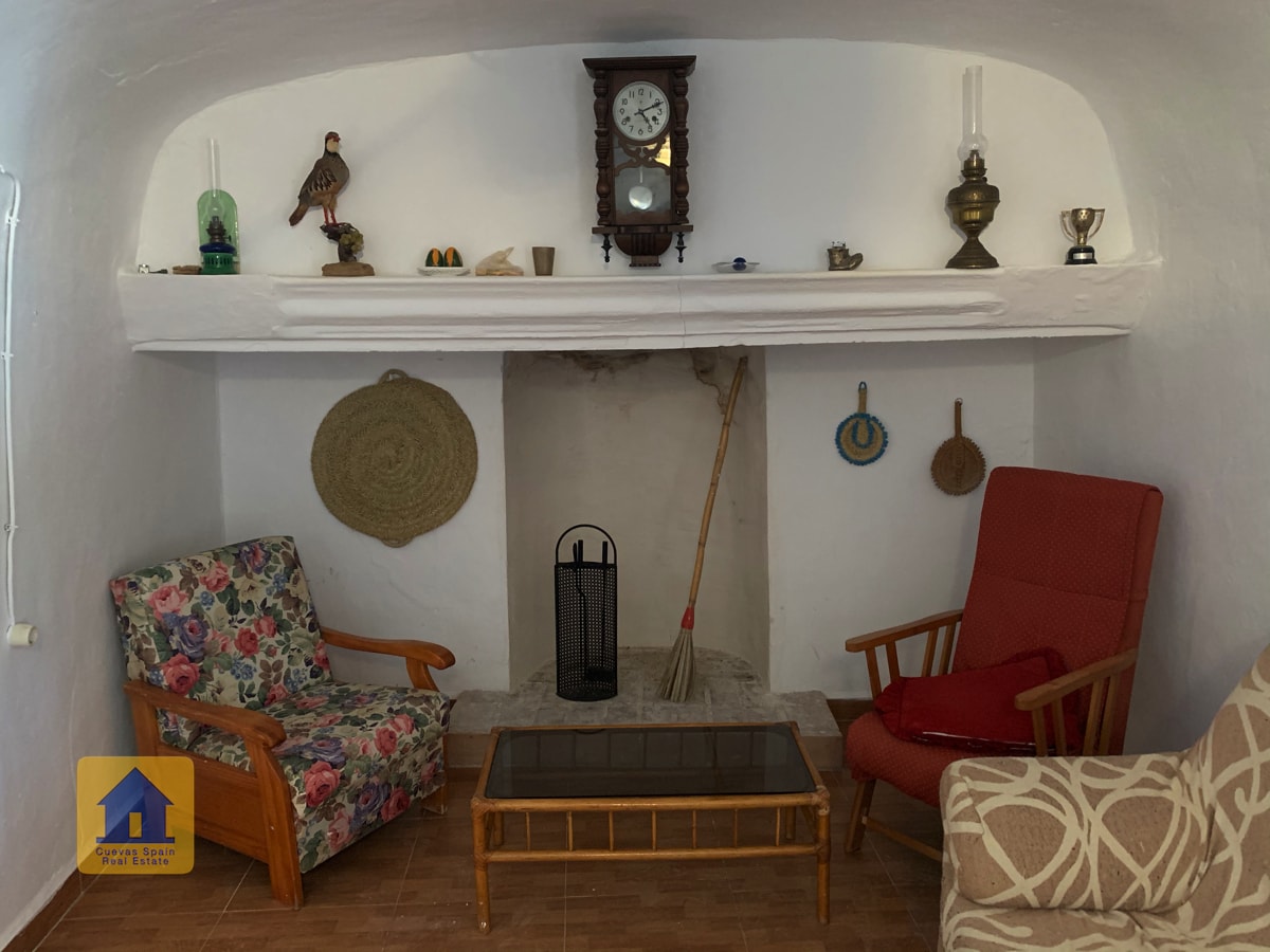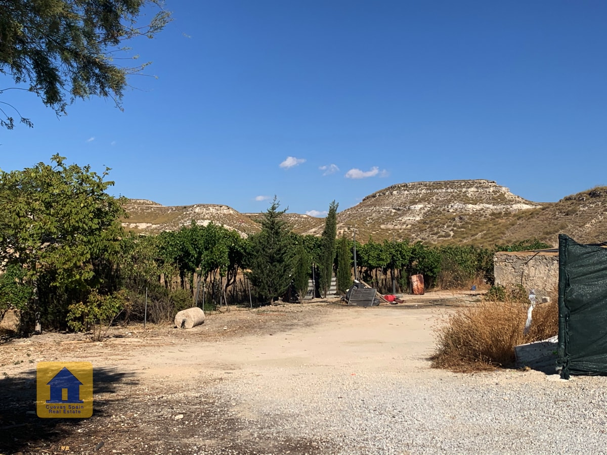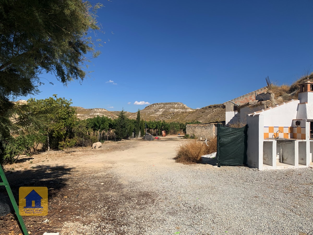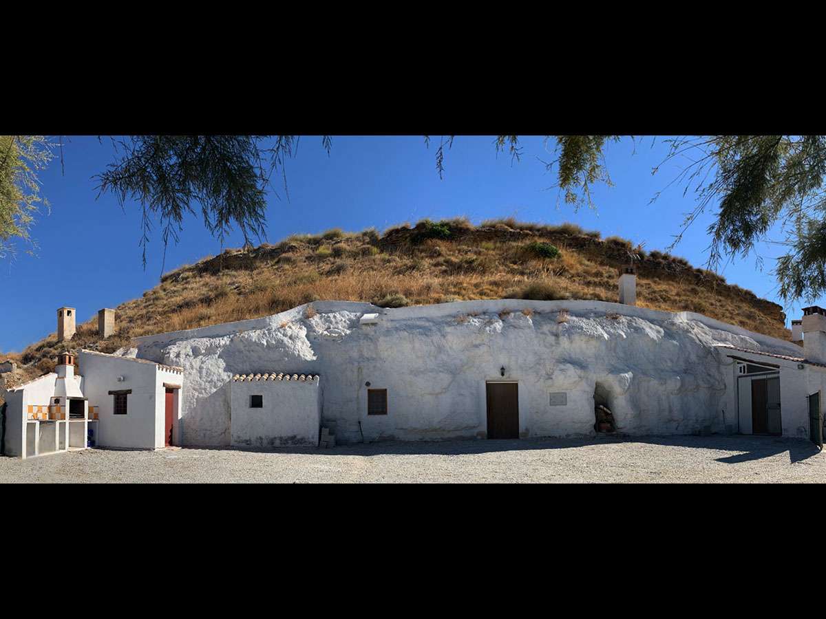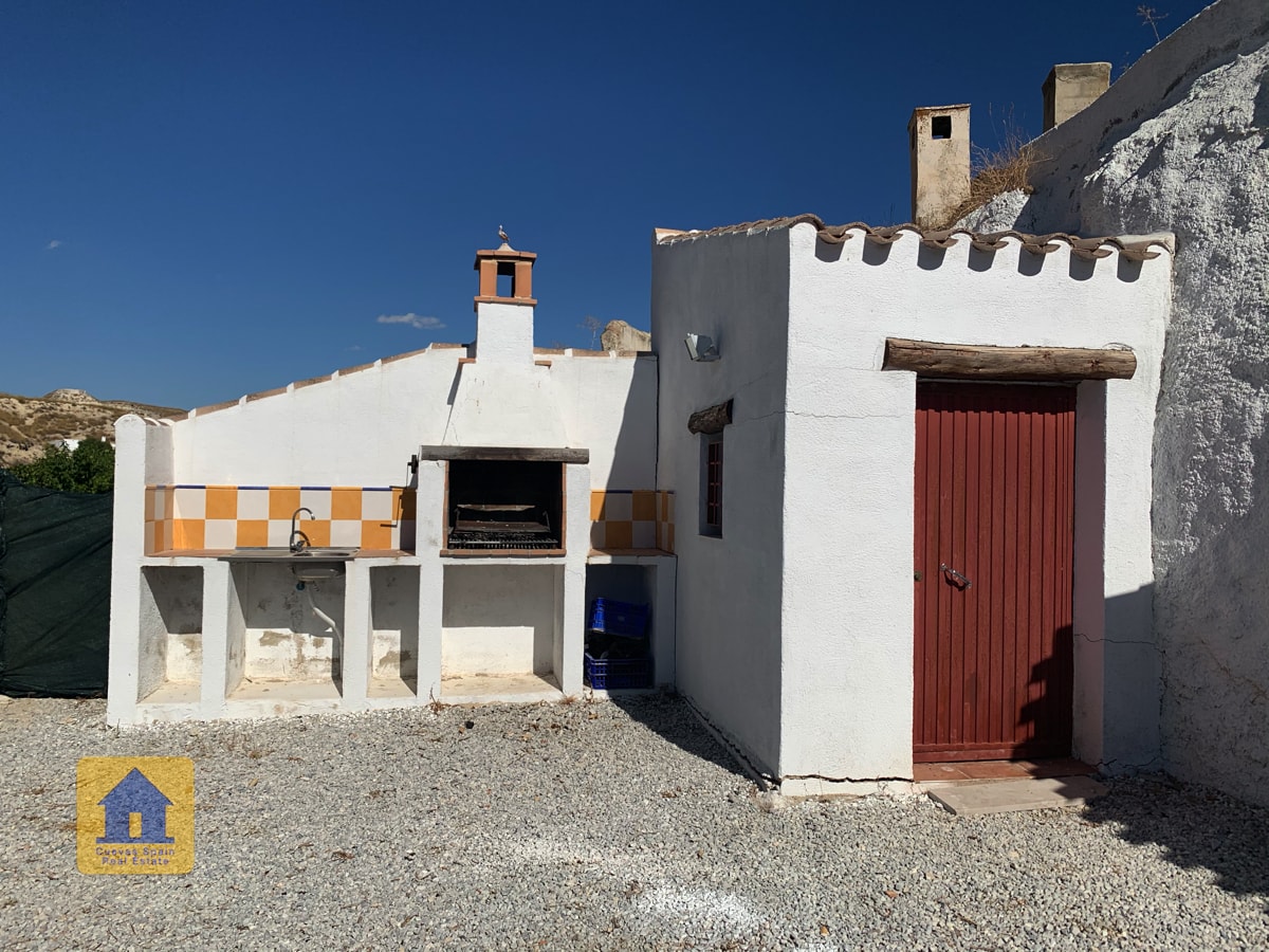 This is a traditional Spanish cave house situated in the beautiful countryside around Galera. The cave is large, well built but needs modernizing. Inside the cave is a living room with a fireplace, kitchen, 5 bedrooms, 1 bathroom, and 3 partially reformed rooms for storage or pantry. This is mostly a pure cave with a large summer family room/kitchen outbuild that could also be a workshop or garage. The outbuild is insulated so it stays cool in summer, with a chimney and log burner for colder weather. The expansive patio offers great views of the surrounding mountains. The patio has a built in BBQ and ample space for parking and/or a swimming pool. Off the patio is a shed with a water reserve storage container and pump with a manometer to regulate the household water pressure. Across the dirt track in front of the patio is a shaded sitting area with room for parking or a garden. The property has been used as a holiday home for many years so it might benefit from layout adjustments and a 2nd bathroom for year round living. The property could also be split in two, with one part as a holiday let for an income. A track to access the property is to be manifested as per the plan from town hall. Galera village is about 5 min drive with amenities, restaurants, wine & tapas. The town of Huéscar is a 15 min drive, with 24 hr health center. If you are looking for a quiet area of natural beauty, Riego Nuevo is definitely worth seeing.