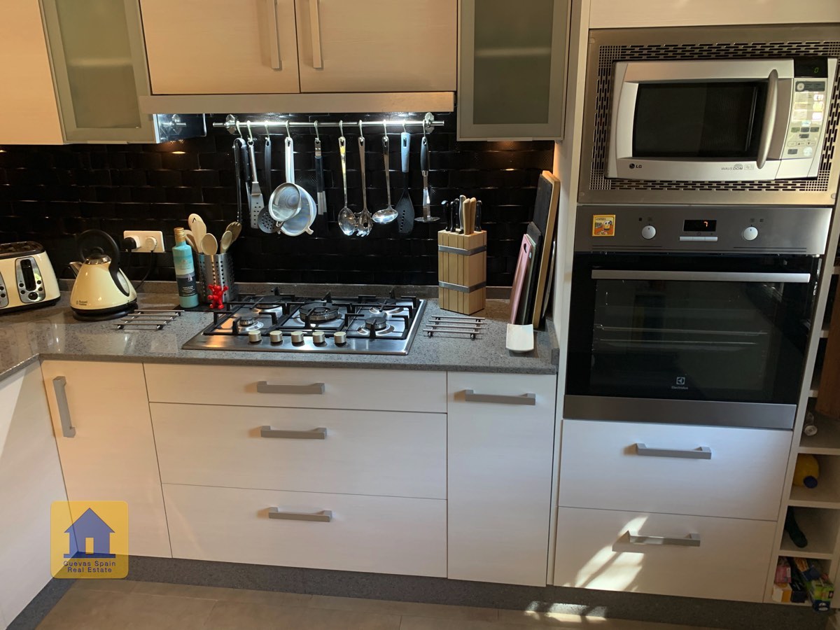 À droite de l'entrée, la cuisine est ultramoderne et entièrement intégrée avec un lave-vaisselle Bosch, un réfrigérateur et un congélateur séparés, un four électrique et une plaque de cuisson au gaz.