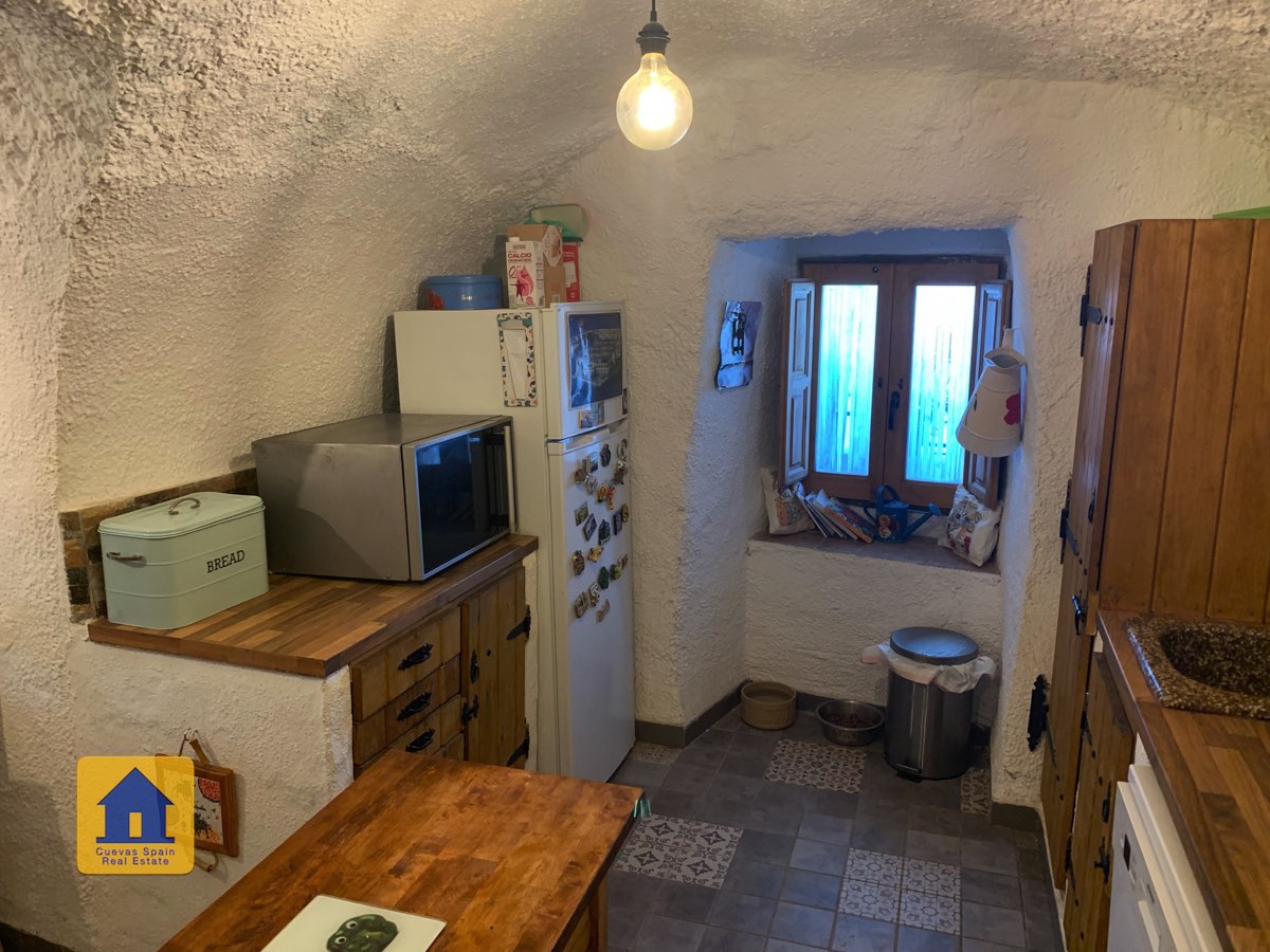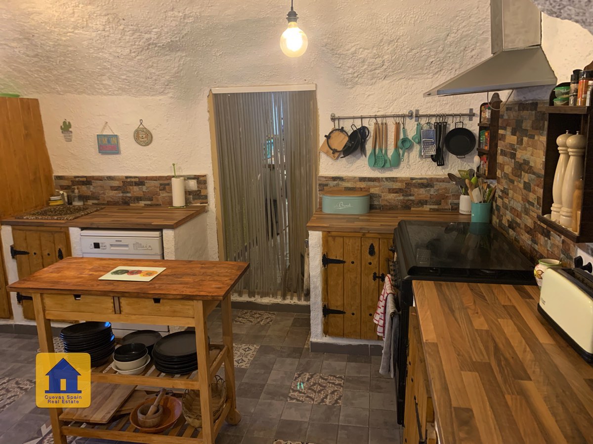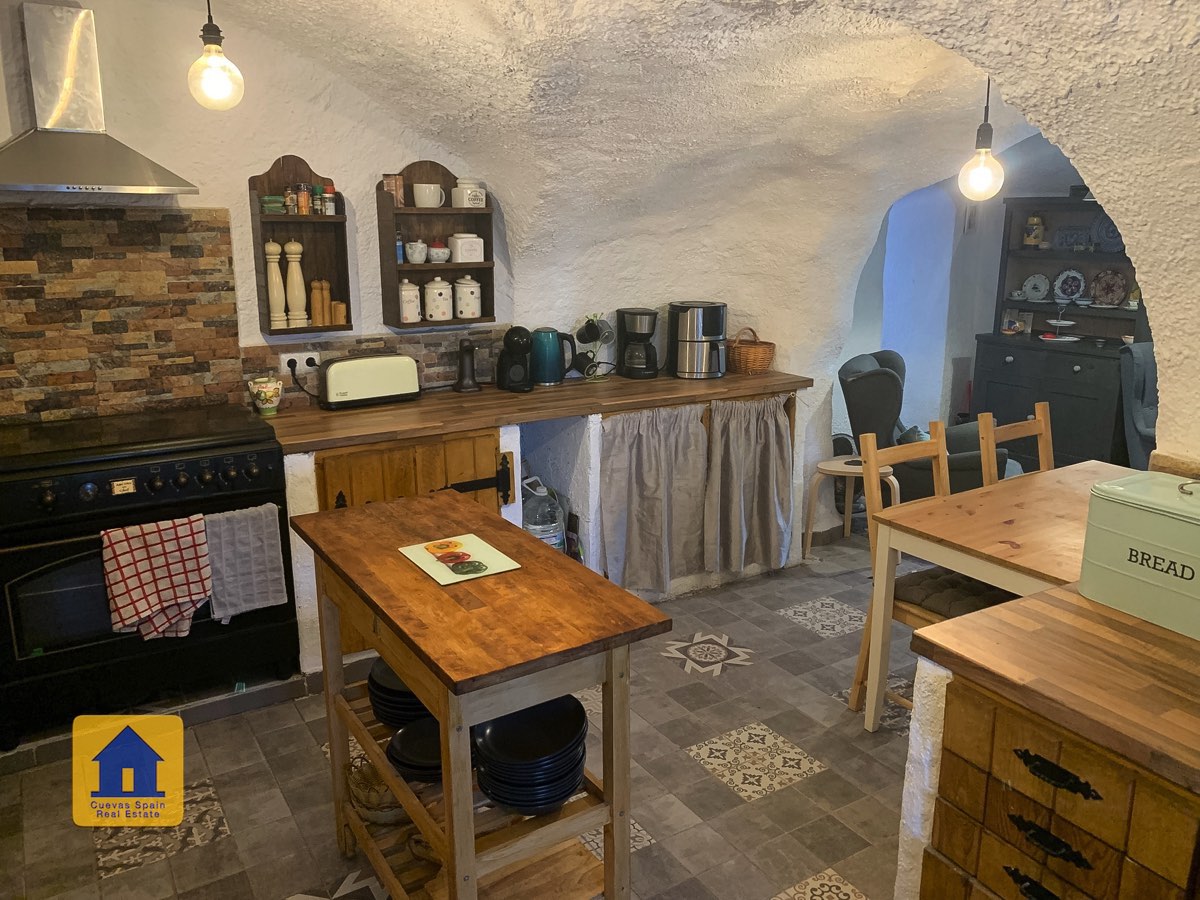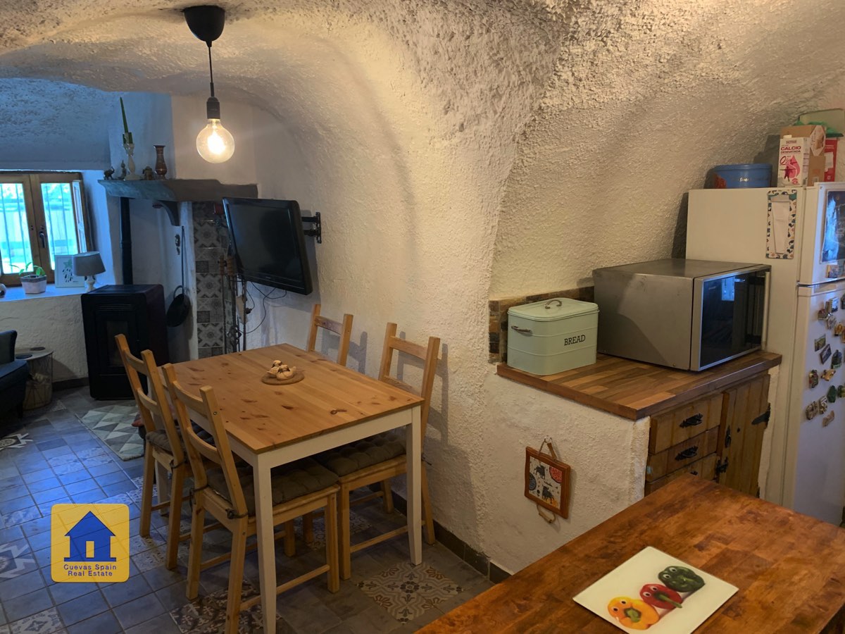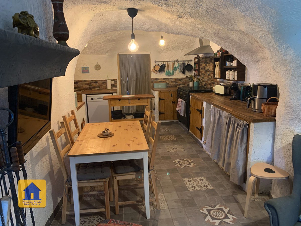 La maison principale : En entrant par la porte d'entrée, on accède à un grand couloir qui mène à gauche à un petit salon avec un poêle à granulés et le four à pain d'origine, puis à travers une grande arche à une cuisine rustique équipée avec coin repas. La plomberie est installée pour un lave-vaisselle. Une porte de la cuisine mène à une grande buanderie et à un petit vestiaire avec toilettes et lavabo. Une porte arrière mène à la véranda avec une cuisine d'été et un barbecue en briques, à l'arrière de la grotte. Cet endroit offre une vue magnifique sur la campagne et les montagnes de la Sierra de Cazorla, Segura et Las Villas.