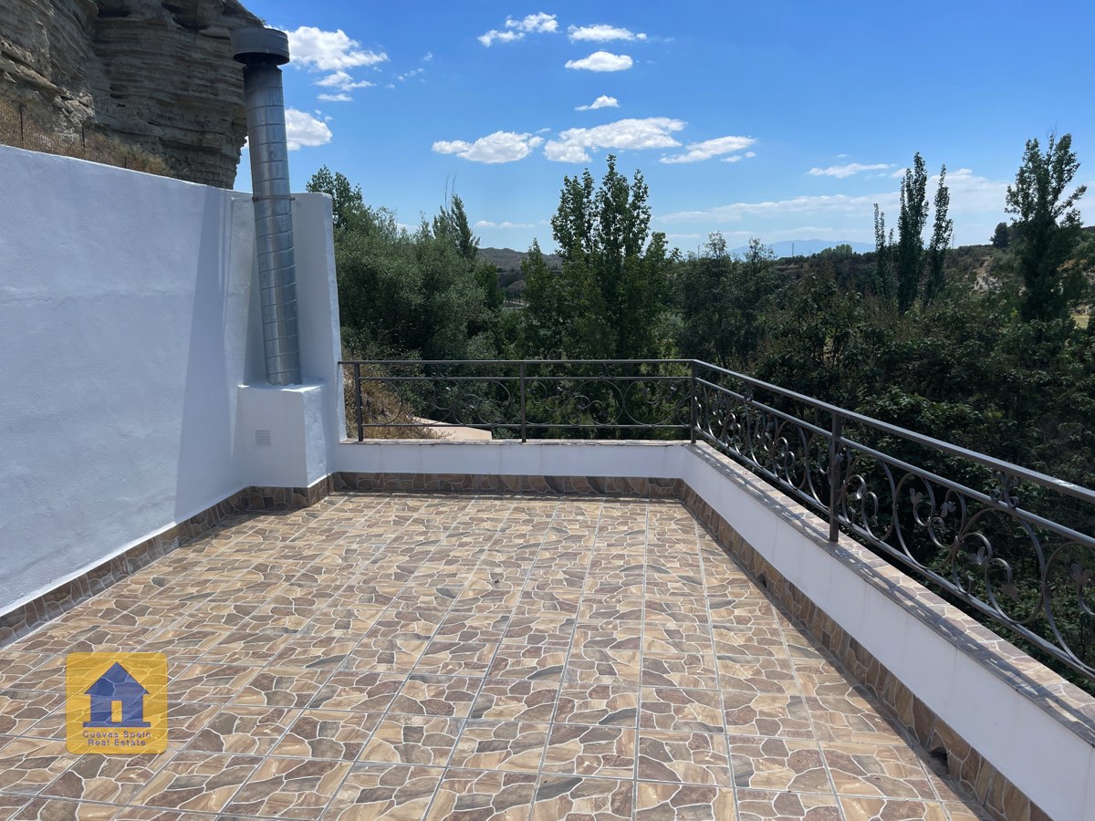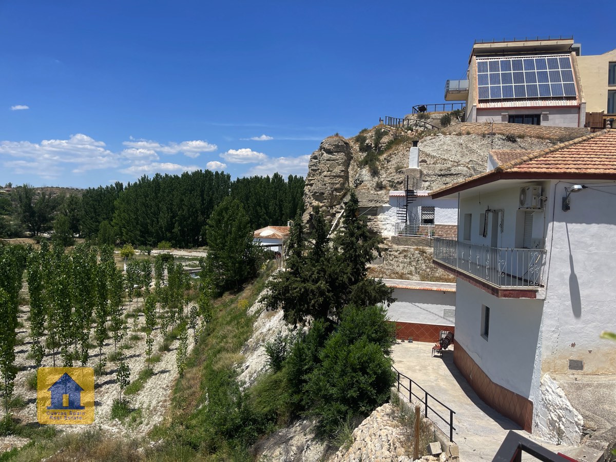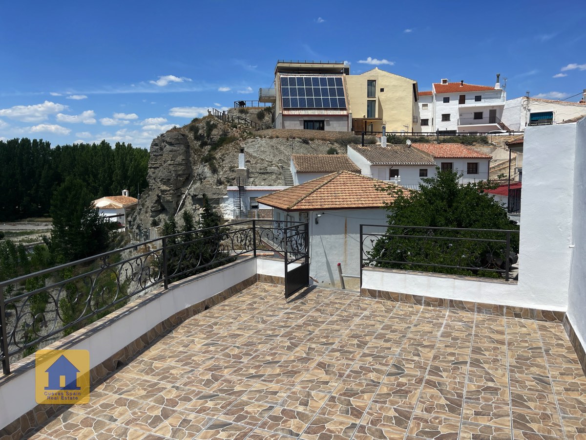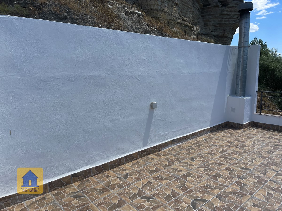 Esta propiedad se encuentra al final de una encantadora plaza peatonal, con bancos para relajarse y disfrutar de las vistas. Frente a la cueva hay un patio. Arriba hay una gran terraza privada con vistas. El acceso a esta terraza se realiza actualmente mediante una escalera, aunque se pueden construir escaleras. El aparcamiento está en la calle.