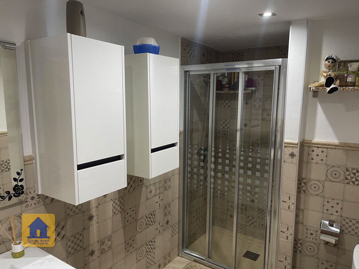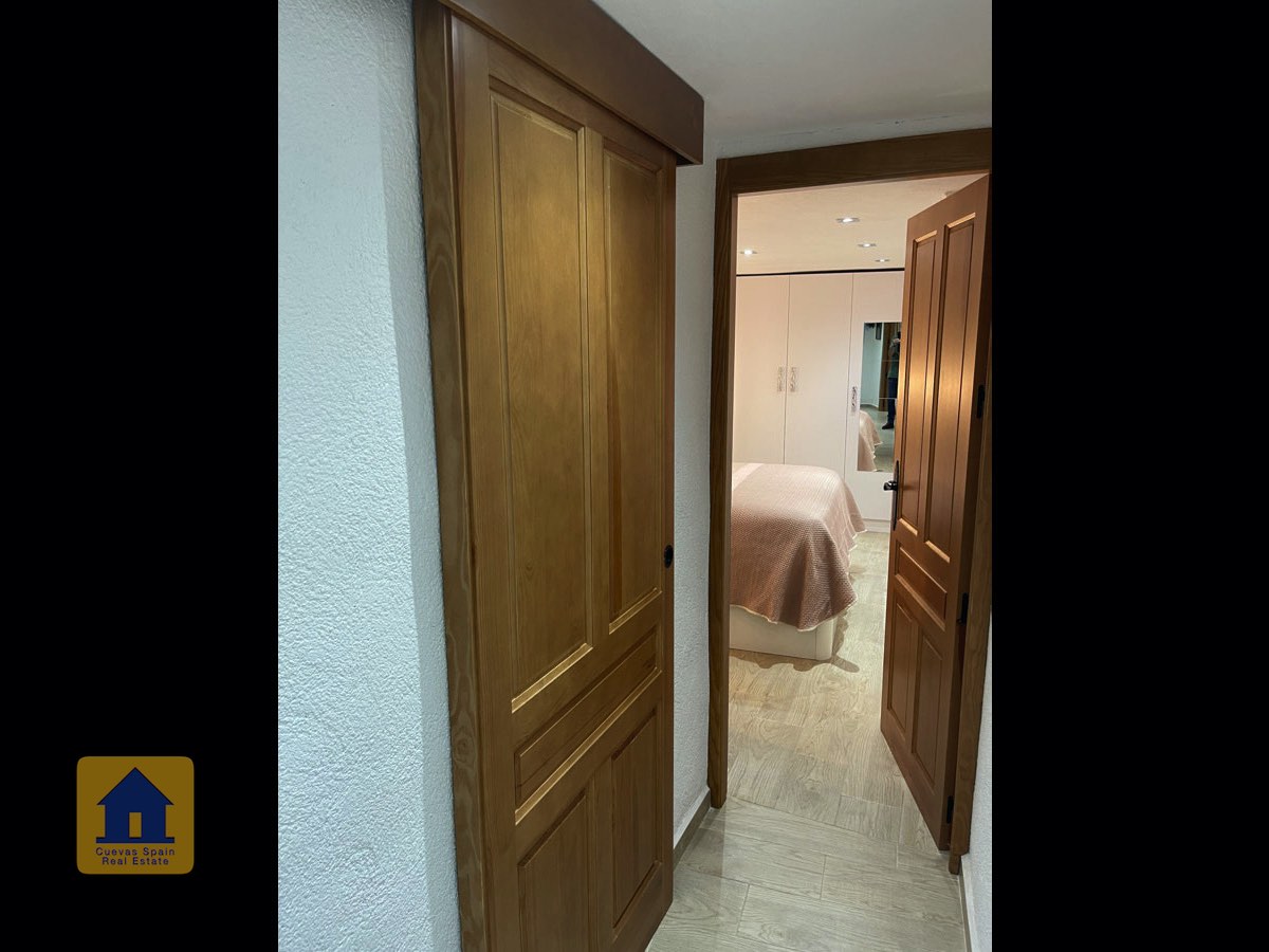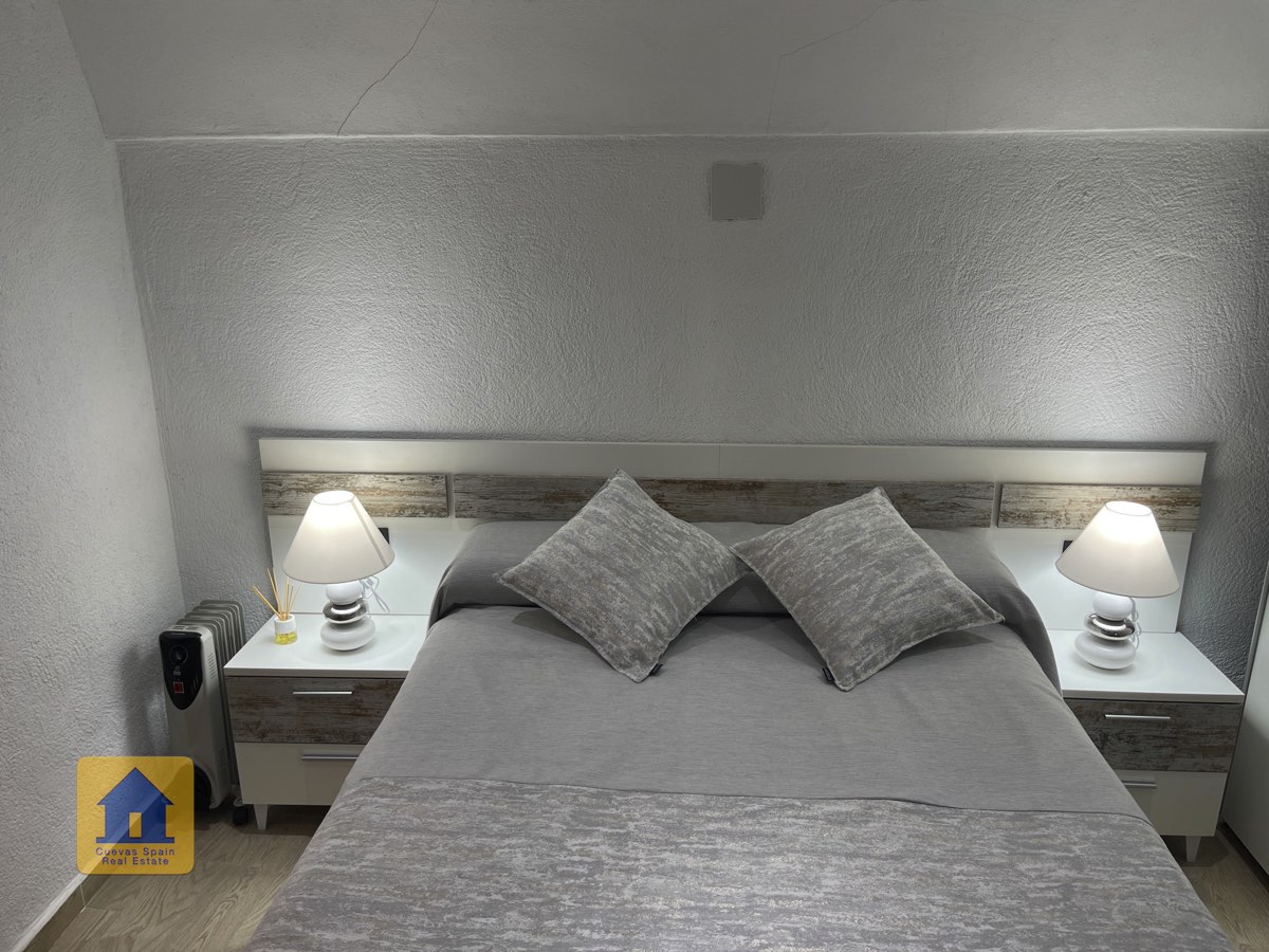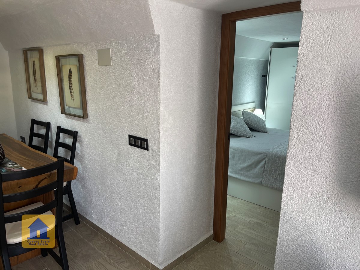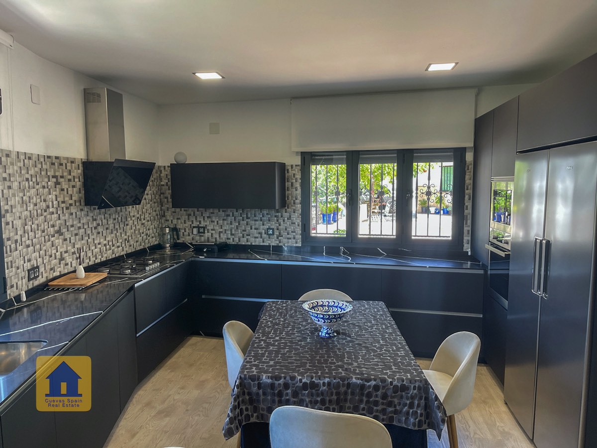 En toda la cueva y toda la zona de construcción se ha cuidado cuidadosamente la iluminación instalada. Las ventanas de la cocina y puertas de vidrio que dan a dos de las terrazas también dejan entrar mucha luz natural. Los suelos son de baldosas de estilo madera clara y los muebles combinan a la perfección con la decoración. (La mesa de comedor de madera no está incluida en la venta).