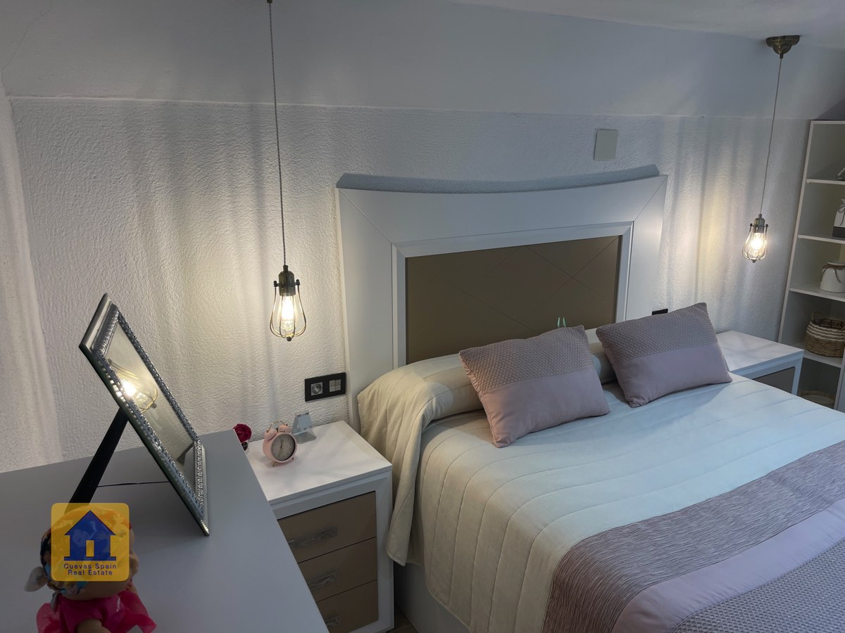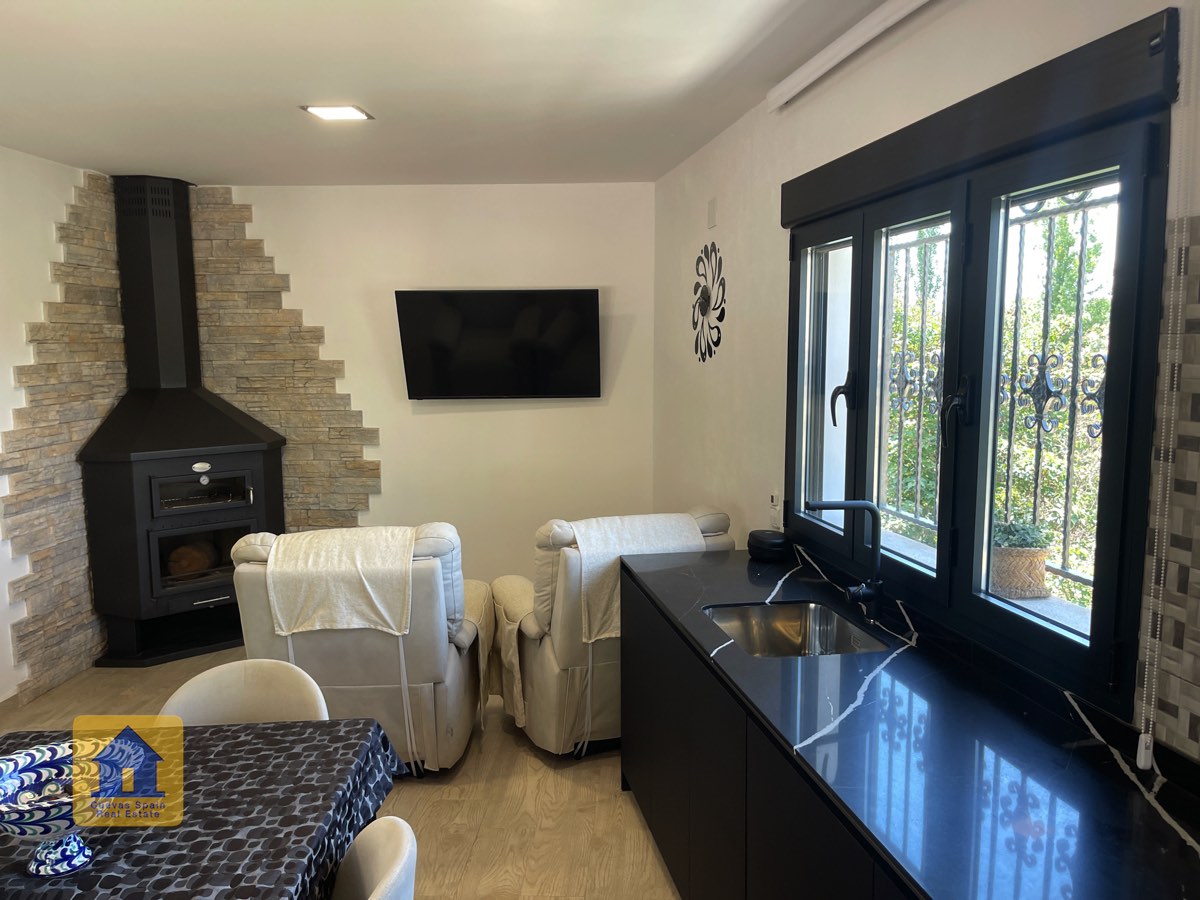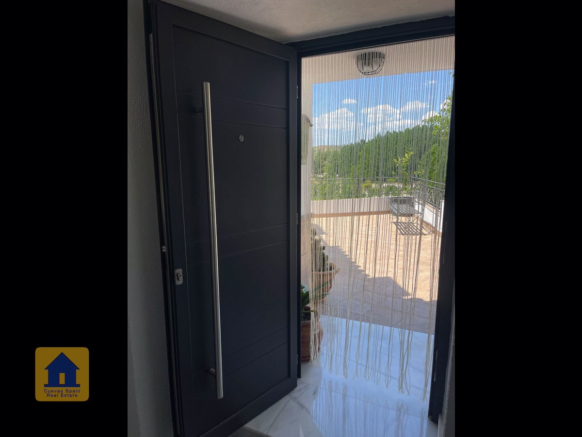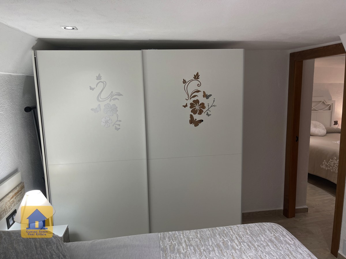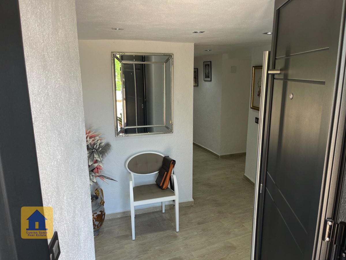 En toda la cueva y toda la zona de construcción se ha cuidado cuidadosamente la iluminación instalada. Las ventanas de la cocina y puertas de vidrio que dan a dos de las terrazas también dejan entrar mucha luz natural. Los suelos son de baldosas de estilo madera clara y los muebles combinan a la perfección con la decoración. (La mesa de comedor de madera no está incluida en la venta).