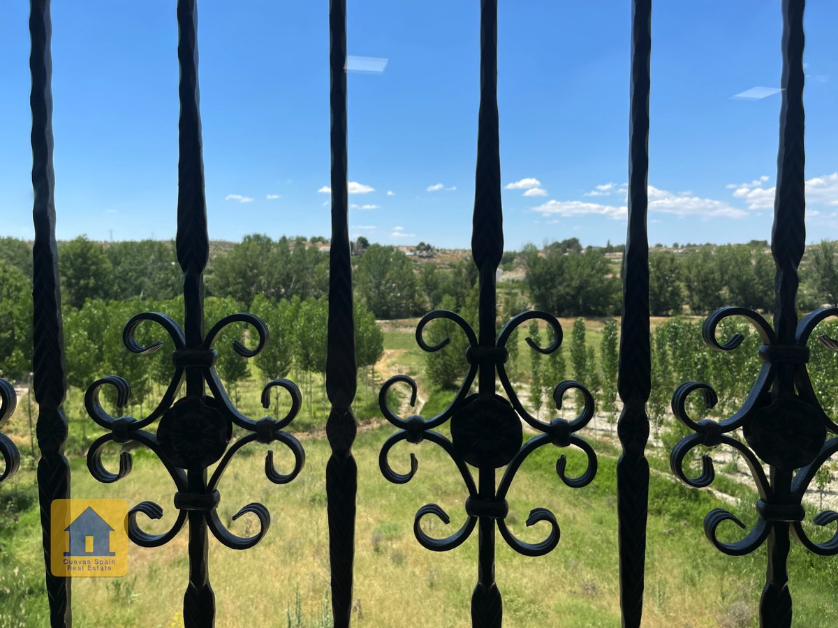 Justo enfrente de la entrada se encuentra el amplio salón-comedor con una encantadora terraza privada con zona de estar y magníficas vistas. Cada detalle de la terraza ha sido pensado al detalle, desde las puertas corredizas de cristal con cortinas plisadas hasta las barandillas de hierro decorativas y el toldo plegable, que proporciona sol o sombra.