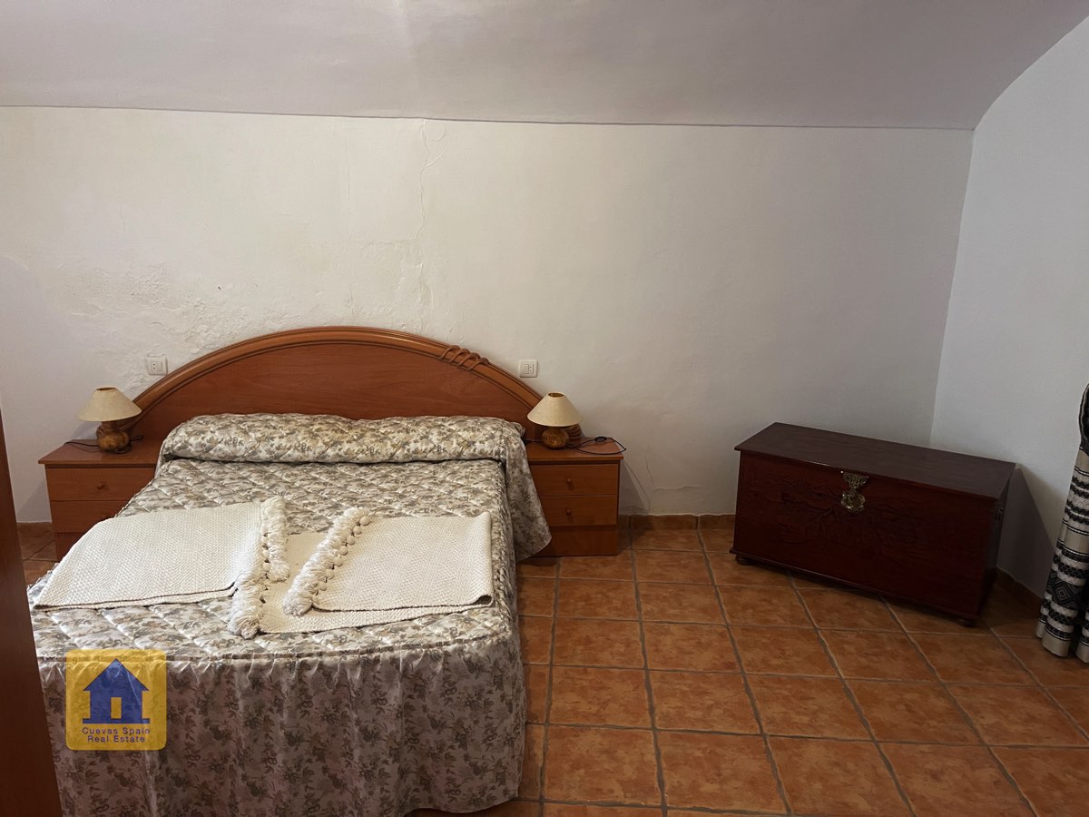 La cueva central es la principal. Cuenta con una cocina americana con salón con chimenea, dos pequeños salones (uno con chimenea) y dos baños completos (uno con bañera y otro con ducha). Hay 4 habitaciones dobles y, en la planta superior, una habitación tipo loft, luminosa y versátil, perfecta para adaptar como estudio o zona de ocio.
