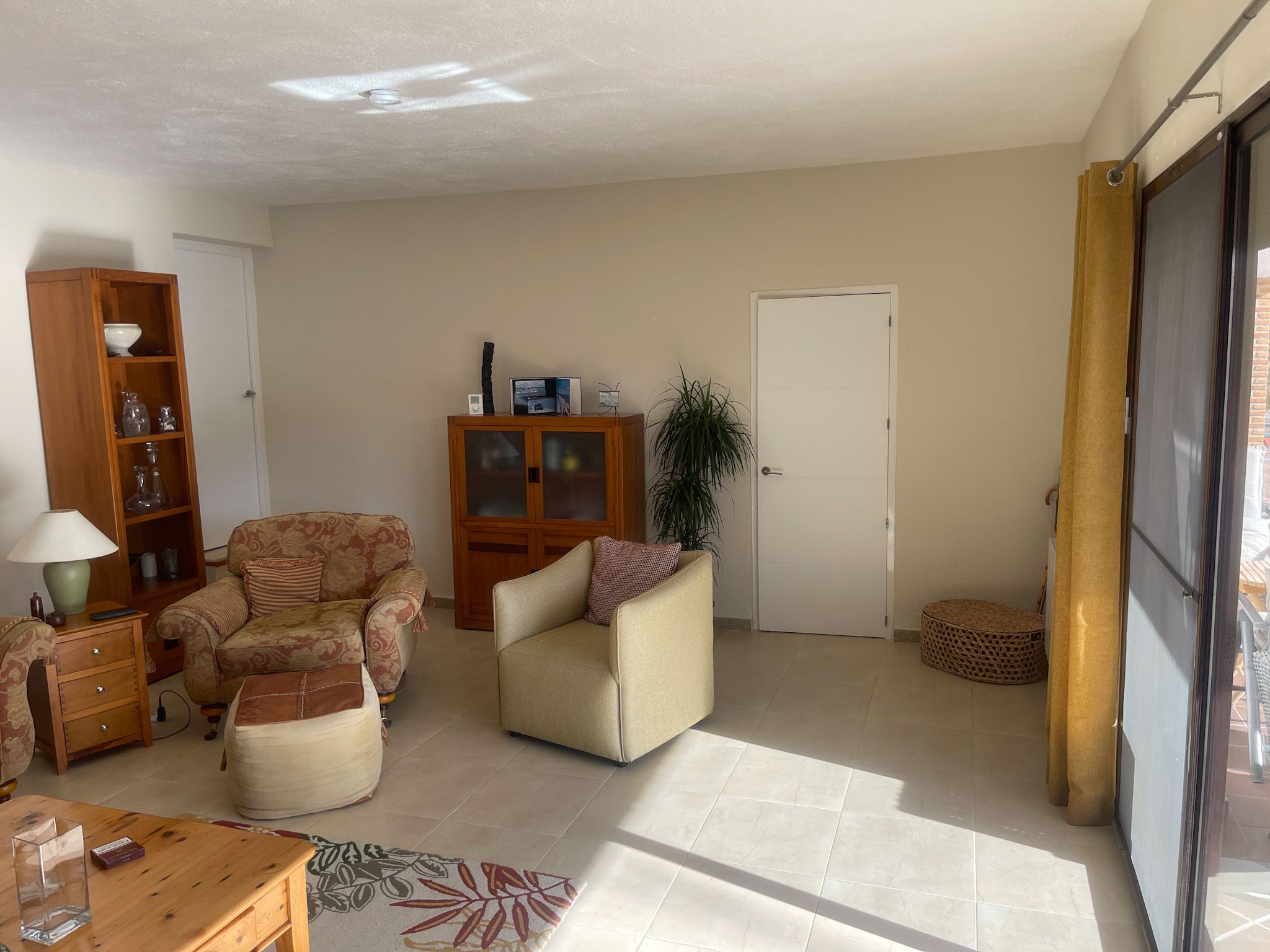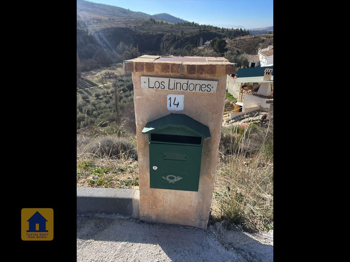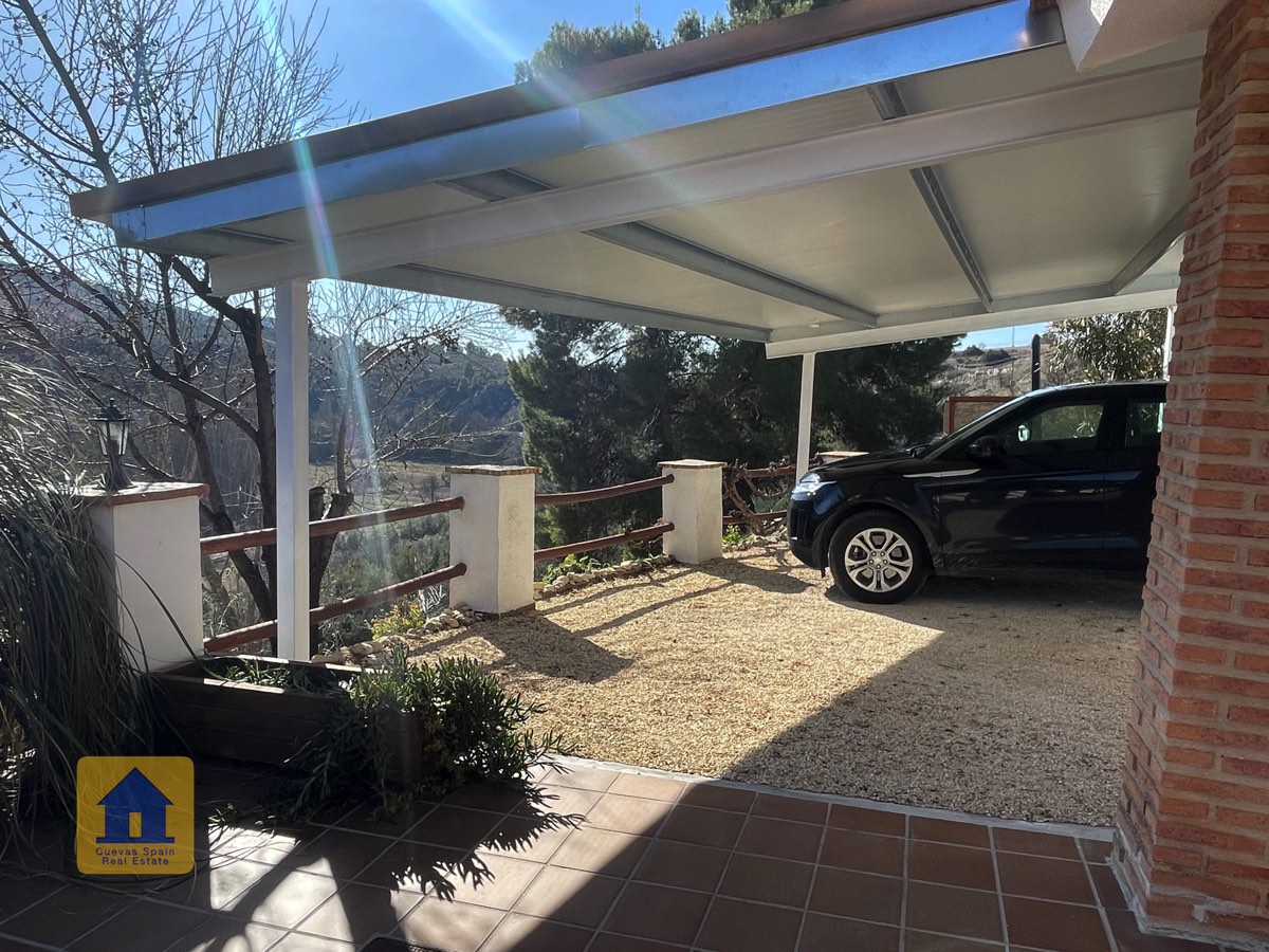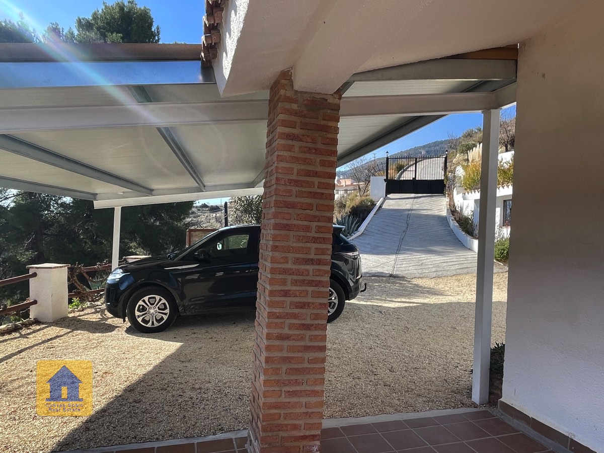 Juste à l’extérieur du portail d’entrée (mais sur la propriété), se trouve une place de parking privée, à côté d’un petit chemin bordé d’arbres fruitiers irrigués qui passe derrière la maison. On aperçoit le mont La Sagra au loin.