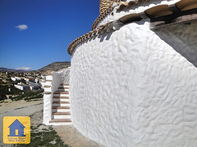 En face de la grotte se trouve un espace ensoleillé avec des vues merveilleuses. Il s'agit d'un terrain public utilisé pour le stationnement et peut également être un endroit sympathique pour apprécier le coucher du soleil. A l'extérieur se trouve un escalier qui mène au terrain situé au-dessus de la grotte. En montant l'escalier, vous trouverez un petit siège confortable taillé dans la roche. Au-dessus de la grotte, vous avez une vue imprenable sur Huéscar et les montagnes. Cela pourrait faire une charmante terrasse sur le toit. L'eau et l'électricité sont connectées. Internet peut être connecté. Cette grotte est en excellent état, très bien construite et bien entretenue. Elle a été récemment remise à neuf et vous pouvez y vivre immédiatement.