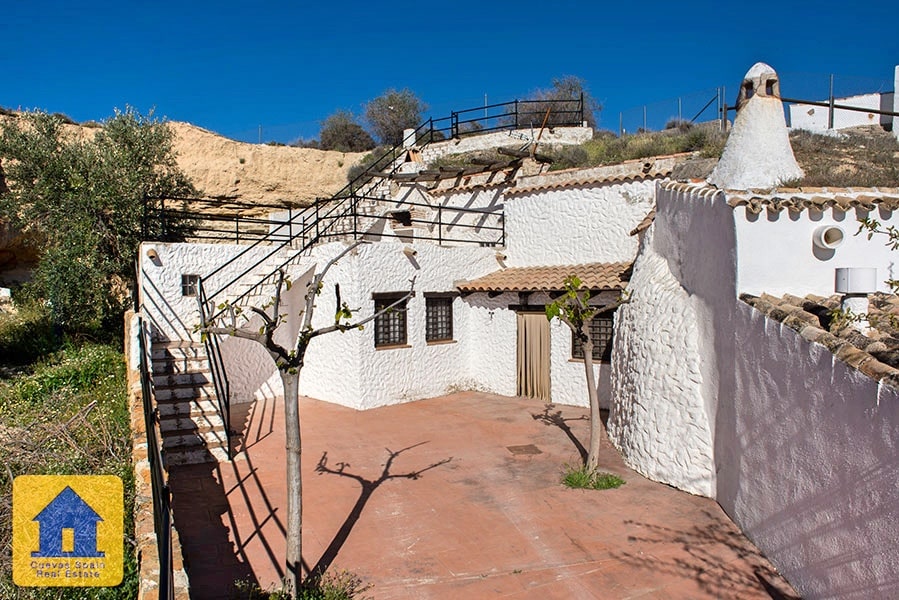 Belle maison troglodyte authentique en très bon état, entièrement meublée, prête à emménager. Il y a un joli patio privé et une terrasse à l'étage. Situation calme dans une impasse. A côté se trouve un terrain ouvert et herbeux avec des arbres, qui peut être négocié dans le prix d'achat, pour un jardin, un garage et / ou une piscine. Boutiques, restaurants et tapas accessibles à pied ou à 5 minutes en voiture.