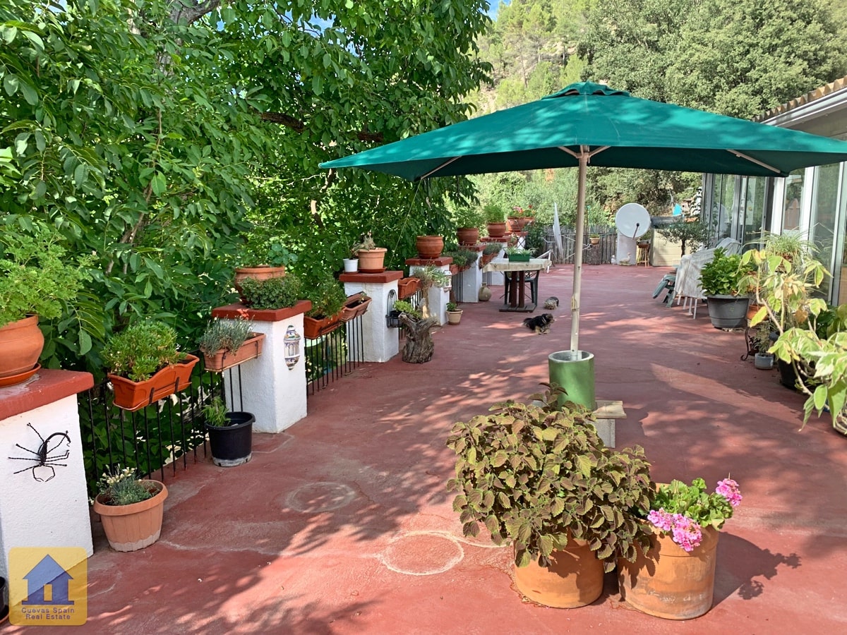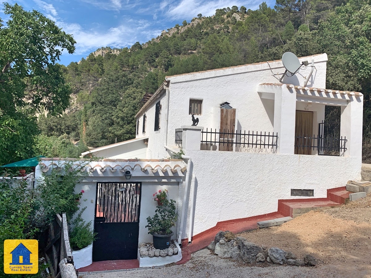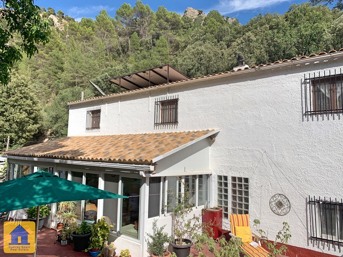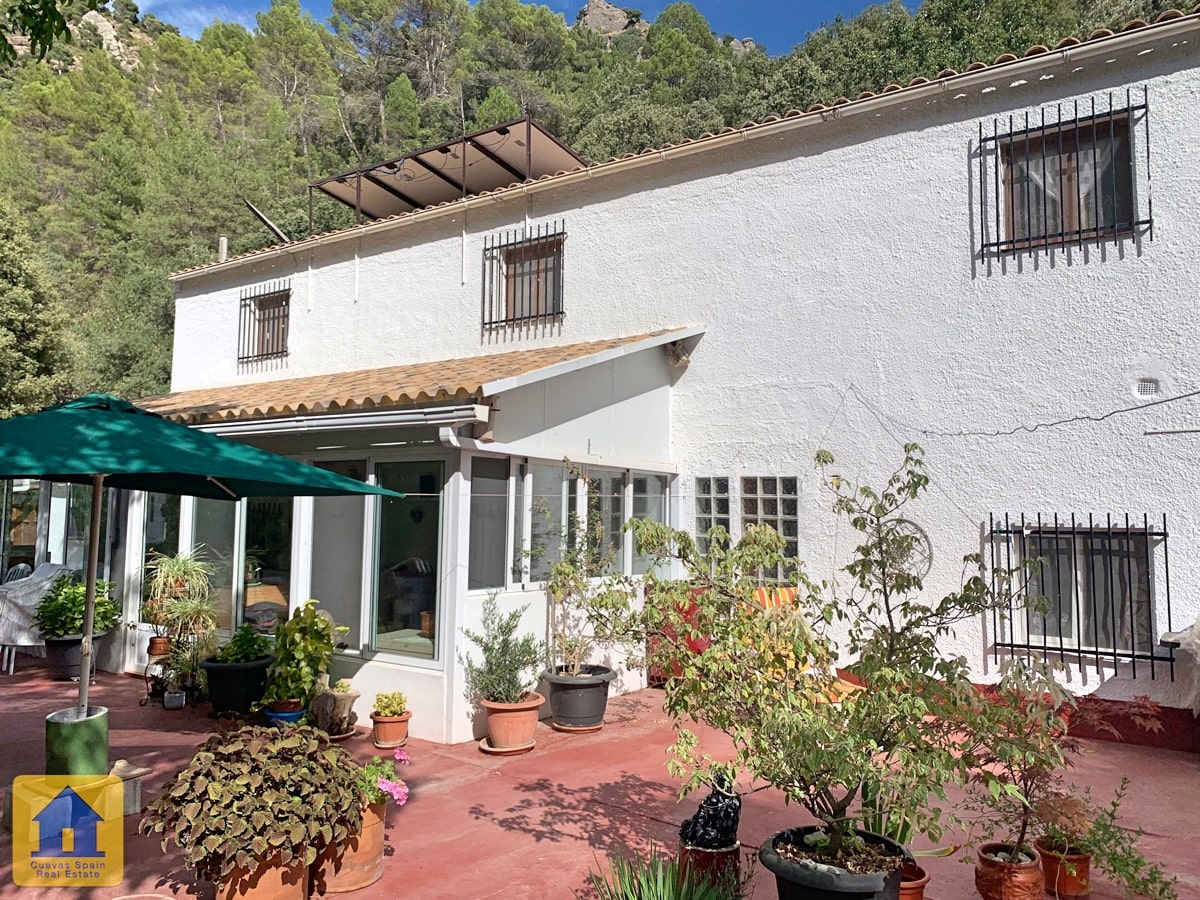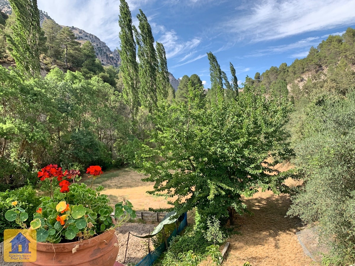 Esta villa es un hallazgo raro, ubicado en las alturas del Parque Natural de Castril. Solo hay un puñado de propiedades residenciales en el parque ya que no se puede construir ninguna nueva allí. La propiedad se encuentra en aproximadamente una media hectárea de tierra montañosa, justo al lado del camino rural, con el río que fluye debajo. Hay espacio de estacionamiento privado para varios coches en la entrada. Entras por una puerta de jardín y entras en un vasto patio-terraza con plantas, flores y hermosos objetos de decoración. Hay un invernadero con vistas a las montañas de los alrededores y mucha luz. Entras a la casa a través de la cocina, o puedes bajar a un vasto jardín con muchas variedades de árboles frutales completamente desarrollados, y escuchas el río que pasa y los pájaros. Hay una sección de jardín vegetariano, cercada para protegerla de los animales. Todo el paisaje es muy verde y puede nevar en invierno.