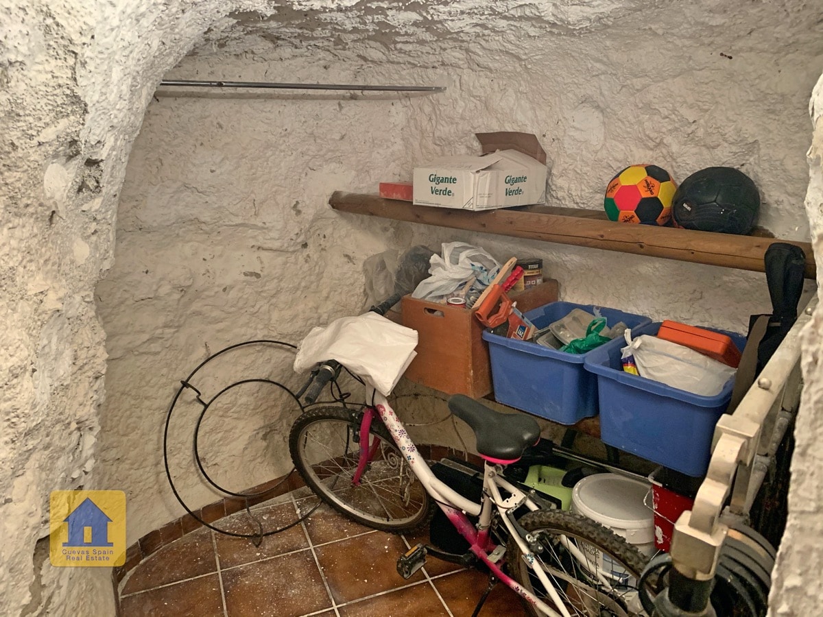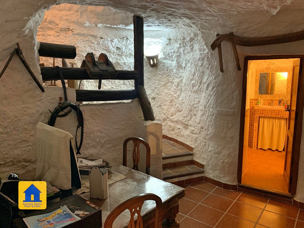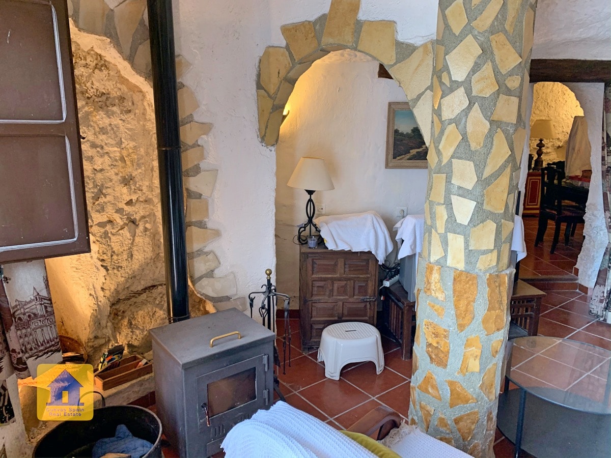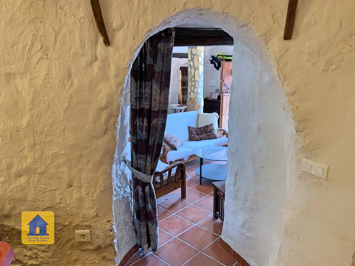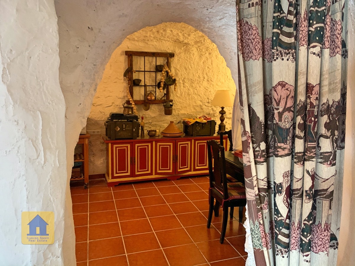 Beautiful, quirky two-storey cave situated on the heights of Galera village. The property has 3-4 bedrooms and 2 bathrooms. The main floor has a central living room with wood stove that leads off in four directions: to the large kitchen; spacious master bedroom and bathroom; hall area which leads to a bathroom and to stairs to the upper floor; two ensuite front rooms that could be an office/bedroom, storage or playroom. The upper floor has 2 bedrooms, one with a Juliette balcony and views of the hills of Galera. The property has been repainted inside and out so it is in excellent condition and ready to move in. There is a nice, gated front patio with views. The patio could accommodate a bbq and sitting area or could be used for parking. Across from the cave is additional space with great views for a garden terrace or parking. This property is in a quiet location of Galera with very little passage. The village center and amenities are a 10 min walk.
