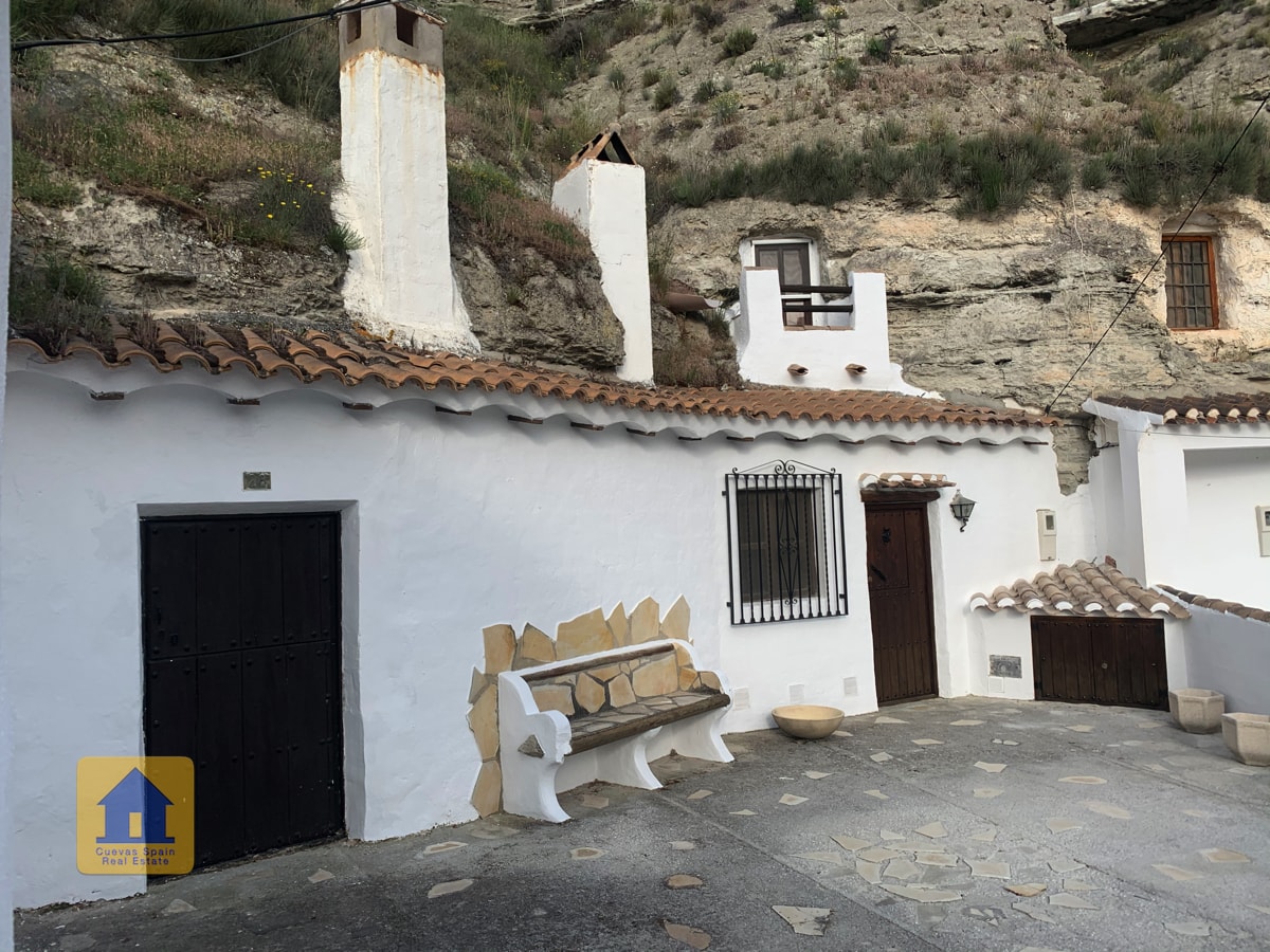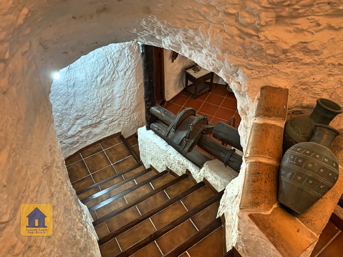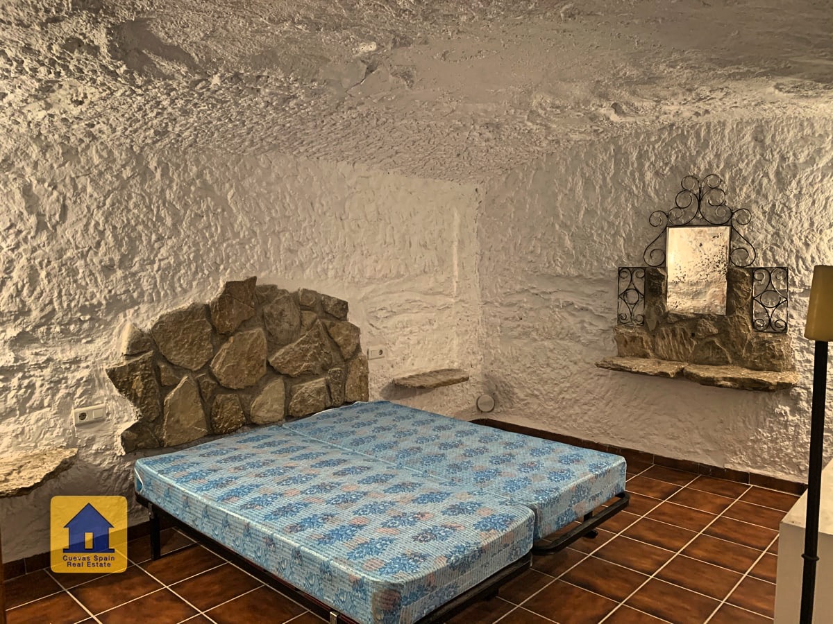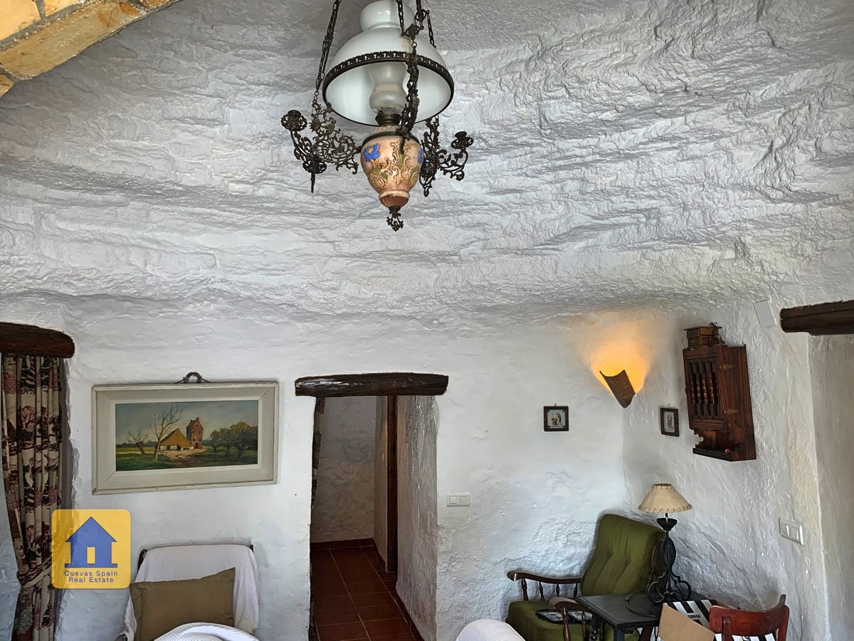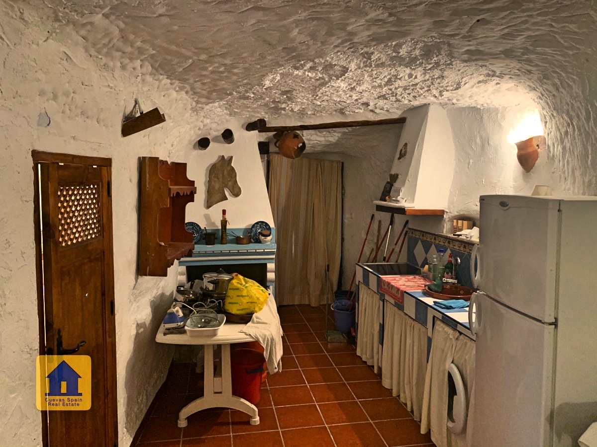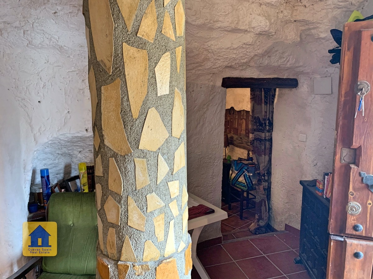 Beautiful, quirky two-storey cave situated on the heights of Galera village. The property has 3-4 bedrooms and 2 bathrooms. The main floor has a central living room with wood stove that leads off in four directions: to the large kitchen; spacious master bedroom and bathroom; hall area which leads to a bathroom and to stairs to the upper floor; two ensuite front rooms that could be an office/bedroom, storage or playroom. The upper floor has 2 bedrooms, one with a Juliette balcony and views of the hills of Galera. The property has been repainted inside and out so it is in excellent condition and ready to move in. There is a nice, gated front patio with views. The patio could accommodate a bbq and sitting area or could be used for parking. Across from the cave is additional space with great views for a garden terrace or parking. This property is in a quiet location of Galera with very little passage. The village center and amenities are a 10 min walk.