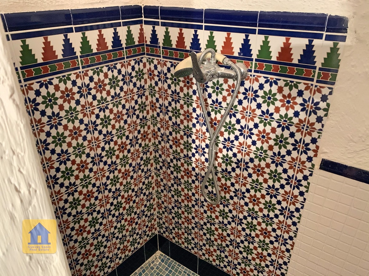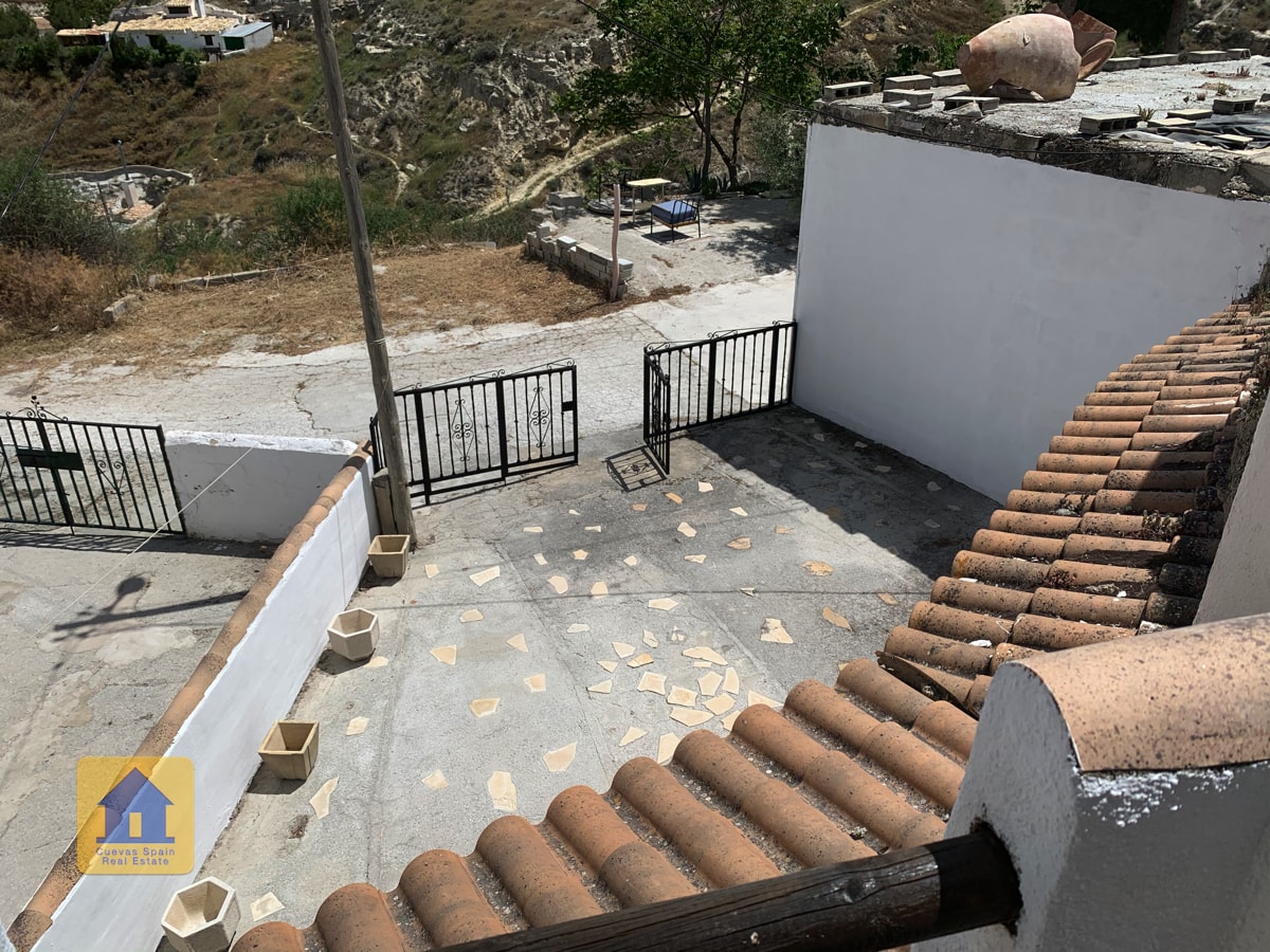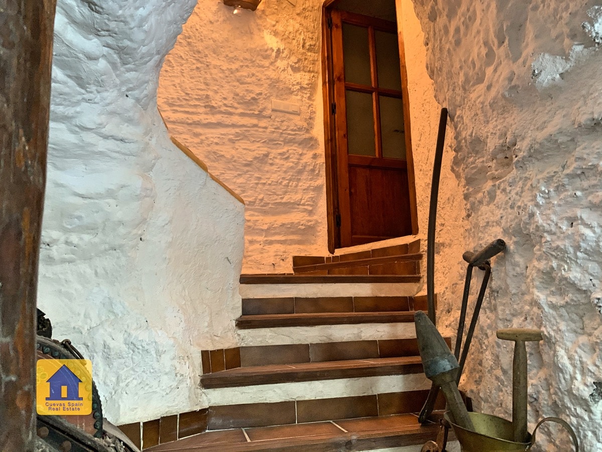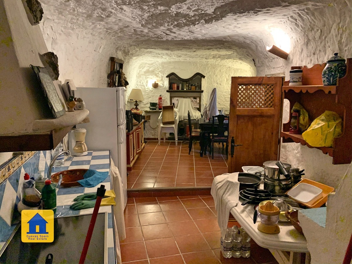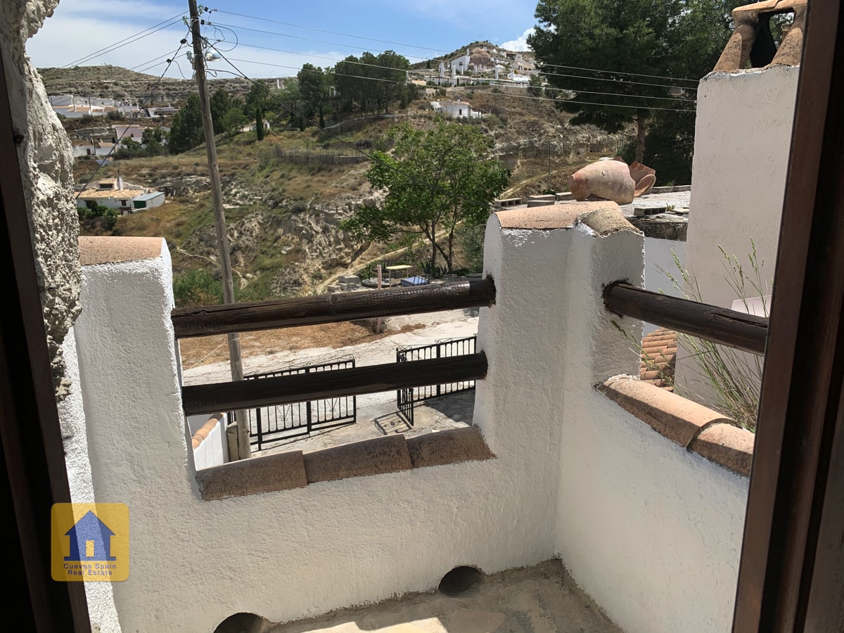 Beautiful, quirky two-storey cave situated on the heights of Galera village. The property has 3-4 bedrooms and 2 bathrooms. The main floor has a central living room with wood stove that leads off in four directions: to the large kitchen; spacious master bedroom and bathroom; hall area which leads to a bathroom and to stairs to the upper floor; two ensuite front rooms that could be an office/bedroom, storage or playroom. The upper floor has 2 bedrooms, one with a Juliette balcony and views of the hills of Galera. The property has been repainted inside and out so it is in excellent condition and ready to move in. There is a nice, gated front patio with views. The patio could accommodate a bbq and sitting area or could be used for parking. Across from the cave is additional space with great views for a garden terrace or parking. This property is in a quiet location of Galera with very little passage. The village center and amenities are a 10 min walk.