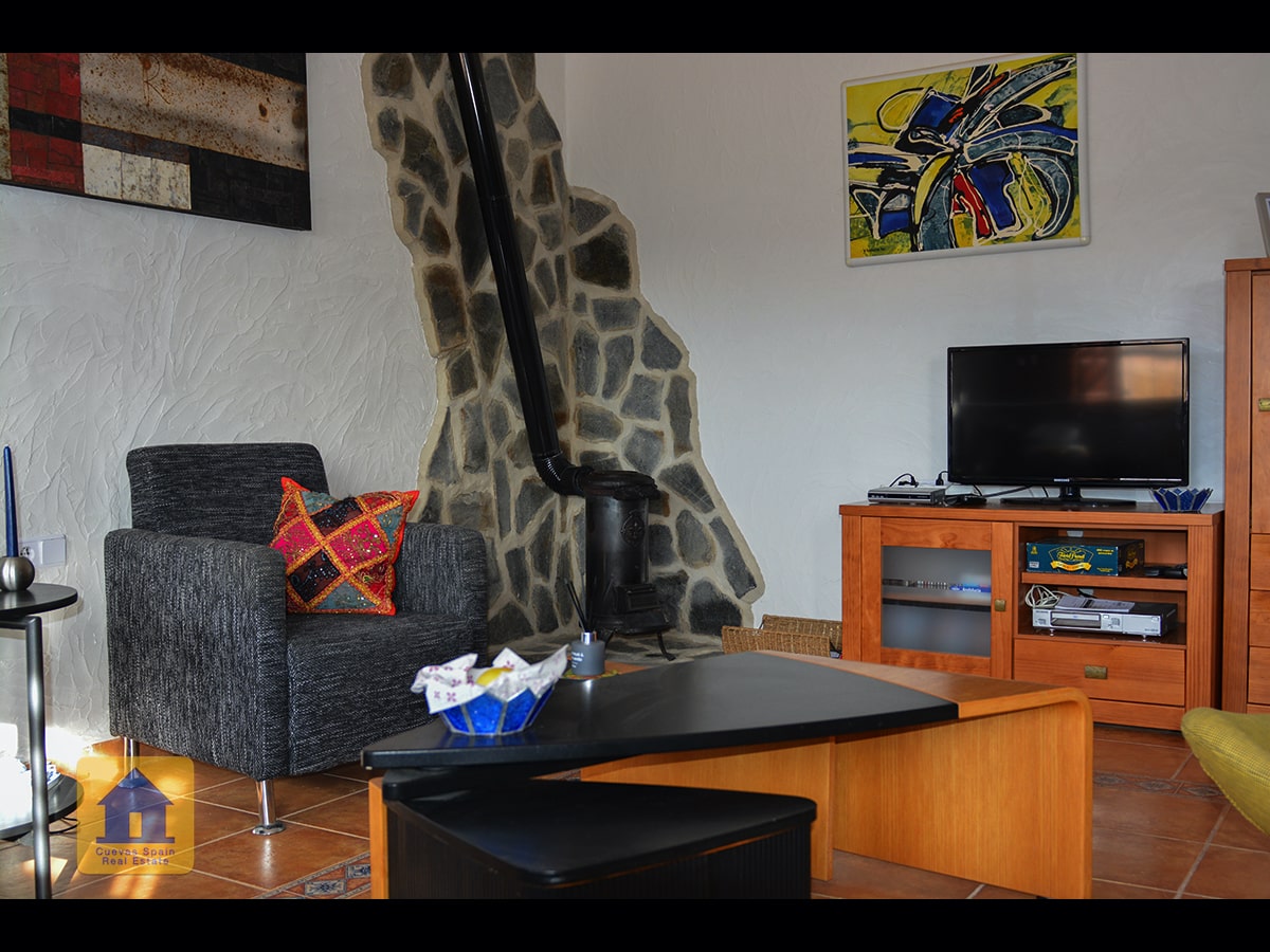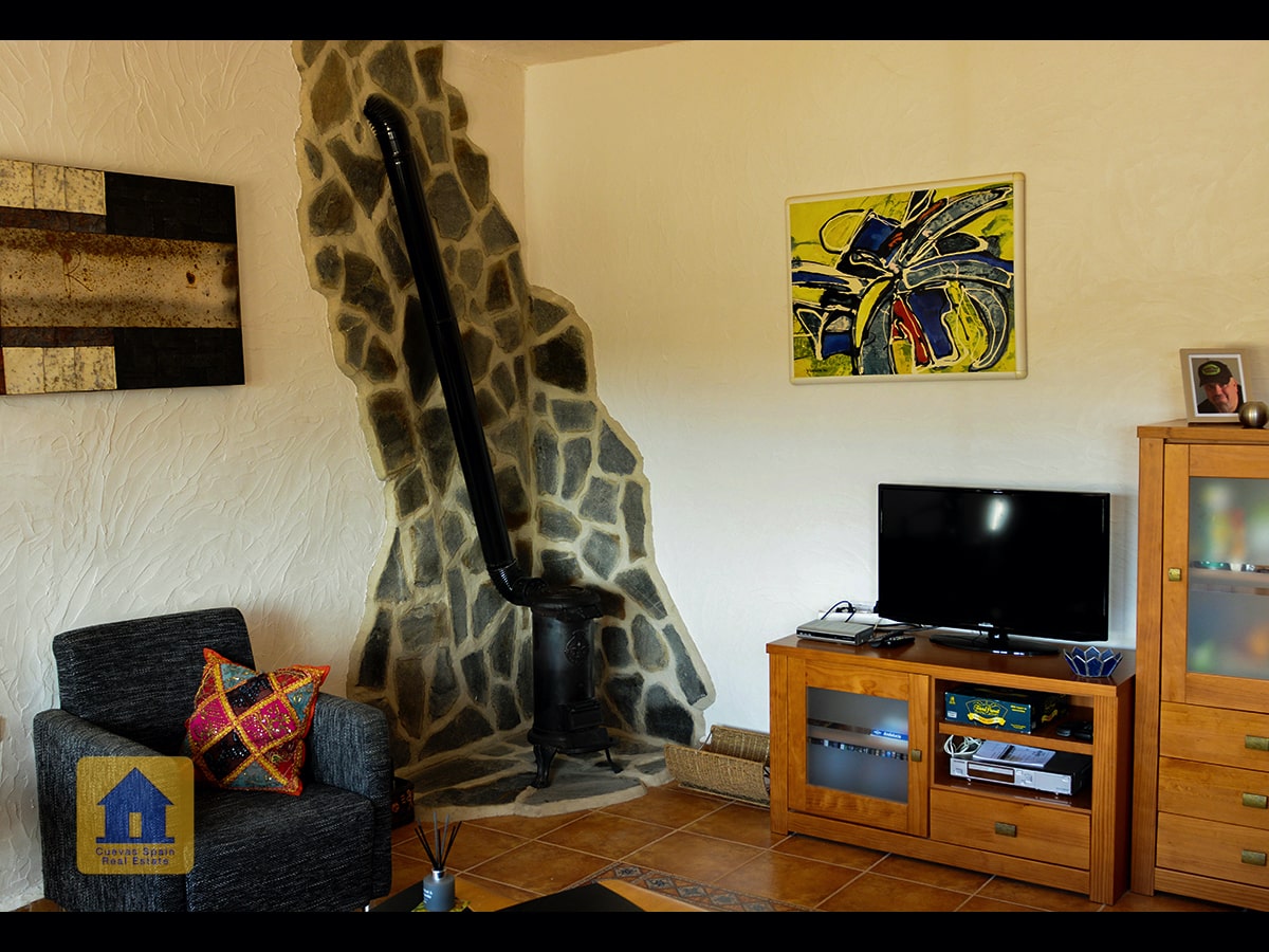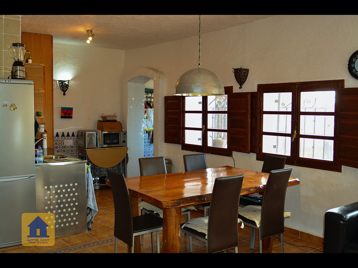 En face de l'entrée de la maison, il y a un hangar de stockage sur la droite dans lequel vous pouvez garder tous vos équipements et outils de jardin. Le porche a de jolies tuiles espagnoles et un espace de suspension pour les manteaux. Vous entrez ensuite sous une arche dans la cuisine ouverte, la salle à manger et le salon, avec un poêle à bois et de nombreuses fenêtres qui laissent entrer beaucoup de lumière. La cuisine dispose de tous les appareils électroménagers habituels, y compris un four, un lave-linge et un lave-vaisselle, et de nombreux placards. Les propriétaires ont déclaré que le contenu est inclus dans la vente (à l'exception de quelques objets personnels). Il y a une grande table à manger et beaucoup de sièges dans une belle zone de vie ouverte. Le sol est carrelé d'élégants carreaux de terre cuite, et il y a un travail de pierre autour du poêle à bois.