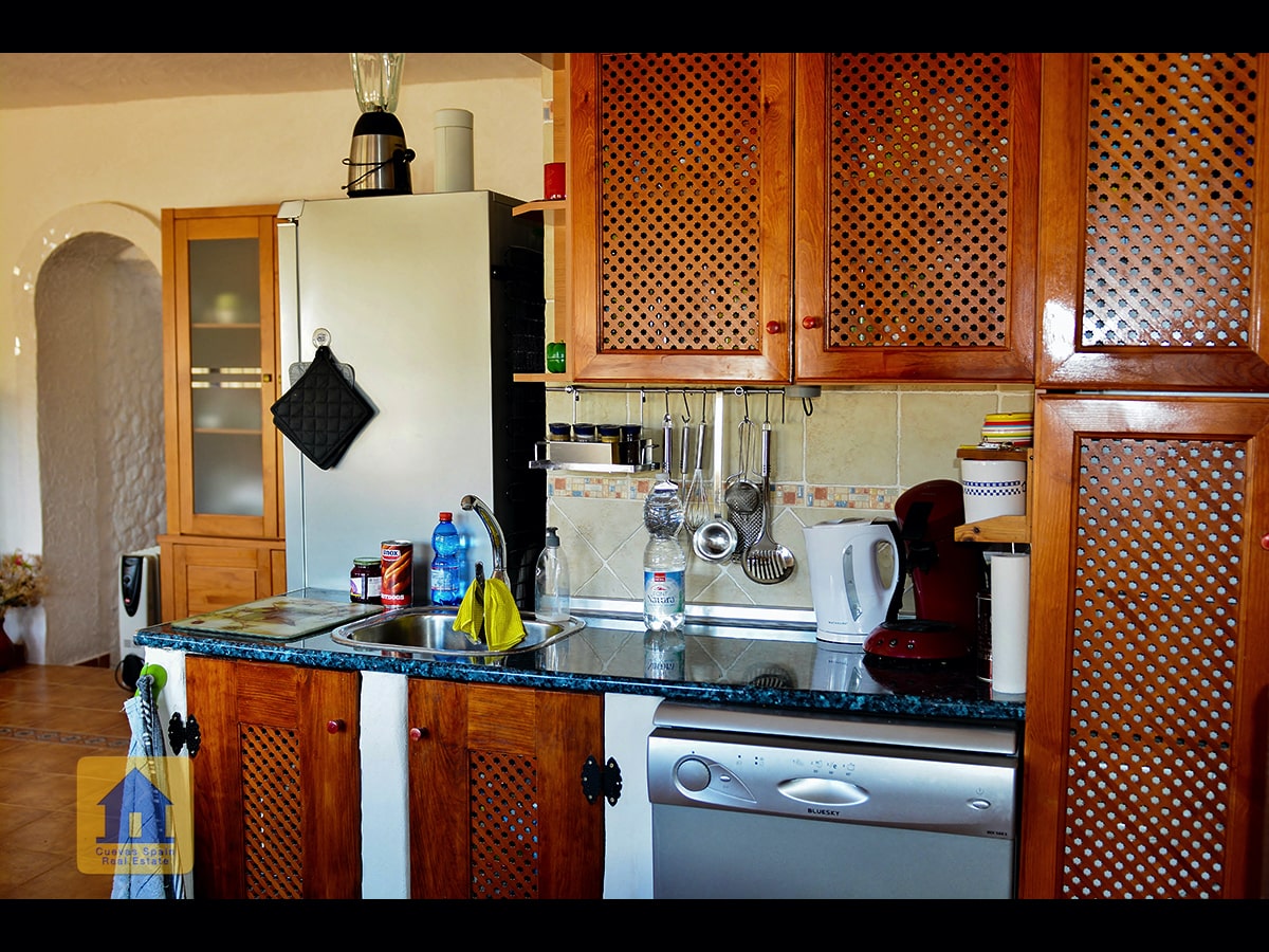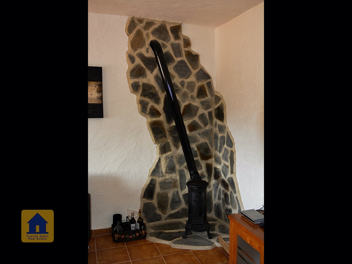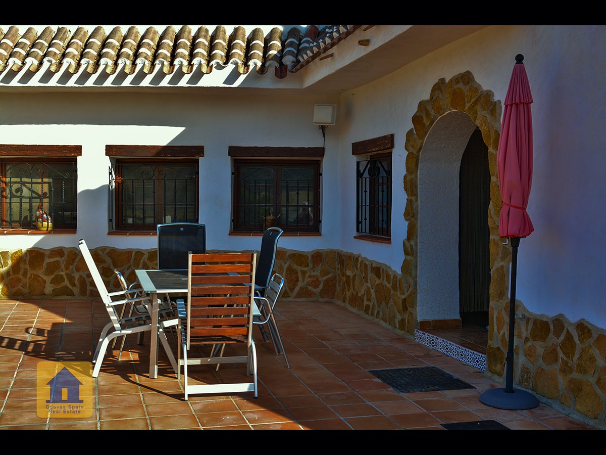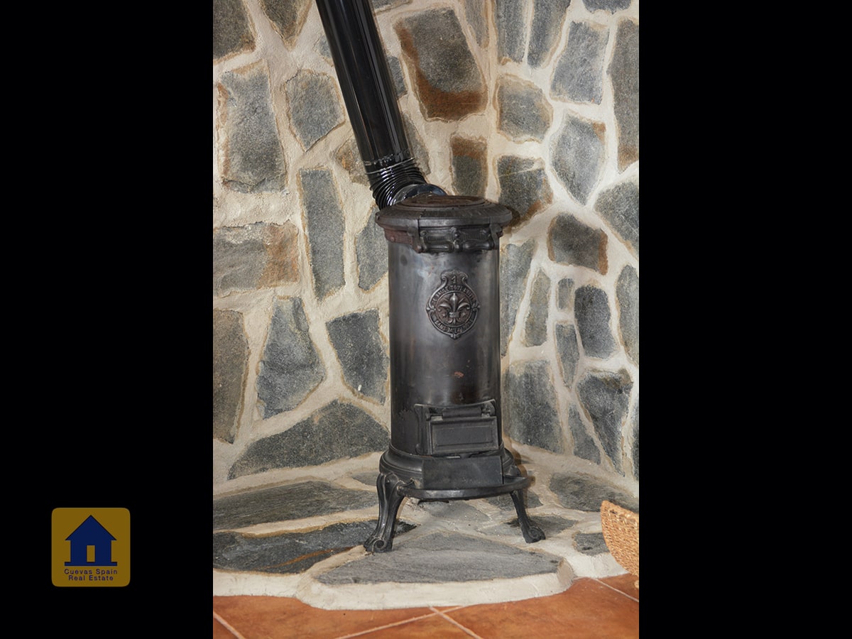 En face de l'entrée de la maison, il y a un hangar de stockage sur la droite dans lequel vous pouvez garder tous vos équipements et outils de jardin. Le porche a de jolies tuiles espagnoles et un espace de suspension pour les manteaux. Vous entrez ensuite sous une arche dans la cuisine ouverte, la salle à manger et le salon, avec un poêle à bois et de nombreuses fenêtres qui laissent entrer beaucoup de lumière. La cuisine dispose de tous les appareils électroménagers habituels, y compris un four, un lave-linge et un lave-vaisselle, et de nombreux placards. Les propriétaires ont déclaré que le contenu est inclus dans la vente (à l'exception de quelques objets personnels). Il y a une grande table à manger et beaucoup de sièges dans une belle zone de vie ouverte. Le sol est carrelé d'élégants carreaux de terre cuite, et il y a un travail de pierre autour du poêle à bois.