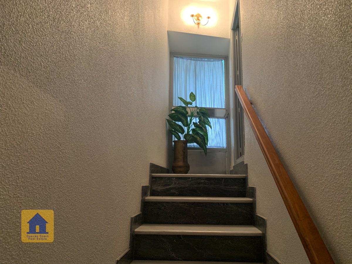 At the end of the corridor, to the left, are the stairs to the first floor. You arrive at the top of the stairs into a sitting room. From there you pass to a living room. On each side of the living room is a large bedroom with windows to the street. The sitting room also leads to a dining room that leads to the kitchen with access to the upper terrace and to the bathroom. The bathroom also has a door to the terrace. Access to the attic is by a staircase from the sitting room.