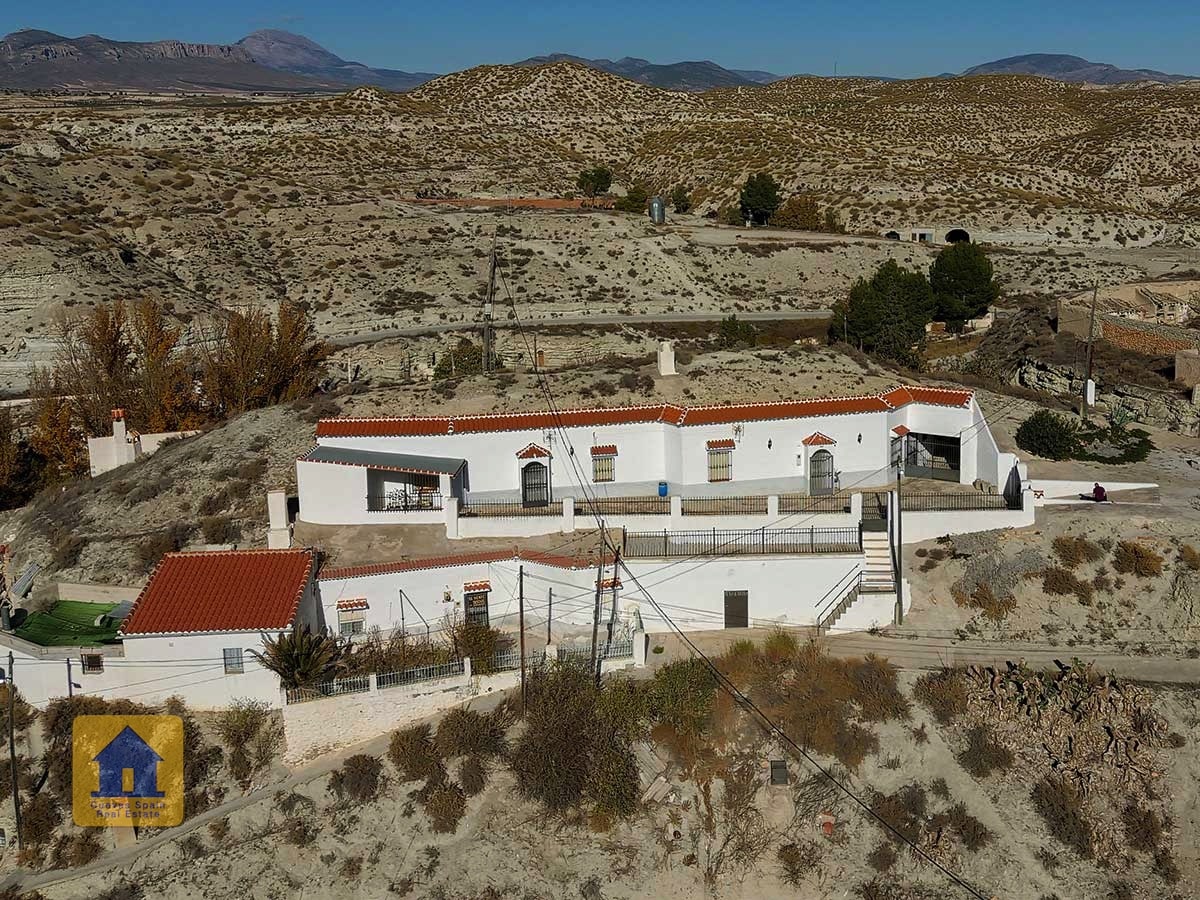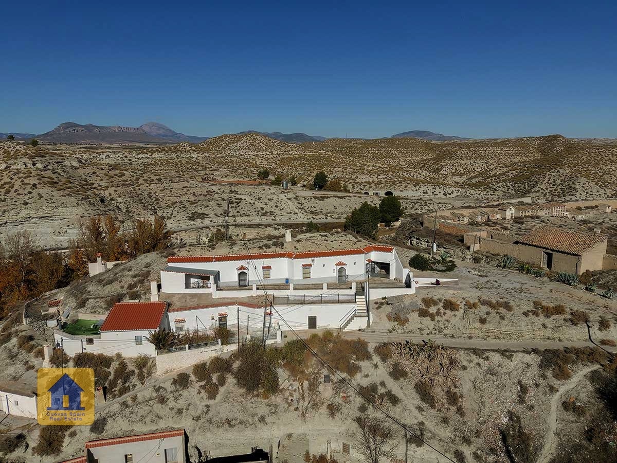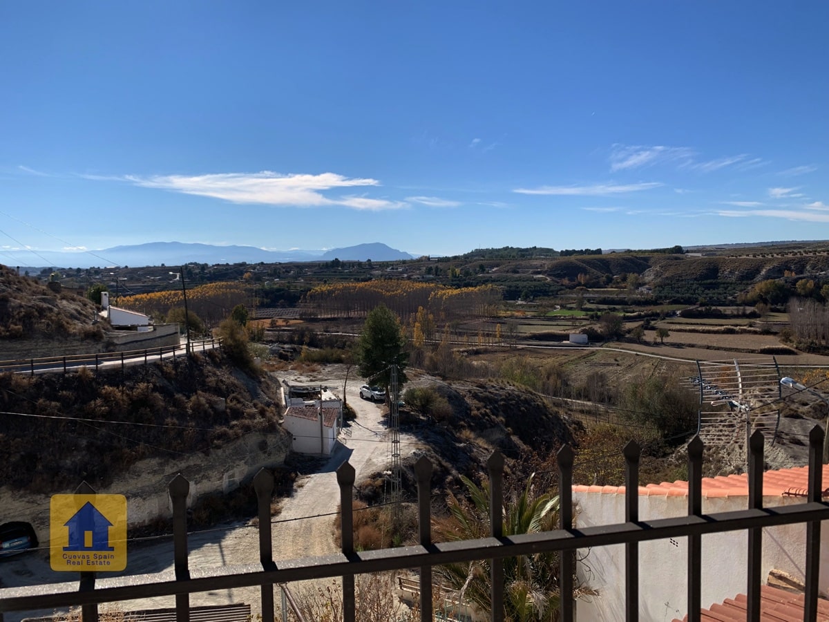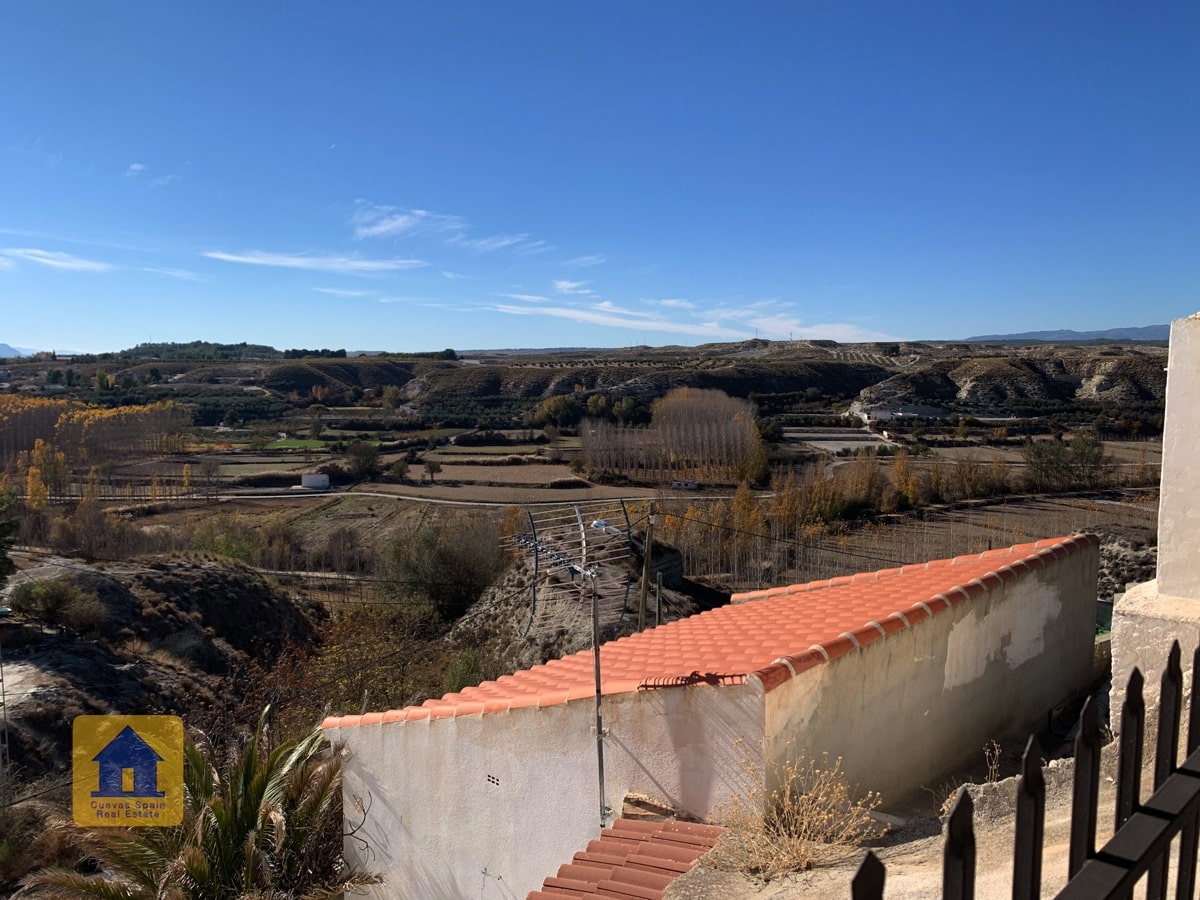 ¡Fantástica casa cueva con impresionantes vistas de los badlands al otro lado del valle! La cueva es muy grande y se puede separar en 2 unidades, cada una con su propia entrada, cocina y baño. Un camino de entrada privado conduce a la puerta y en una amplia terraza con vistas abiertas y una acogedora zona de estar cubierta en el otro extremo. A la derecha al entrar en el patio se encuentra el garaje con una puerta que conduce a la casa (el garaje se utiliza actualmente para el almacenamiento de madera.) Hay una despensa /bodega y una sala de lavandería. La propiedad también tiene un cuarto subterráneo utilizado para almacenar madera, y otra cueva con 2 habitaciones que se utilizaba para los animales en el pasado y ahora tiene almacenamiento de madera, accesible desde la carretera principal. Hay un amplio espacio para aparcar varios coches en la propiedad.