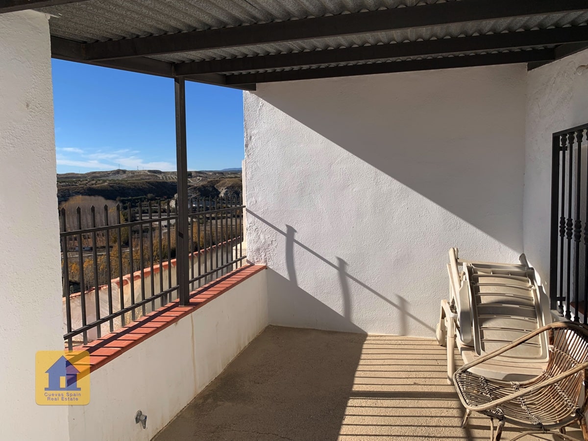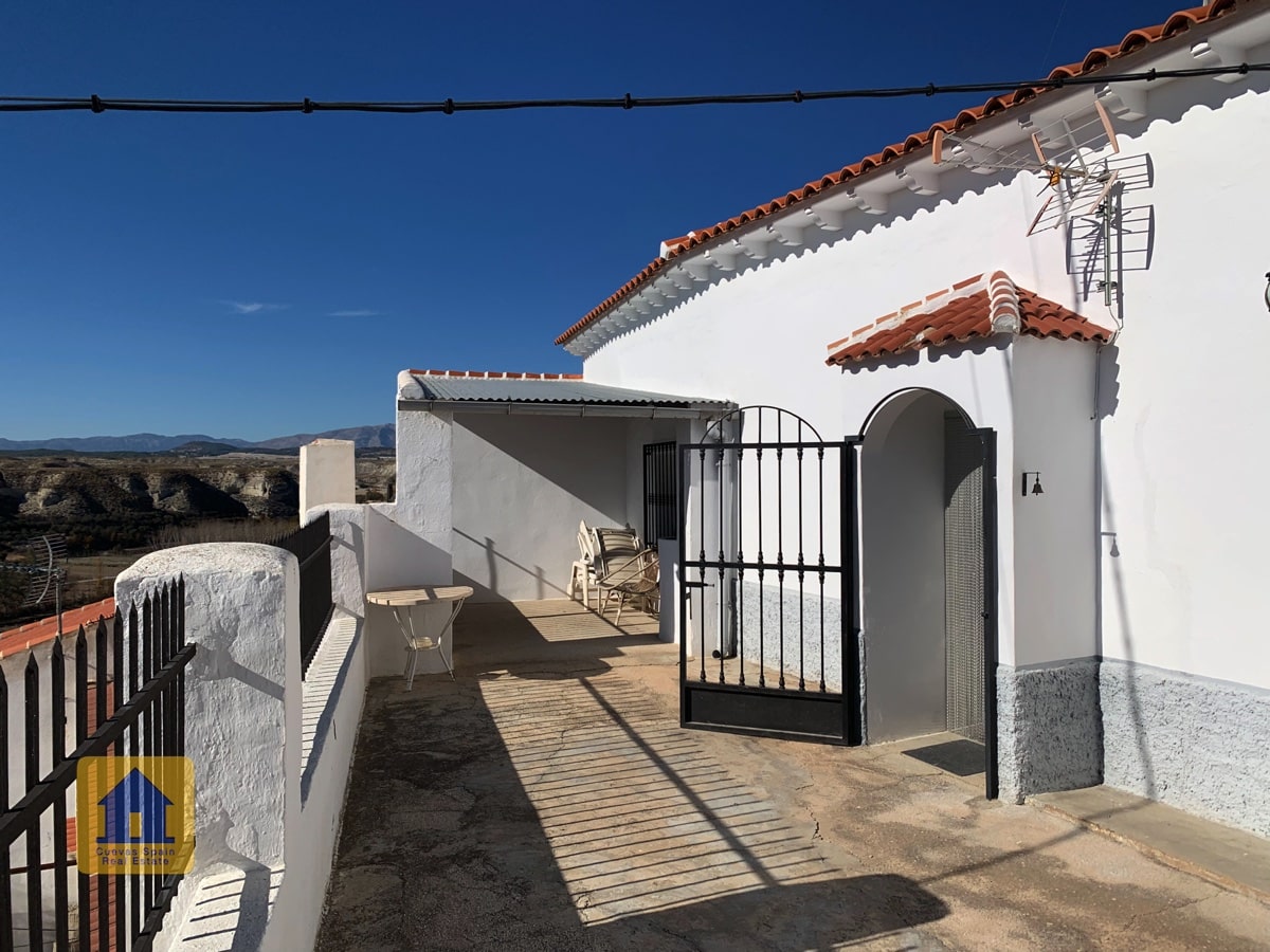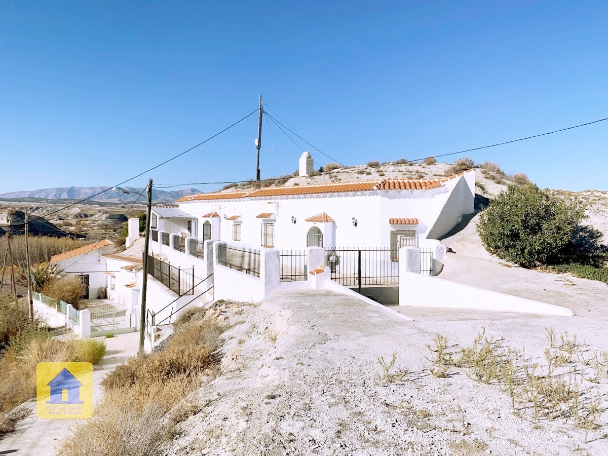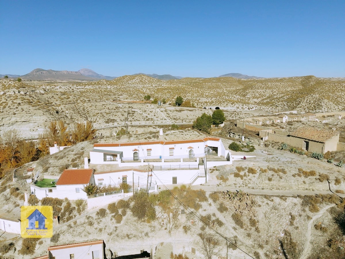 ¡Fantástica casa cueva con impresionantes vistas de los badlands al otro lado del valle! La cueva es muy grande y se puede separar en 2 unidades, cada una con su propia entrada, cocina y baño. Un camino de entrada privado conduce a la puerta y en una amplia terraza con vistas abiertas y una acogedora zona de estar cubierta en el otro extremo. A la derecha al entrar en el patio se encuentra el garaje con una puerta que conduce a la casa (el garaje se utiliza actualmente para el almacenamiento de madera.) Hay una despensa /bodega y una sala de lavandería. La propiedad también tiene un cuarto subterráneo utilizado para almacenar madera, y otra cueva con 2 habitaciones que se utilizaba para los animales en el pasado y ahora tiene almacenamiento de madera, accesible desde la carretera principal. Hay un amplio espacio para aparcar varios coches en la propiedad.