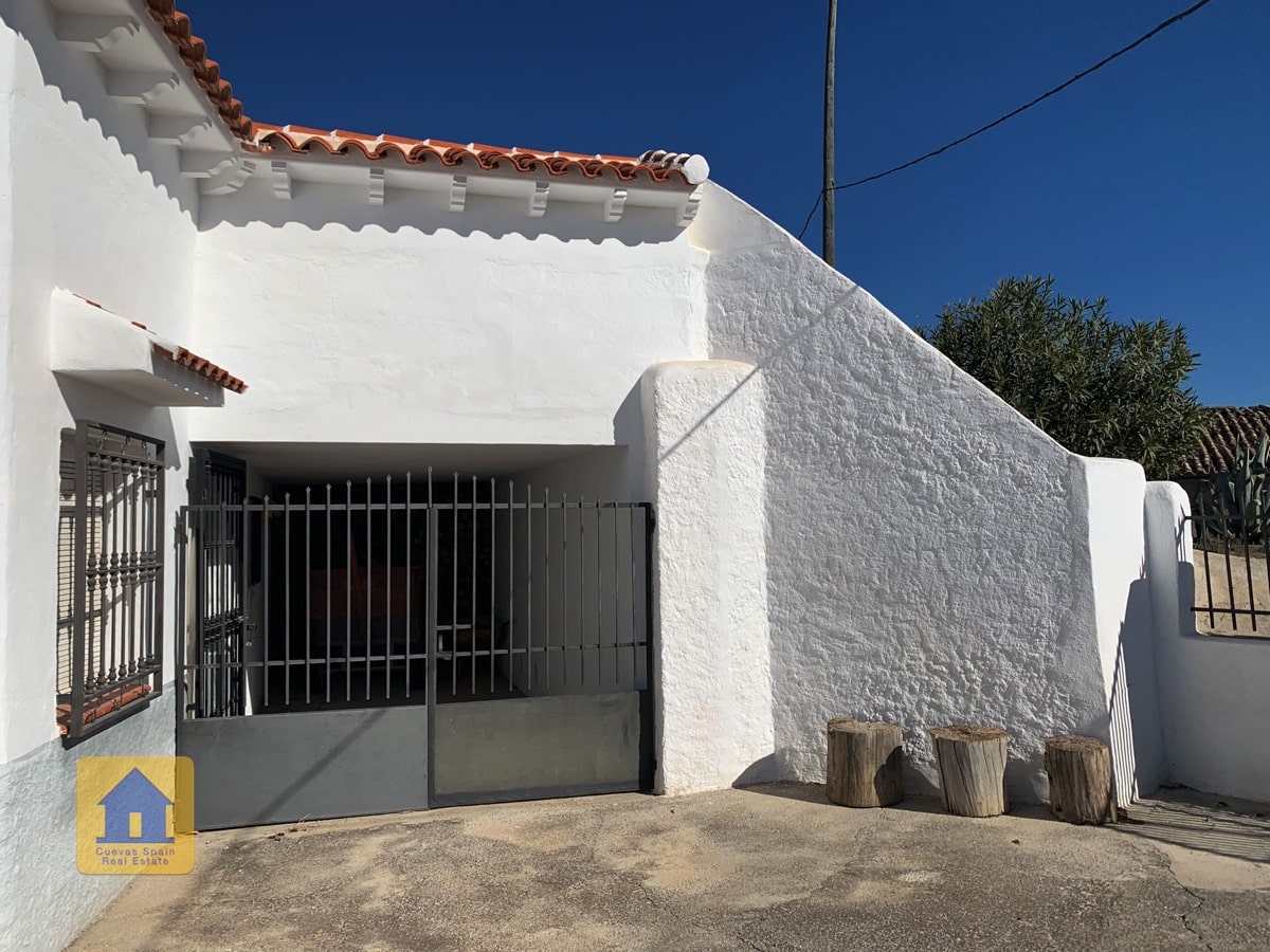 Fantastic cave house with stunning views of the badlands across the valley! The cave is very large and can be separated into 2 units, each with its own entrance, kitchen and bathroom. A private driveway leads to the gate and onto an expansive terrace with wide open views and a cozy covered sitting area at the far end. To the right upon entering the patio is the garage with a door leading into the house (The garage is currently used for wood storage.) There is a pantry/bodega and a laundry room. The property also has an underground room used for storing wood, and another cave with 2 rooms that was used for animals in the past and now has wood storage, accessible from the main road. There is ample space to park several cars on the property.