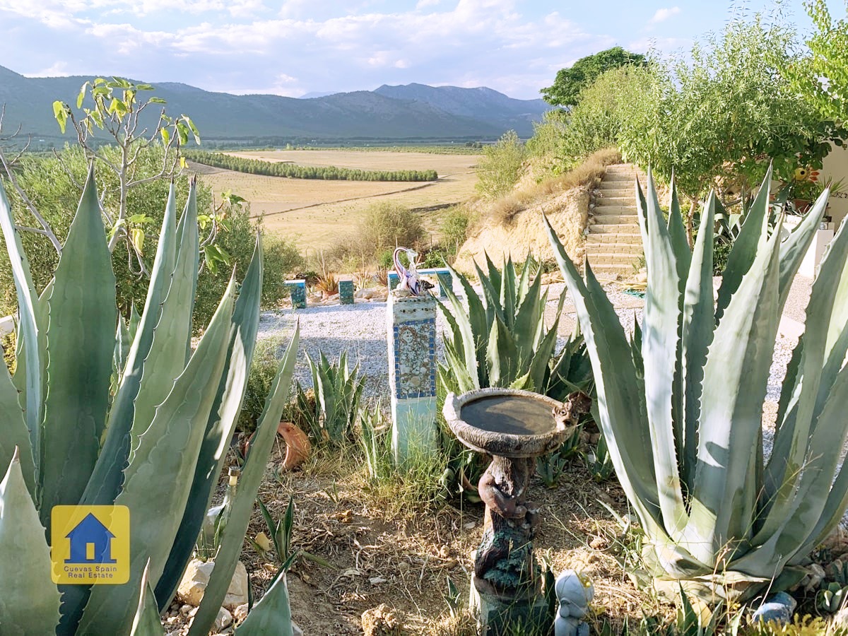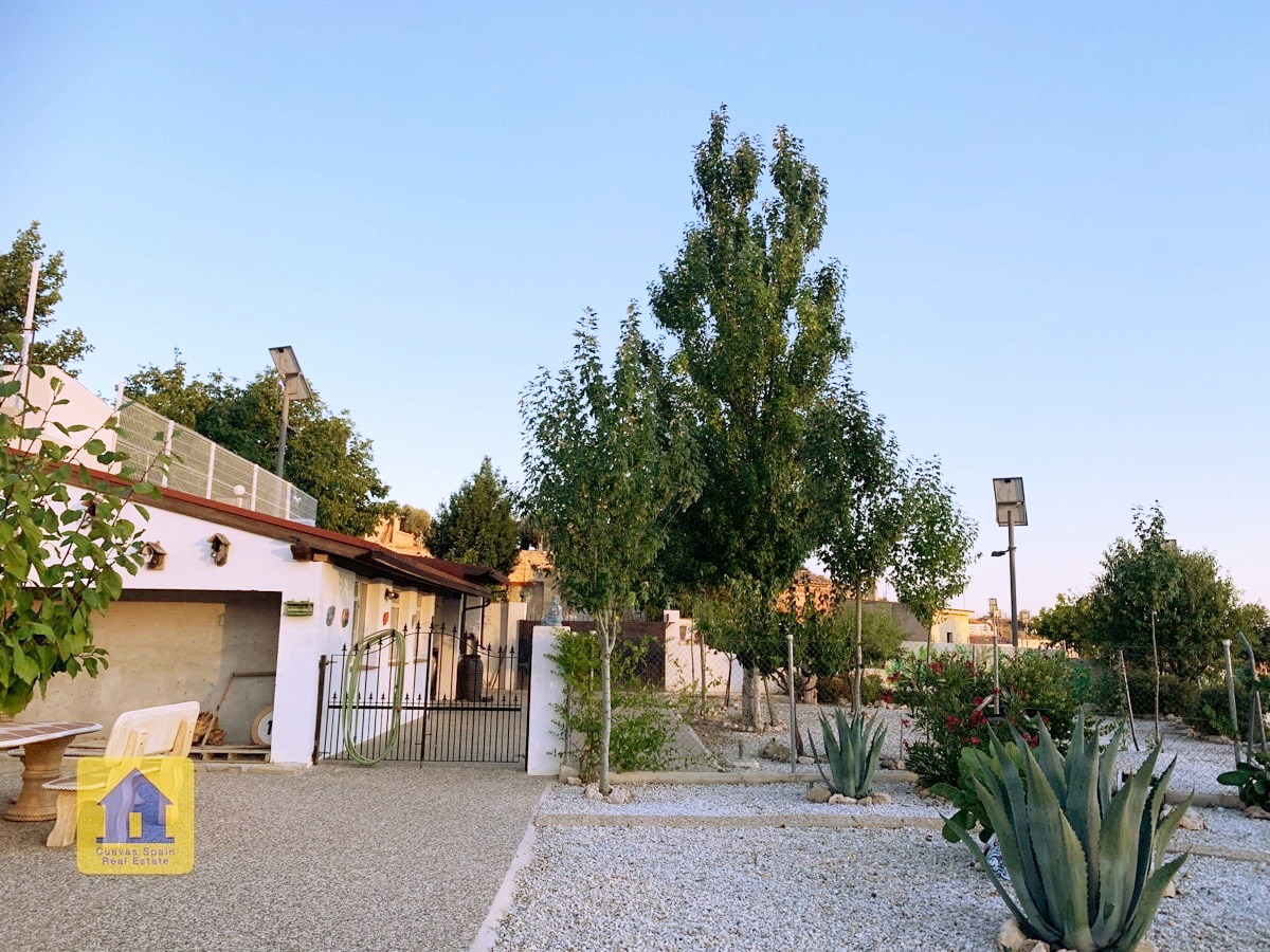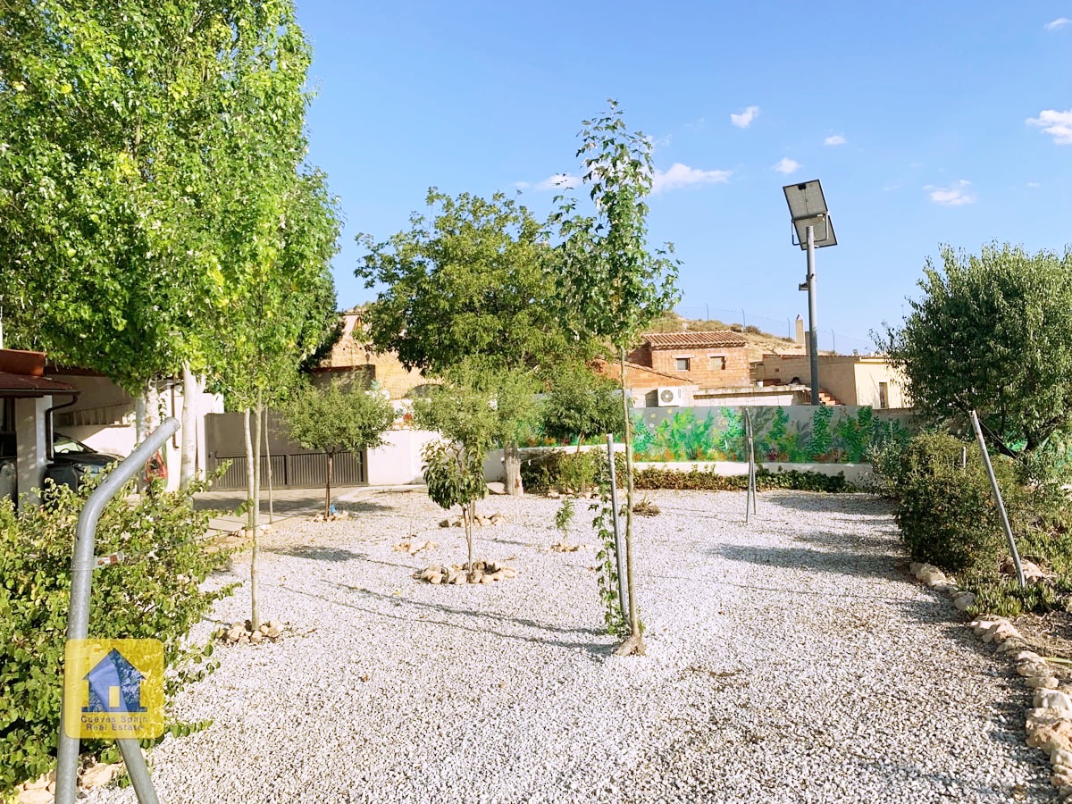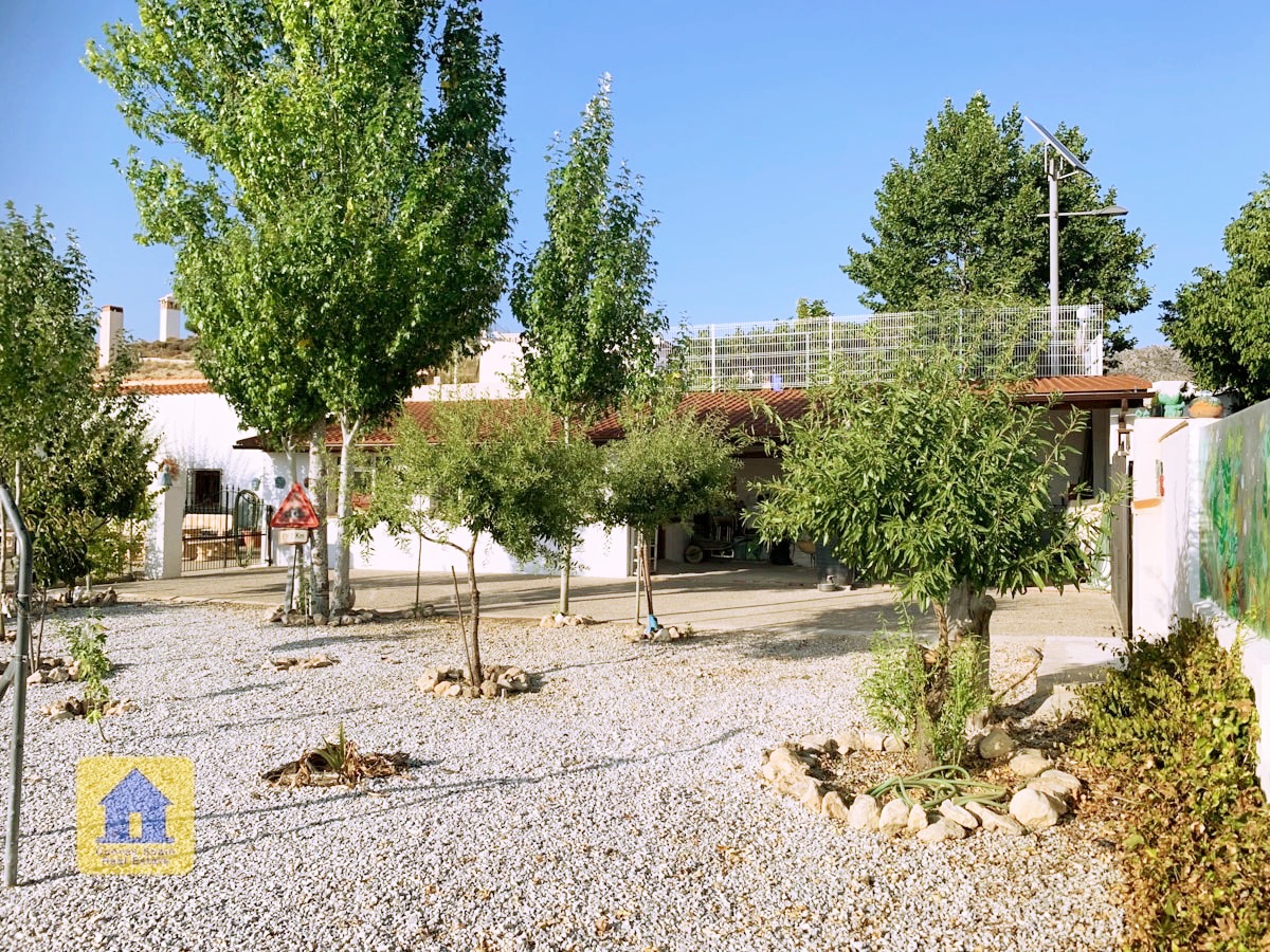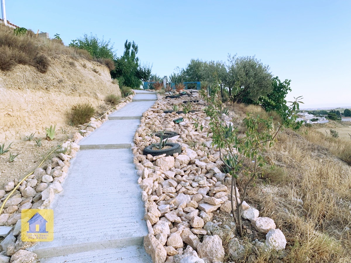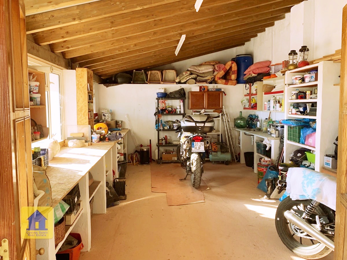 La propiedad está situada en una parcela de 1.900 m2 en lo alto de una cresta, está orientada al suroeste y está cerrada y totalmente vallada. Usted entra en un amplio camino de entrada con un huerto recién plantado a la izquierda y un carport de 2 coches con un gran taller soleado a la derecha. El taller está diseñado con muchas estanterías y un techo de tablas de madera. Las tuberías de drenaje llevan el agua de lluvia del tejado a una cisterna. Una puerta decorativa de acero macizo conduce desde el patio de entrada al patio principal. El jardín del patio principal está plantado con árboles y cactus y decorado con caminos de baldosas de hormigón. En el extremo más alejado se han colocado una mesa y unos bancos para ofrecer la mejor vista del valle y las montañas más allá. Los árboles frutales incluyen albaricoques, ciruelas, almendras, aceitunas, higos, caquis y membrillos.