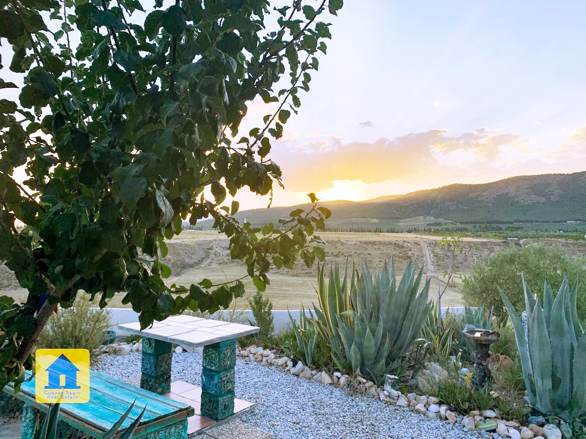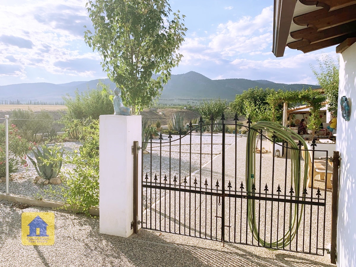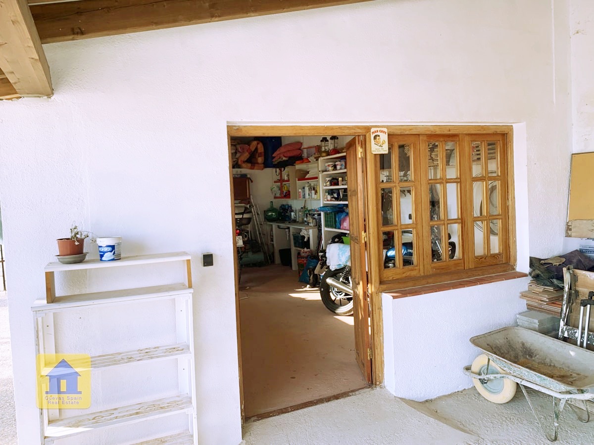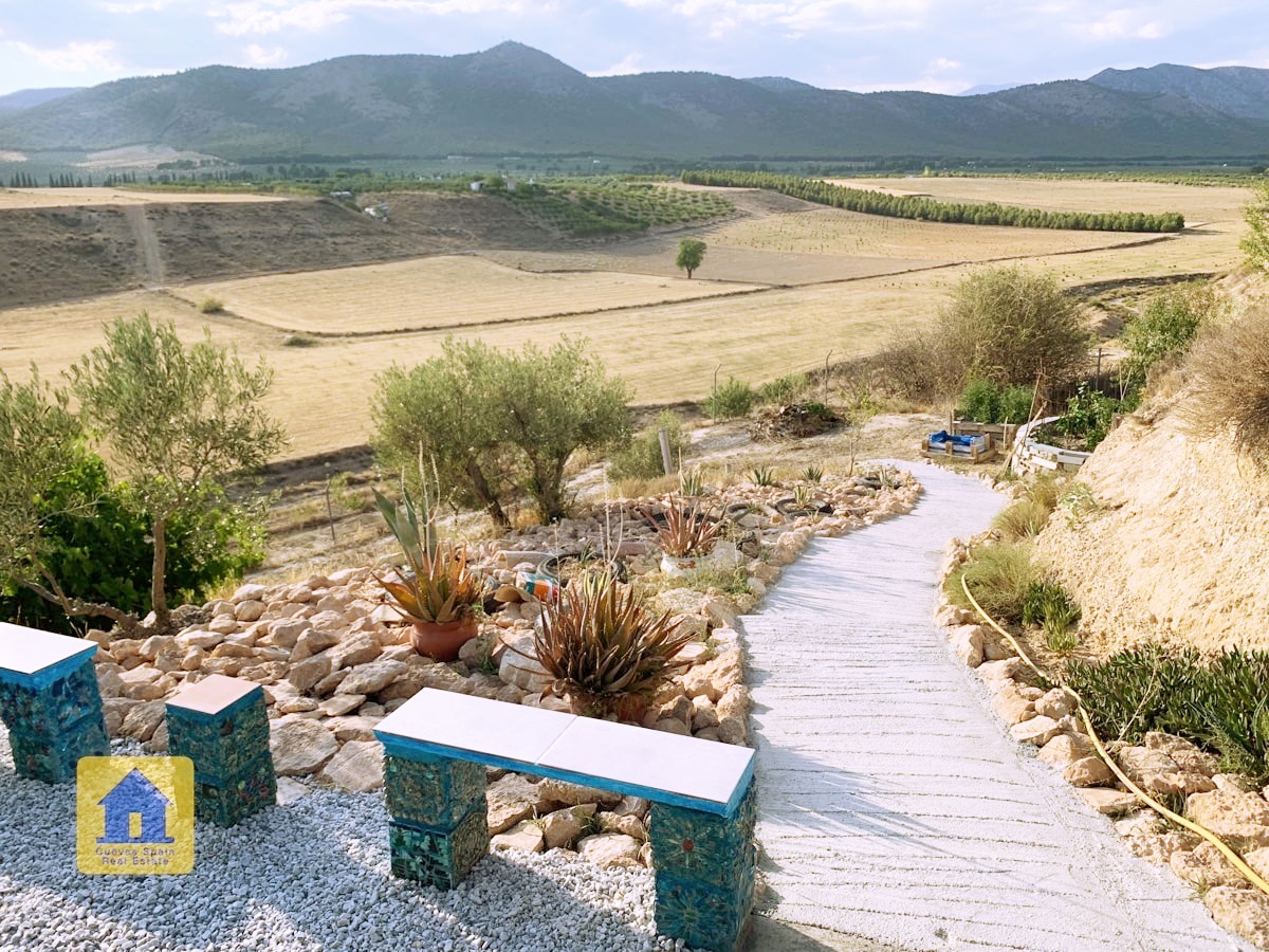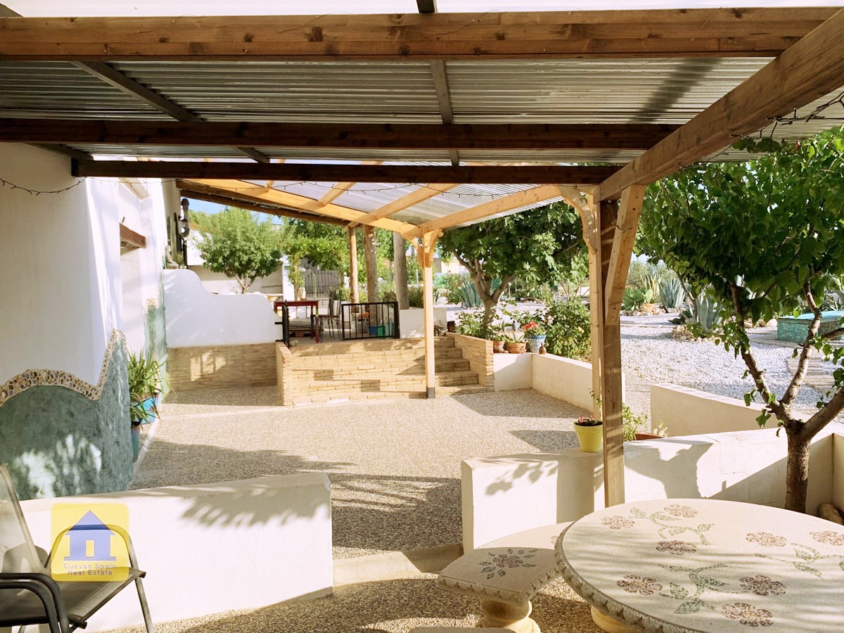 La propiedad está situada en una parcela de 1.900 m2 en lo alto de una cresta, está orientada al suroeste y está cerrada y totalmente vallada. Usted entra en un amplio camino de entrada con un huerto recién plantado a la izquierda y un carport de 2 coches con un gran taller soleado a la derecha. El taller está diseñado con muchas estanterías y un techo de tablas de madera. Las tuberías de drenaje llevan el agua de lluvia del tejado a una cisterna. Una puerta decorativa de acero macizo conduce desde el patio de entrada al patio principal. El jardín del patio principal está plantado con árboles y cactus y decorado con caminos de baldosas de hormigón. En el extremo más alejado se han colocado una mesa y unos bancos para ofrecer la mejor vista del valle y las montañas más allá. Los árboles frutales incluyen albaricoques, ciruelas, almendras, aceitunas, higos, caquis y membrillos.