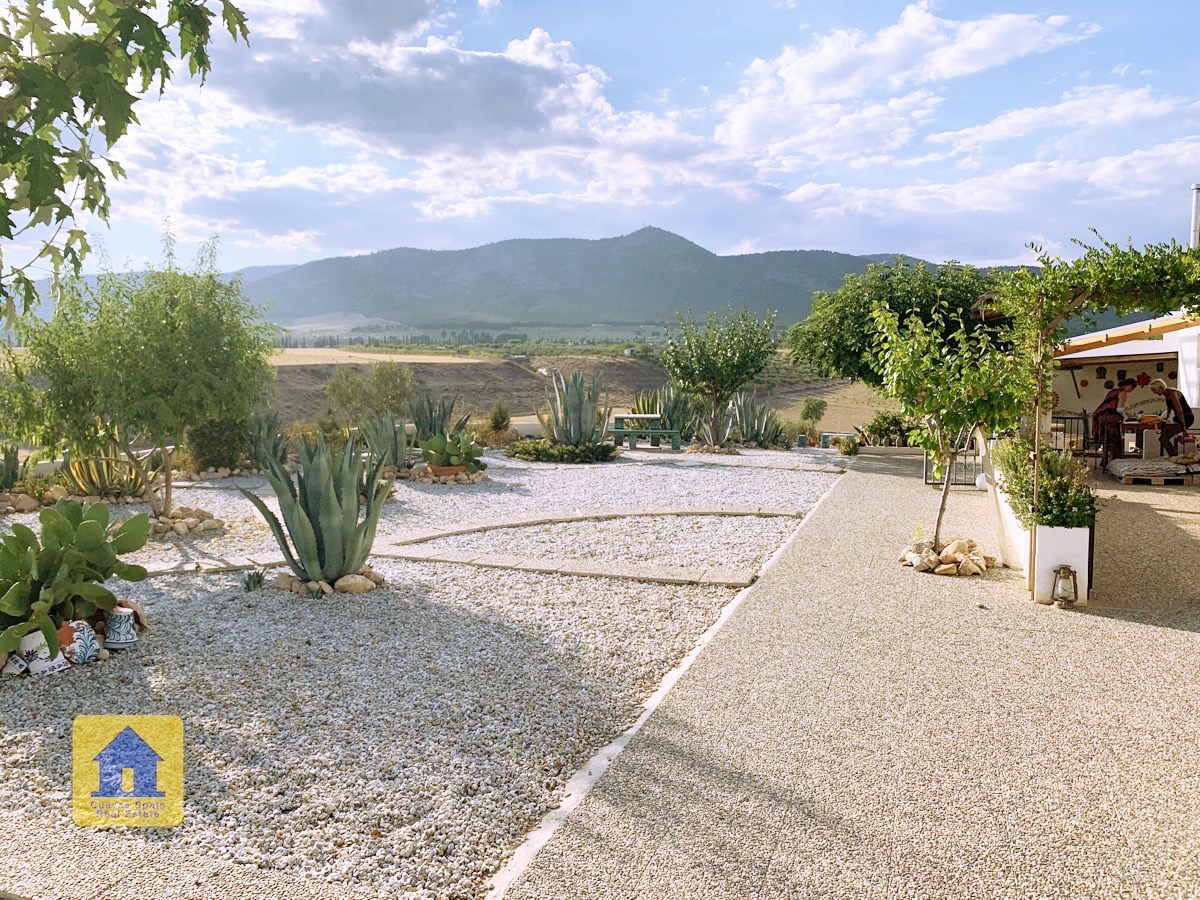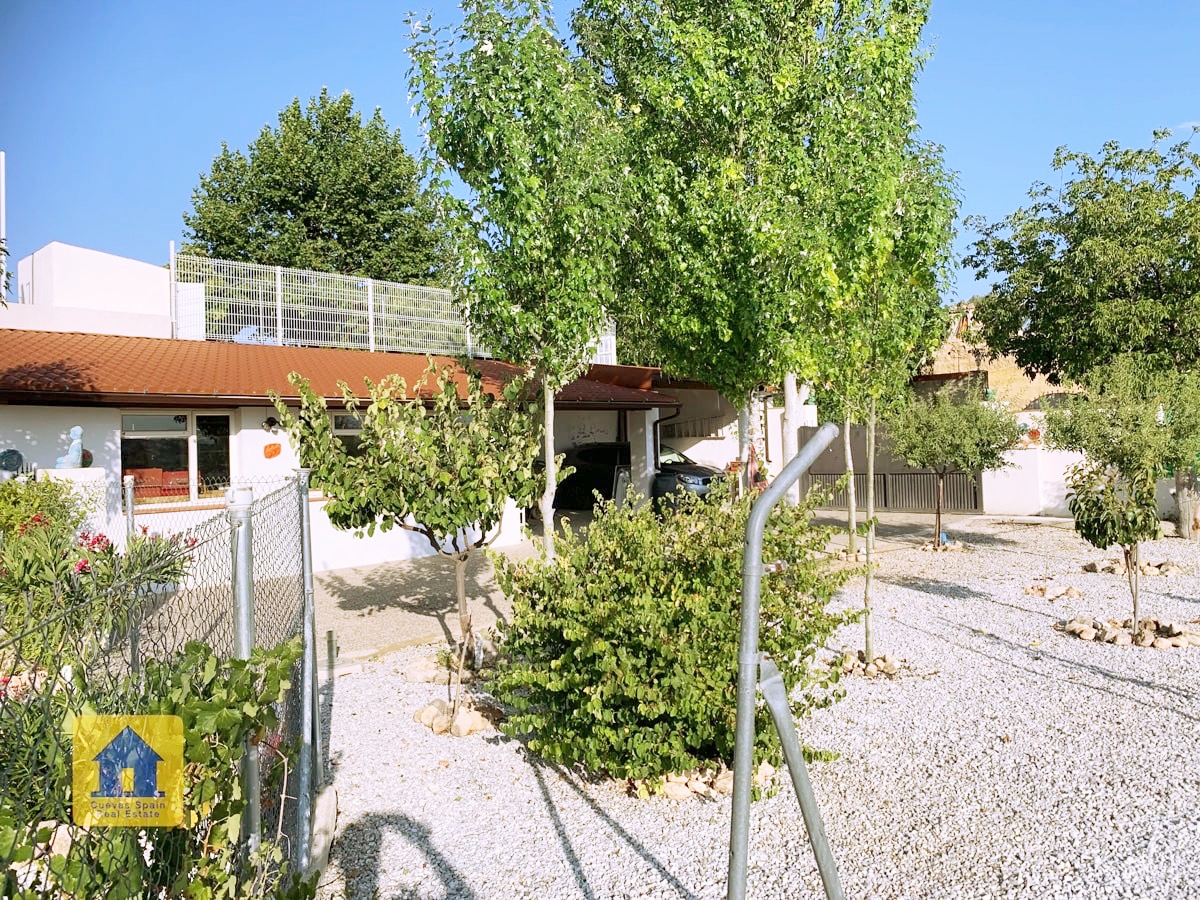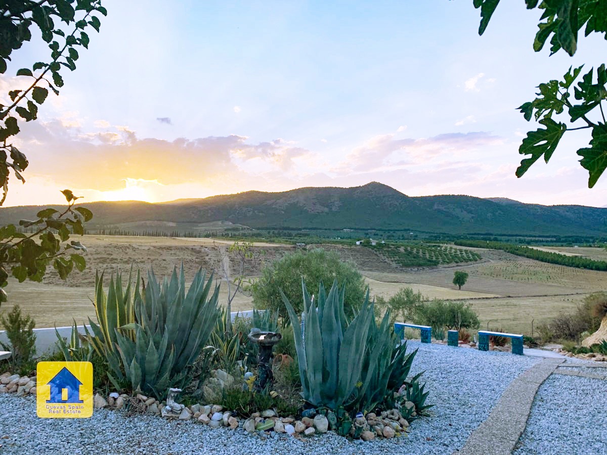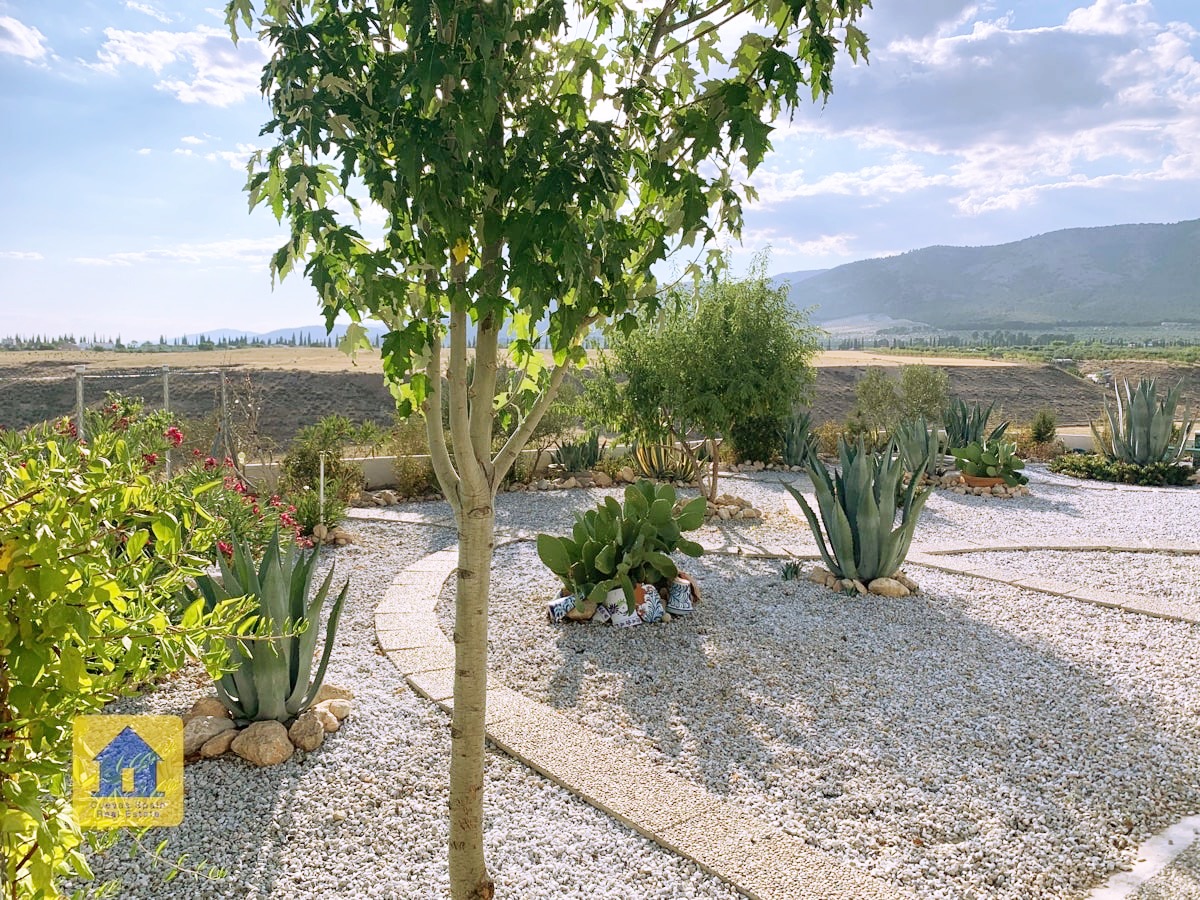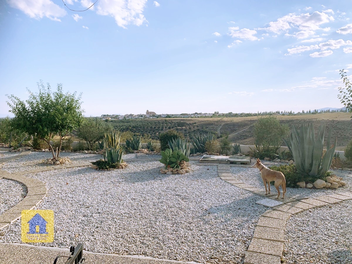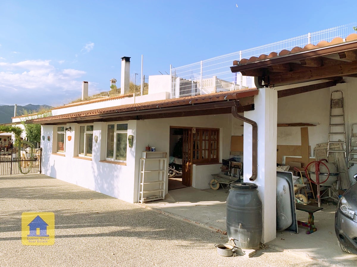 La propiedad está situada en una parcela de 1.900 m2 en lo alto de una cresta, está orientada al suroeste y está cerrada y totalmente vallada. Usted entra en un amplio camino de entrada con un huerto recién plantado a la izquierda y un carport de 2 coches con un gran taller soleado a la derecha. El taller está diseñado con muchas estanterías y un techo de tablas de madera. Las tuberías de drenaje llevan el agua de lluvia del tejado a una cisterna. Una puerta decorativa de acero macizo conduce desde el patio de entrada al patio principal. El jardín del patio principal está plantado con árboles y cactus y decorado con caminos de baldosas de hormigón. En el extremo más alejado se han colocado una mesa y unos bancos para ofrecer la mejor vista del valle y las montañas más allá. Los árboles frutales incluyen albaricoques, ciruelas, almendras, aceitunas, higos, caquis y membrillos.