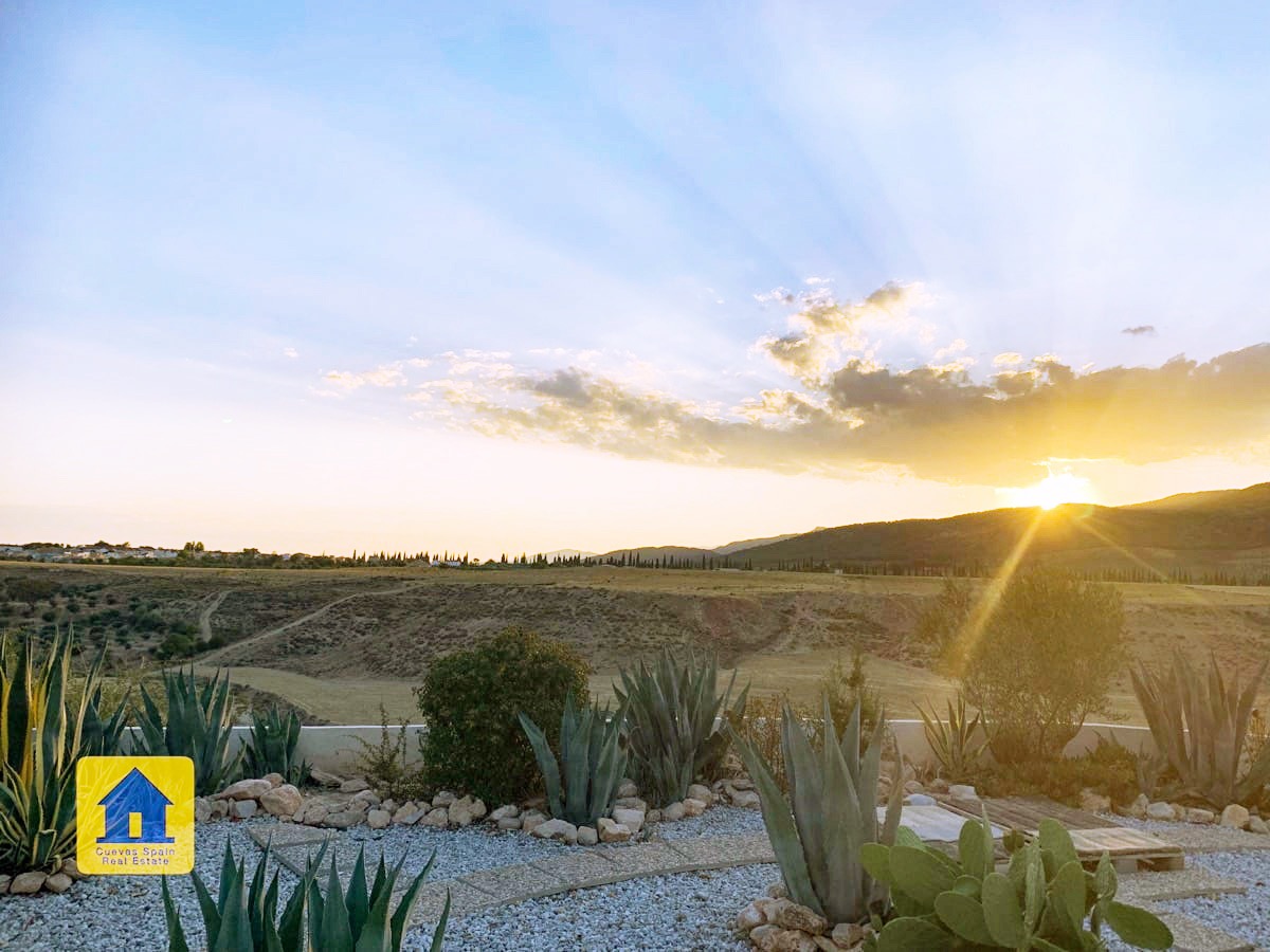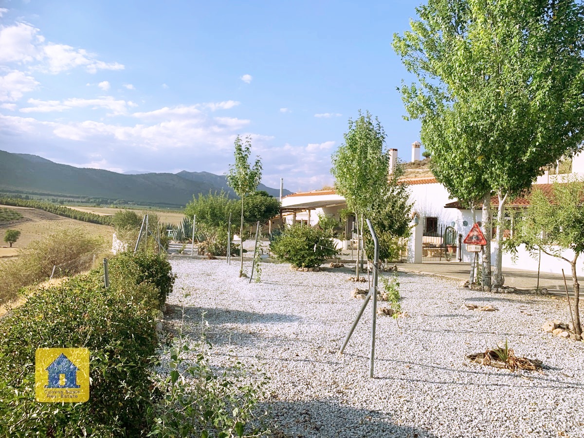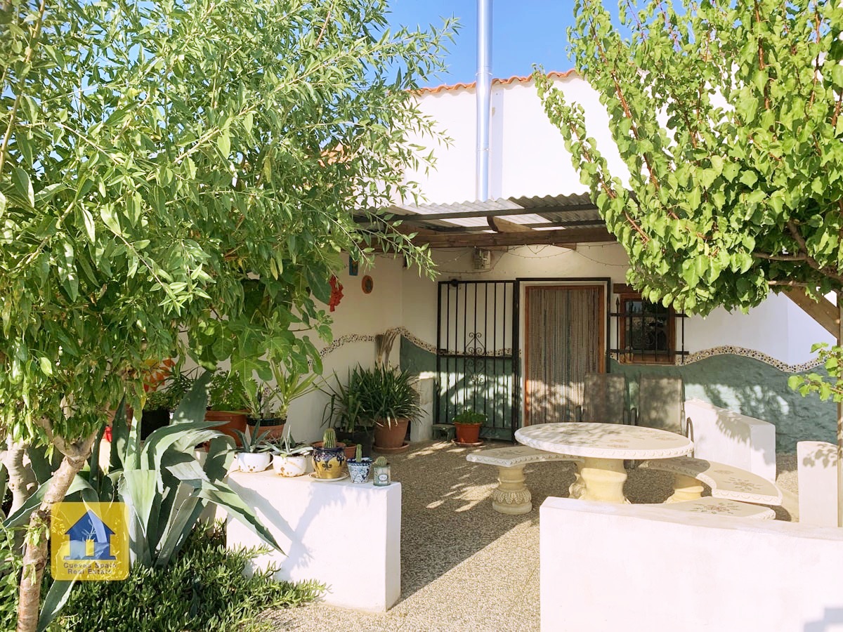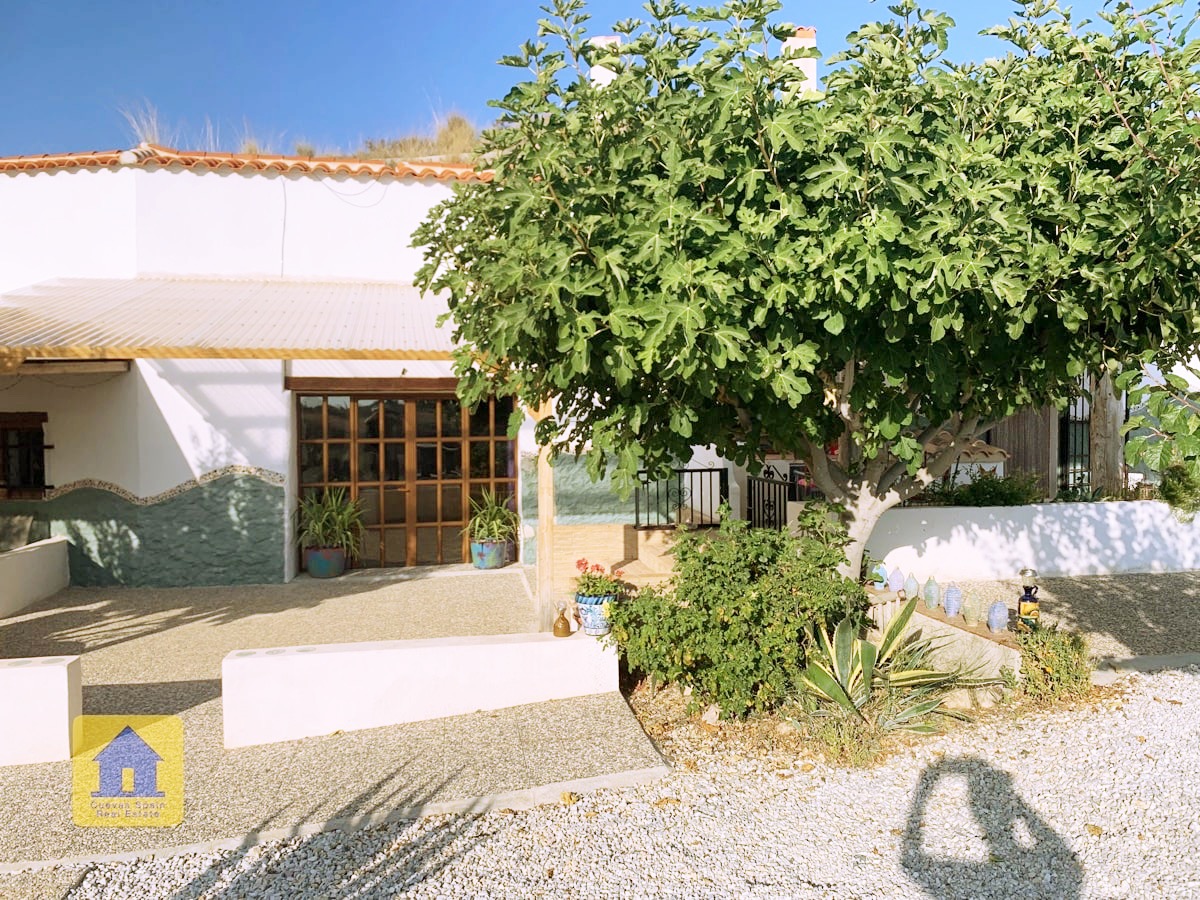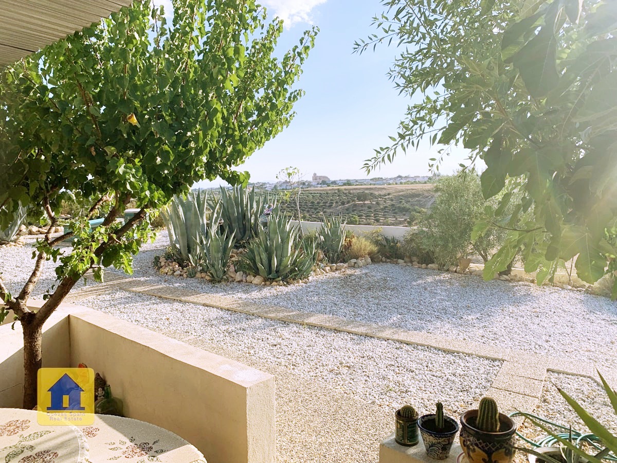 La propiedad está situada en una parcela de 1.900 m2 en lo alto de una cresta, está orientada al suroeste y está cerrada y totalmente vallada. Usted entra en un amplio camino de entrada con un huerto recién plantado a la izquierda y un carport de 2 coches con un gran taller soleado a la derecha. El taller está diseñado con muchas estanterías y un techo de tablas de madera. Las tuberías de drenaje llevan el agua de lluvia del tejado a una cisterna. Una puerta decorativa de acero macizo conduce desde el patio de entrada al patio principal. El jardín del patio principal está plantado con árboles y cactus y decorado con caminos de baldosas de hormigón. En el extremo más alejado se han colocado una mesa y unos bancos para ofrecer la mejor vista del valle y las montañas más allá. Los árboles frutales incluyen albaricoques, ciruelas, almendras, aceitunas, higos, caquis y membrillos.