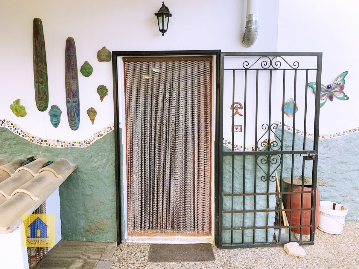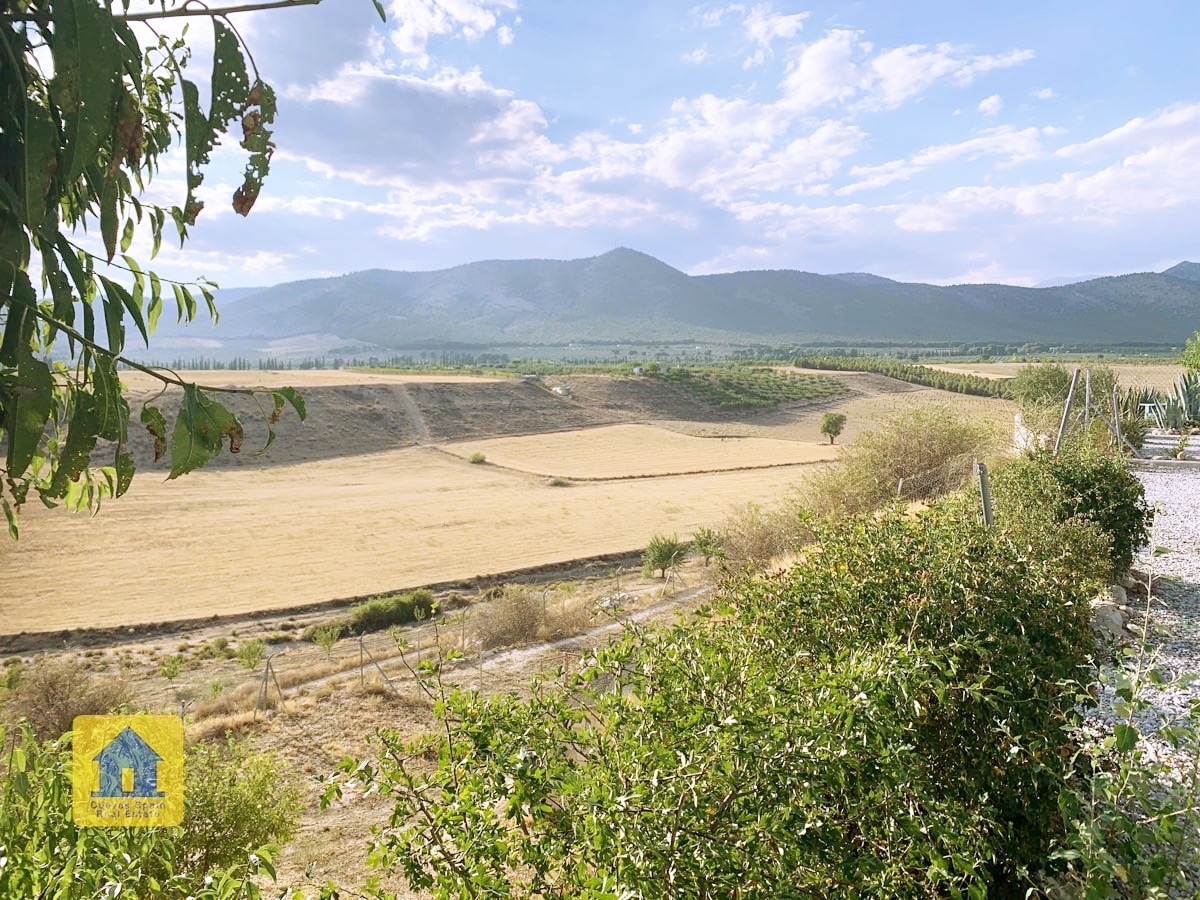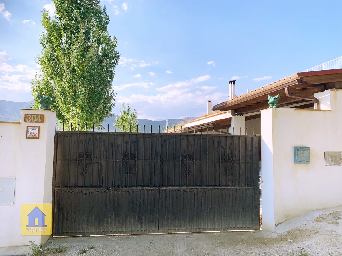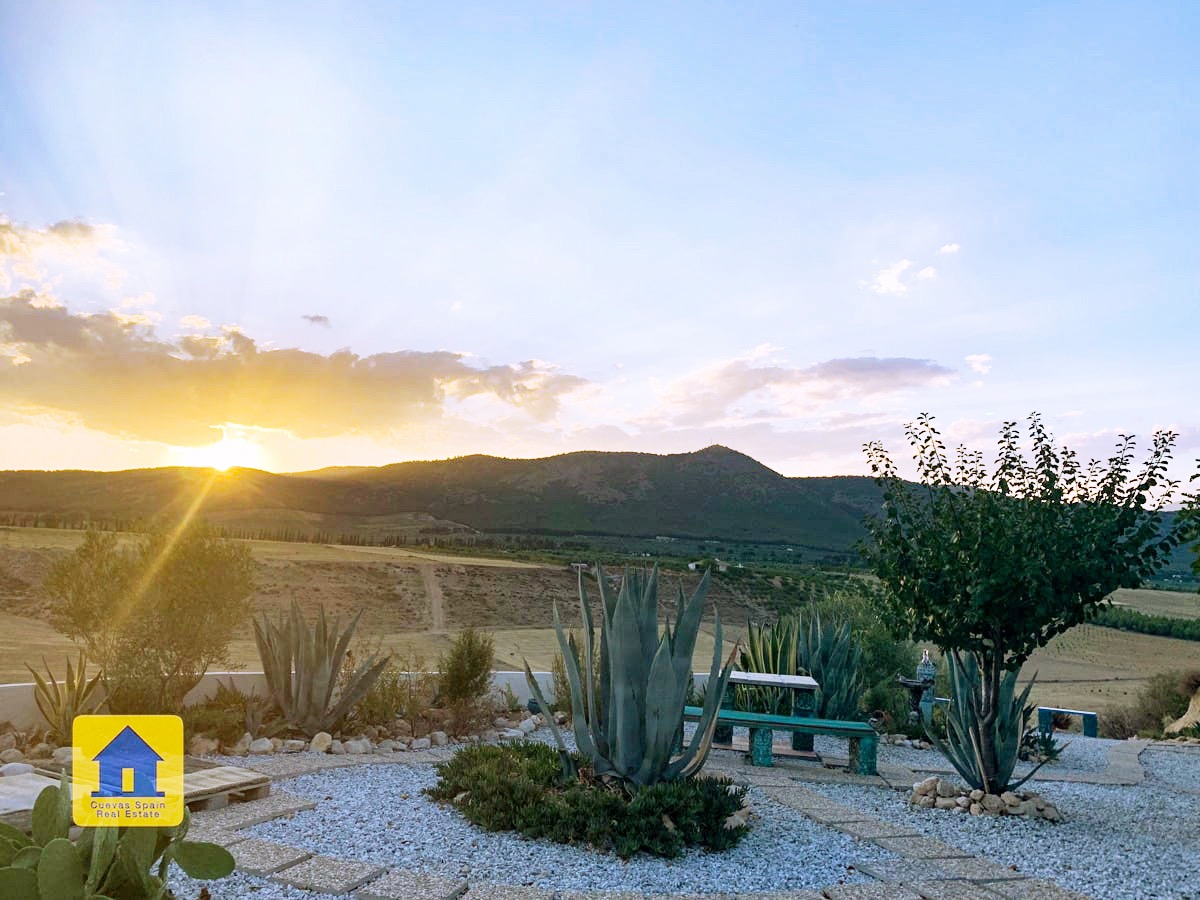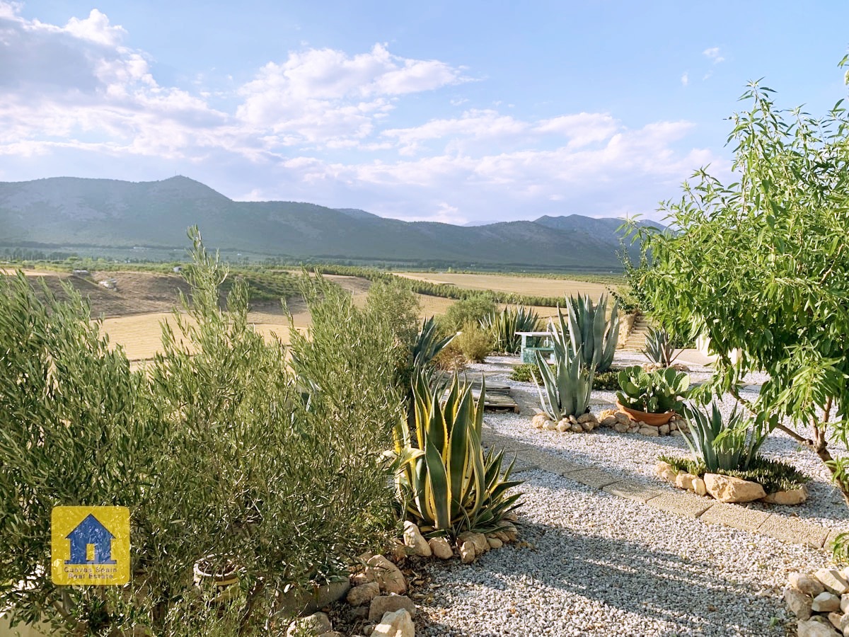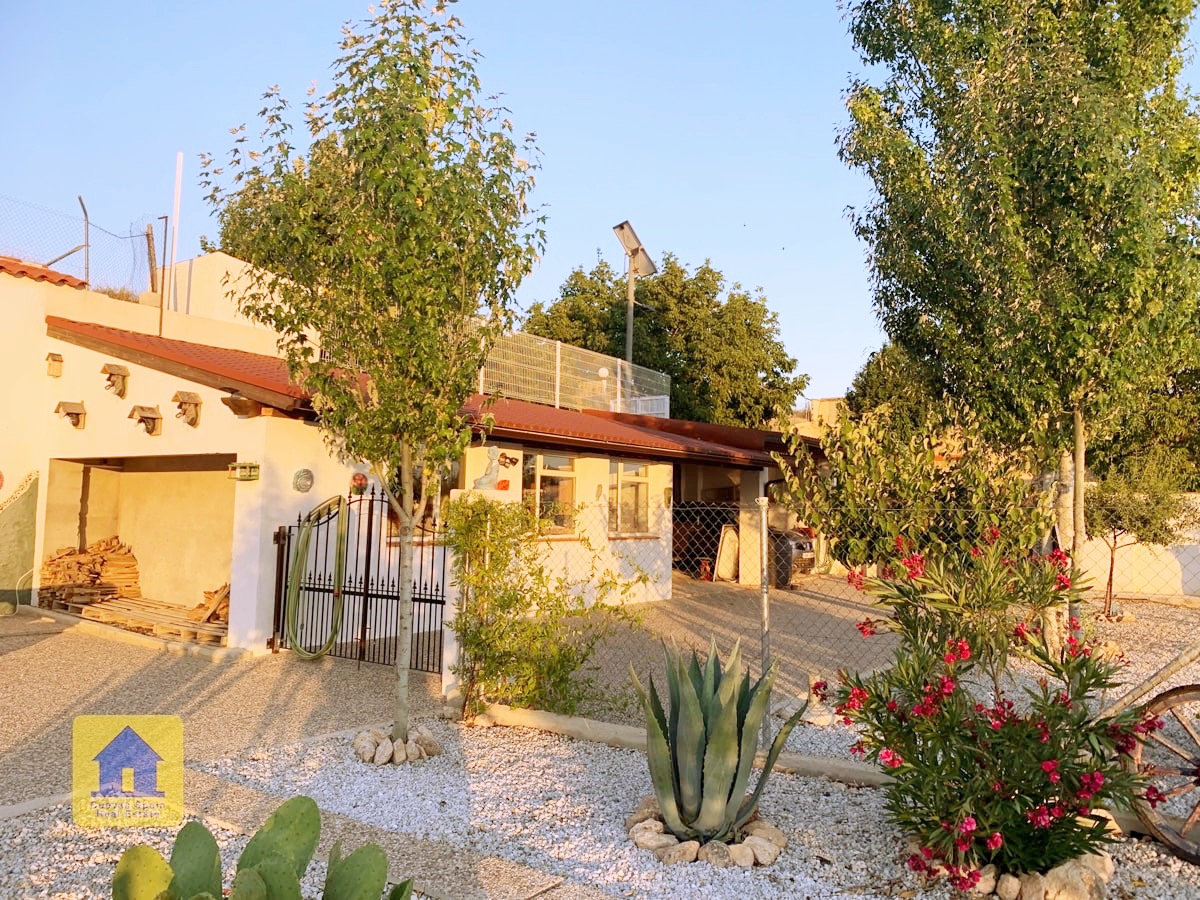La propiedad está situada en una parcela de 1.900 m2 en lo alto de una cresta, está orientada al suroeste y está cerrada y totalmente vallada. Usted entra en un amplio camino de entrada con un huerto recién plantado a la izquierda y un carport de 2 coches con un gran taller soleado a la derecha. El taller está diseñado con muchas estanterías y un techo de tablas de madera. Las tuberías de drenaje llevan el agua de lluvia del tejado a una cisterna. Una puerta decorativa de acero macizo conduce desde el patio de entrada al patio principal. El jardín del patio principal está plantado con árboles y cactus y decorado con caminos de baldosas de hormigón. En el extremo más alejado se han colocado una mesa y unos bancos para ofrecer la mejor vista del valle y las montañas más allá. Los árboles frutales incluyen albaricoques, ciruelas, almendras, aceitunas, higos, caquis y membrillos.