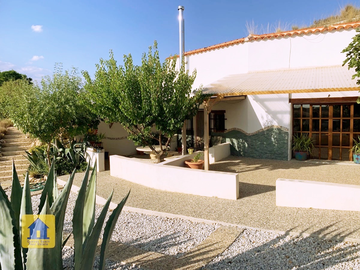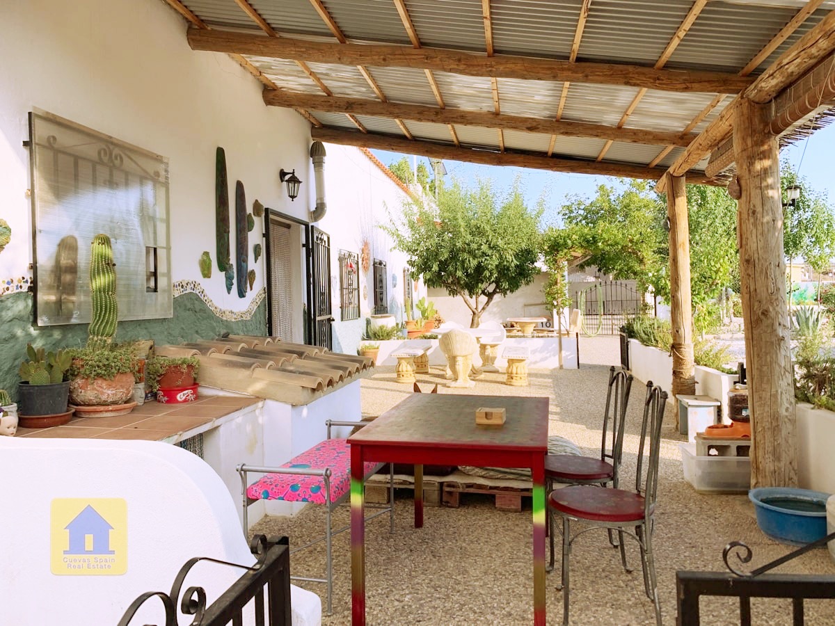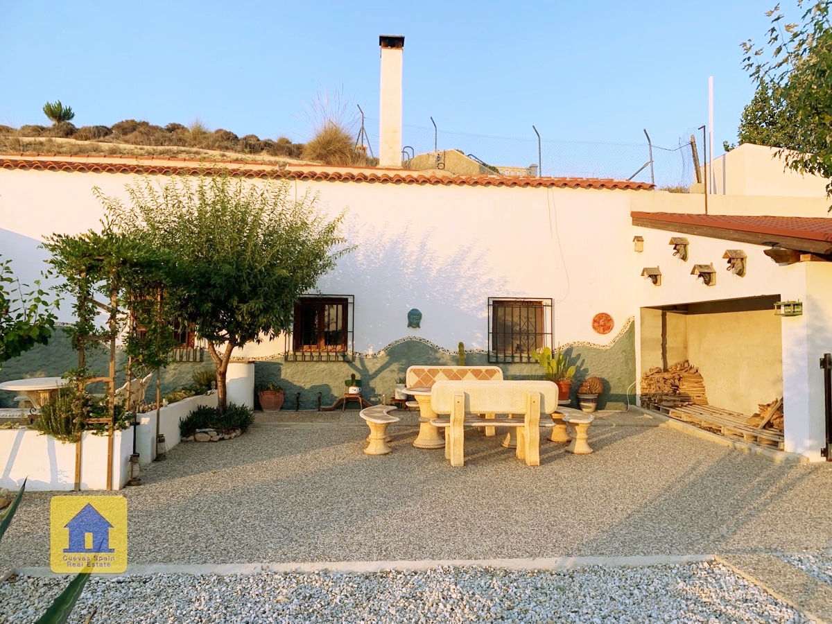 La gran zona de asientos al aire libre tiene cinco secciones: tres con sombra y dos sin ella. Las tres zonas de asientos ofrecen múltiples espacios para reuniones sociales o espacios privados. La zona de asientos central está equipada con puertas para perros y dos espaciosas casetas para perros. Las paredes del patio están decoradas con una delicada cinta de cristal de colores. A lo largo de la pared exterior del taller hay un almacén de leña. Desde el patio principal, un camino antideslizante te lleva al nivel inferior donde hay un huerto y dos cuevas sin terminar con un patio. Una escalera le lleva a un huerto con olivos, vides y un gran almendro que produce masas de almendras. Los patios ofrecen unas magníficas vistas de la puesta de sol sobre la ciudad de Huéscar y la catedral del siglo XVI iluminada por la noche.