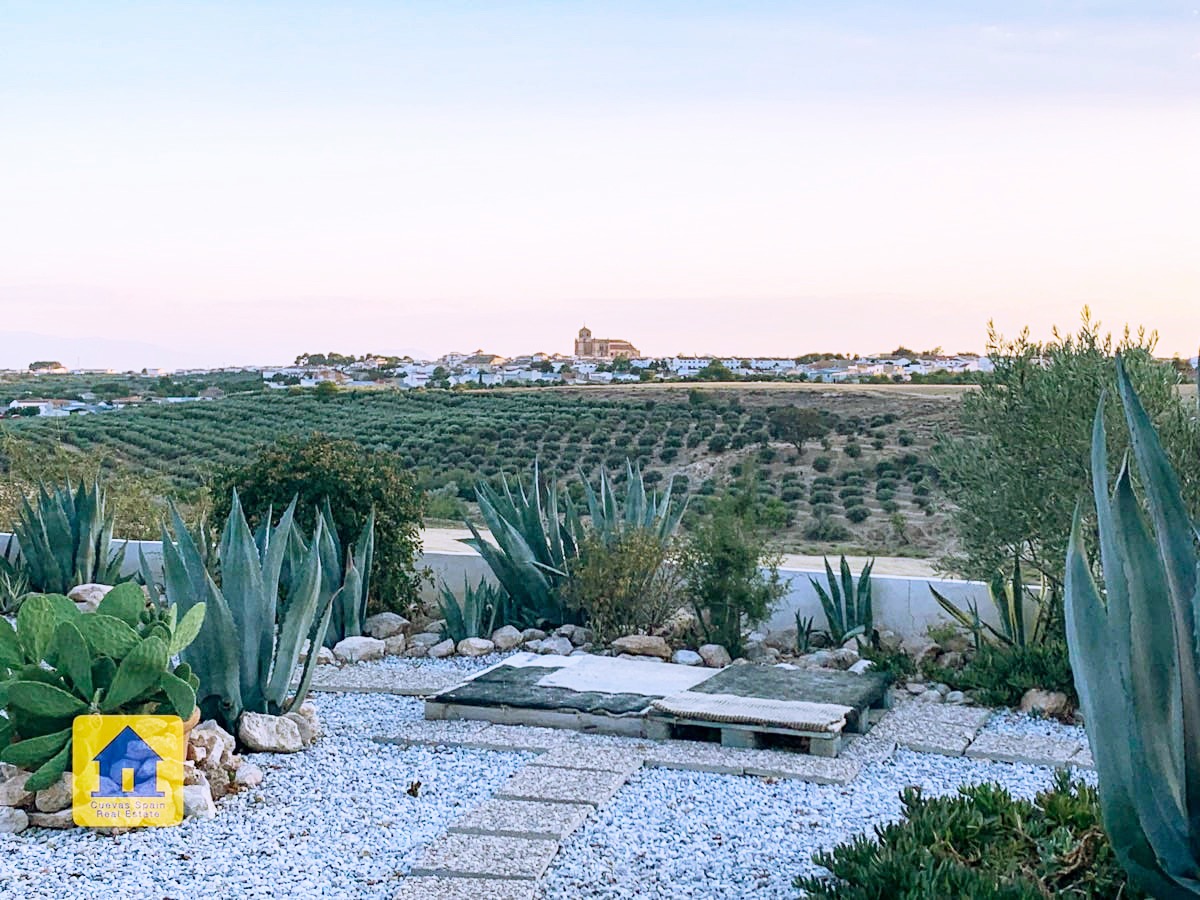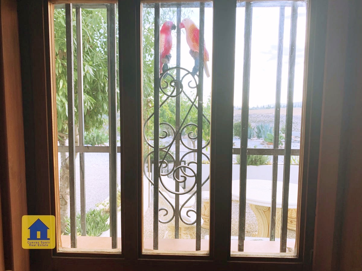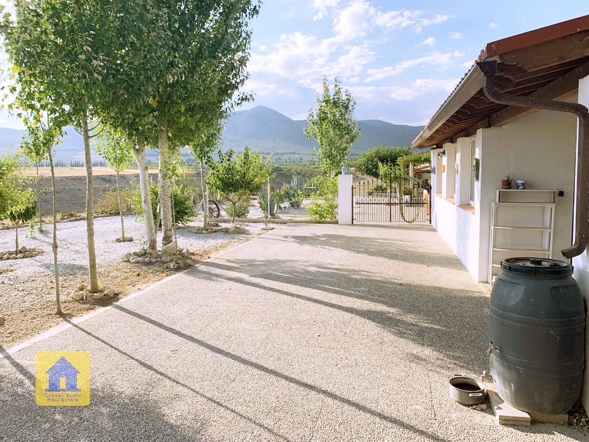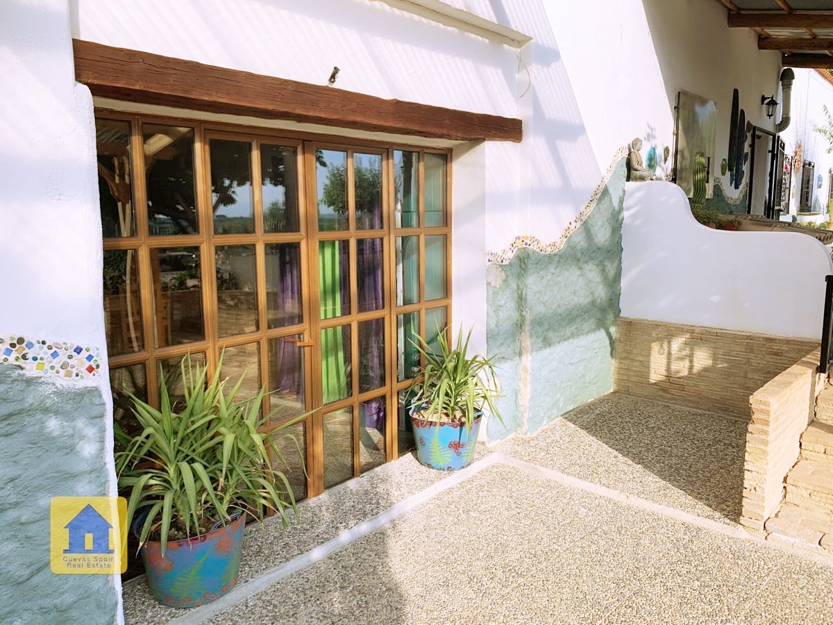 La gran zona de asientos al aire libre tiene cinco secciones: tres con sombra y dos sin ella. Las tres zonas de asientos ofrecen múltiples espacios para reuniones sociales o espacios privados. La zona de asientos central está equipada con puertas para perros y dos espaciosas casetas para perros. Las paredes del patio están decoradas con una delicada cinta de cristal de colores. A lo largo de la pared exterior del taller hay un almacén de leña. Desde el patio principal, un camino antideslizante te lleva al nivel inferior donde hay un huerto y dos cuevas sin terminar con un patio. Una escalera le lleva a un huerto con olivos, vides y un gran almendro que produce masas de almendras. Los patios ofrecen unas magníficas vistas de la puesta de sol sobre la ciudad de Huéscar y la catedral del siglo XVI iluminada por la noche.