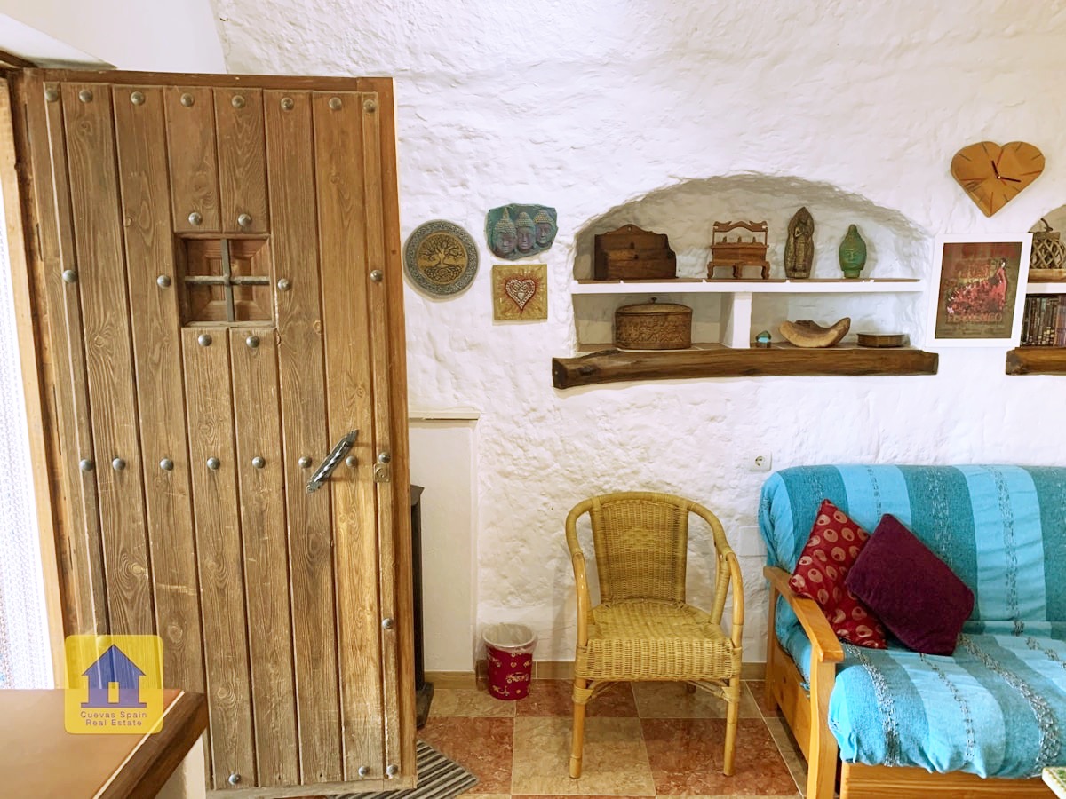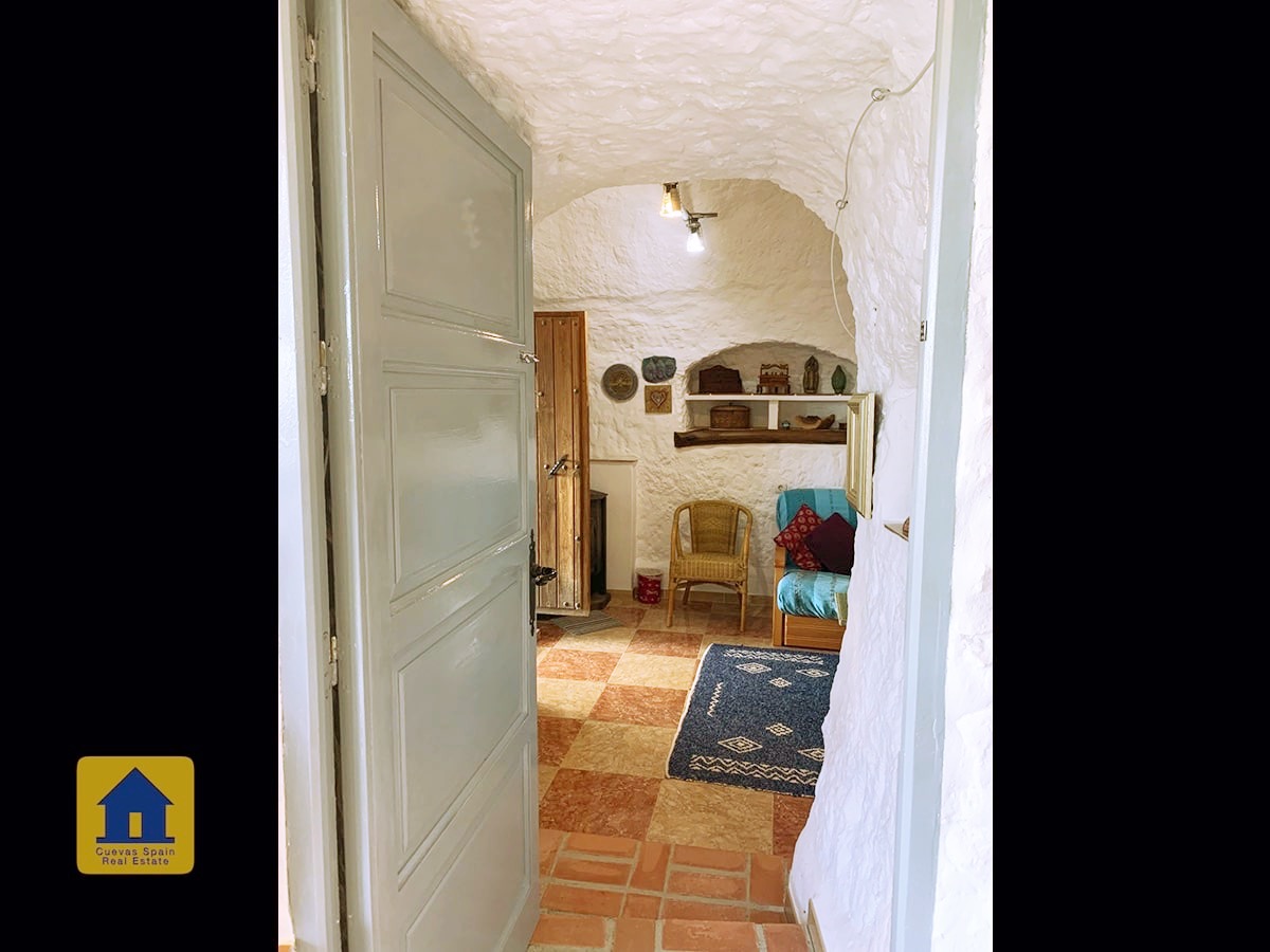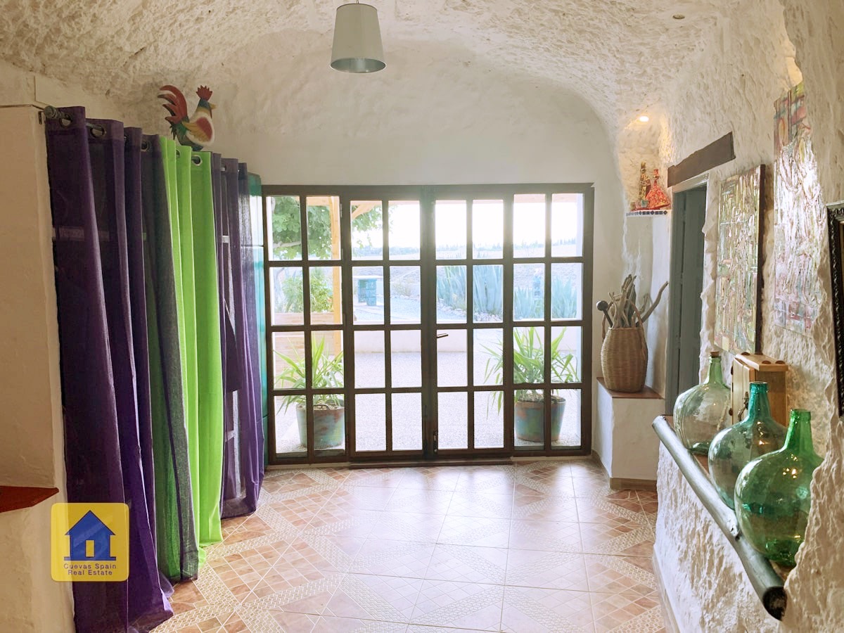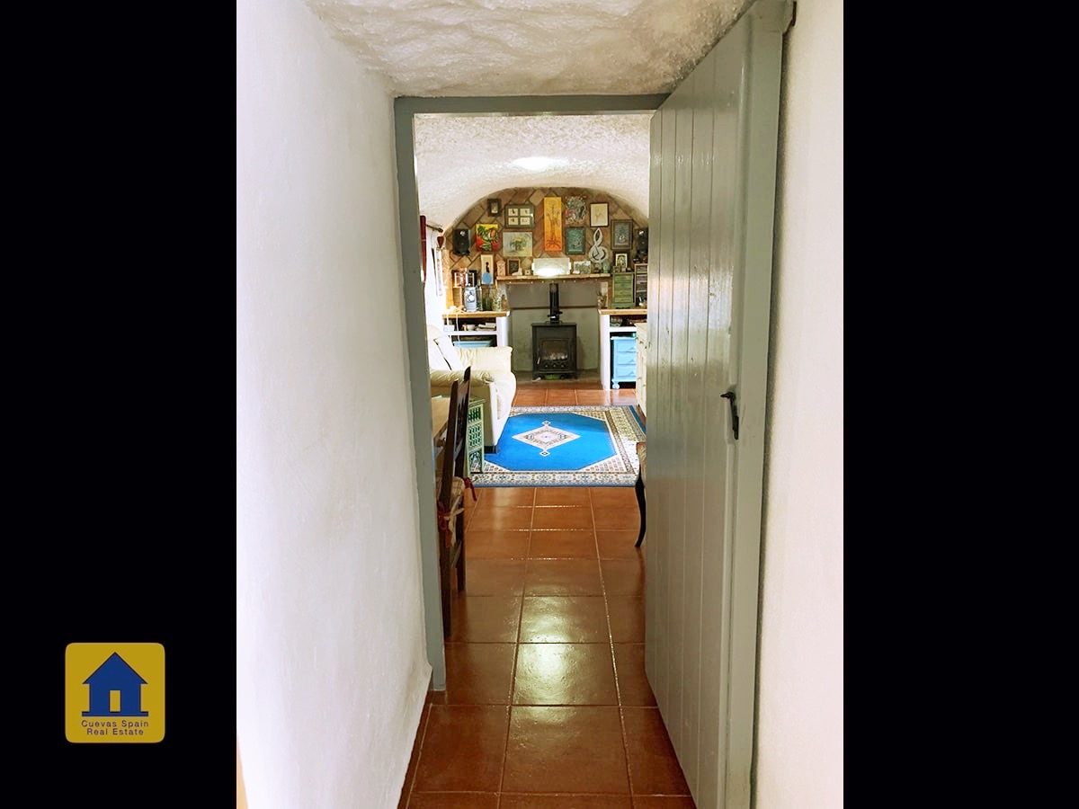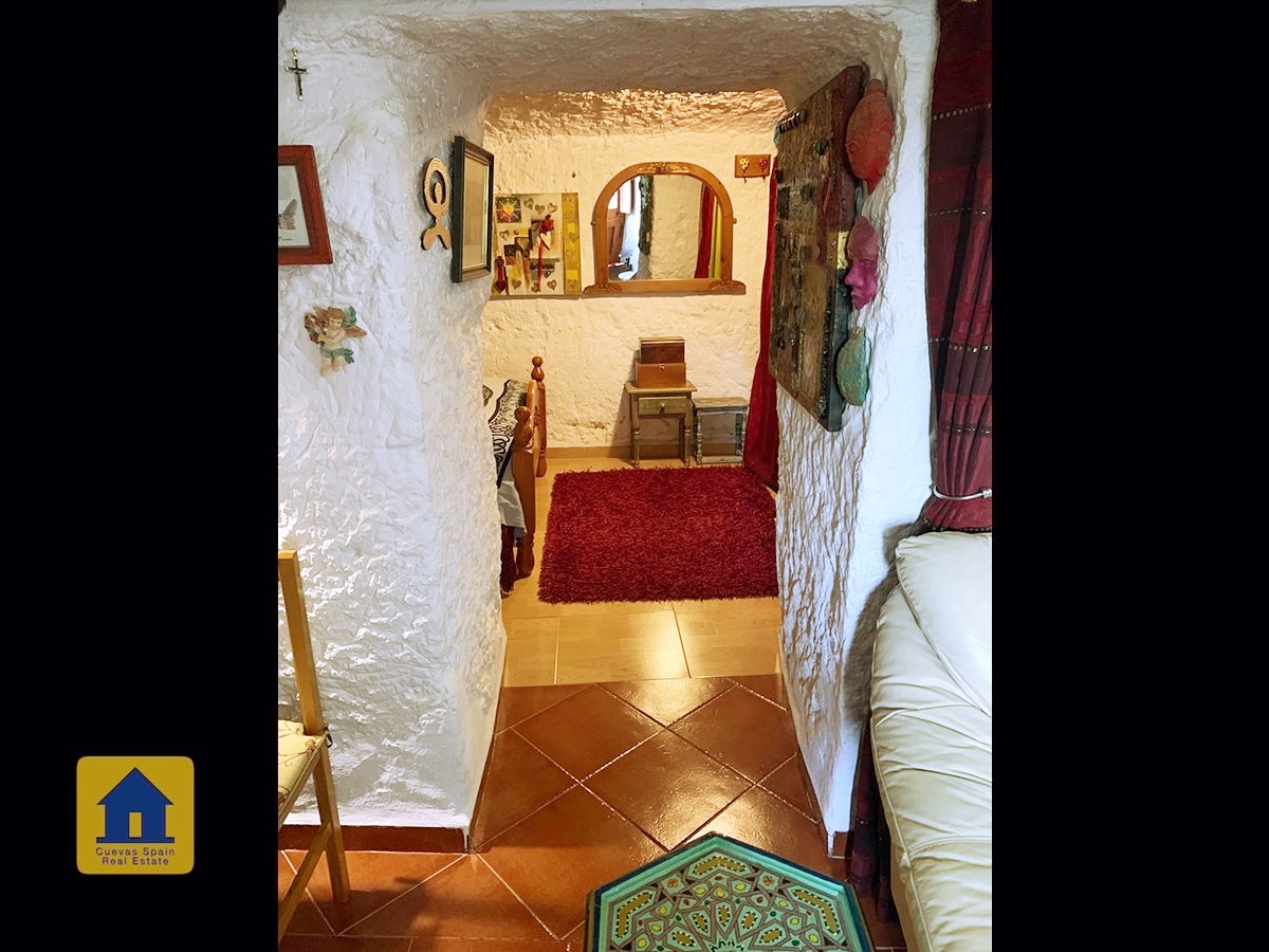 La entrada principal a la cueva es a través de puertas francesas de madera que se abren al comedor/salón construido en la montaña. Los cuatro paneles de puertas de cristal transforman este impresionante espacio en un oasis de paz lleno de luz. Esta sala incluye un comedor formal con una barra incorporada en la parte delantera, y en la parte trasera una zona de estar elevada con estantes arqueados y una estufa de leña. Los suelos están revestidos de los característicos azulejos españoles. En el lado derecho de la sala de estar se pasa a través de un armario de entrada, a continuación, hasta unos pocos pasos en un pasillo / lavadero, a continuación, en la cocina de azulejos bellamente designado con un montón de espacio en el mostrador y el gabinete. Una puerta frontal conduce al exterior, al patio central. A un lado de la cocina hay un cuarto de baño con mueble de cristal, ducha de cristal y azulejos, y una ventana (con gatera). A través de la cocina hay un salón con una estufa de leña. Los suelos de la cocina y el salón son de baldosas de terracota. A la izquierda del salón hay un dormitorio doble con paredes de cueva tradicionales talladas a mano en la roca, incluyendo armarios de almacenamiento. A través del salón hay un pasillo con almacenamiento y un pequeño dormitorio con almacenamiento y un escritorio. Ambos dormitorios están alicatados con baldosas de efecto madera.