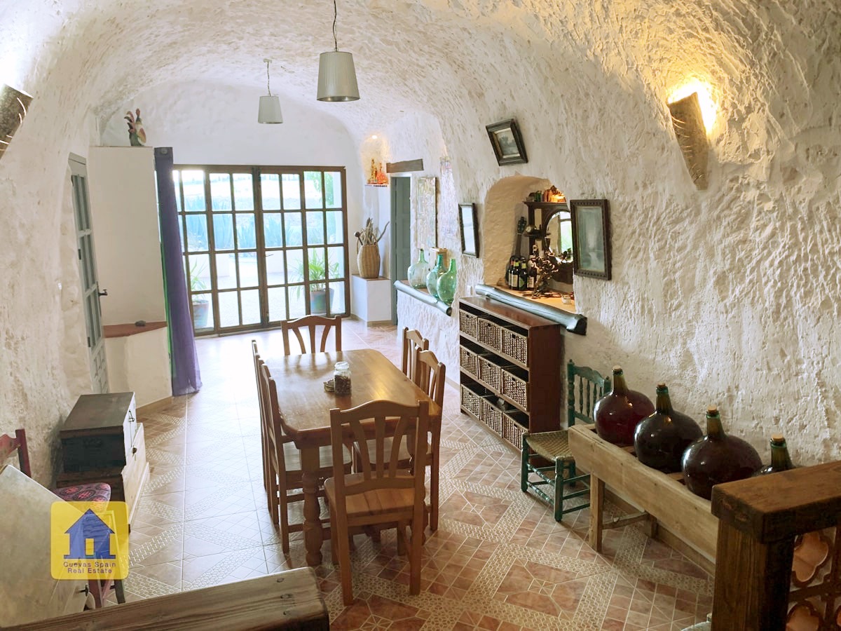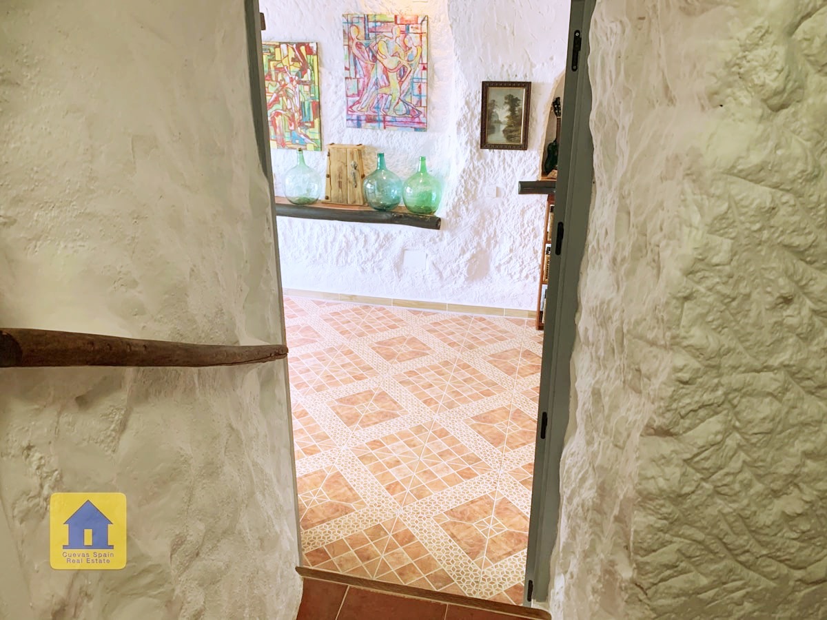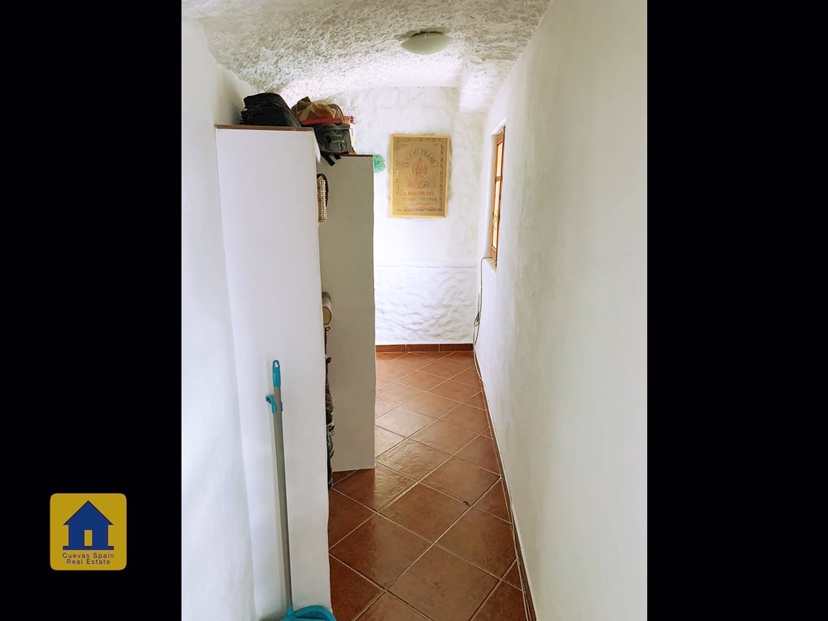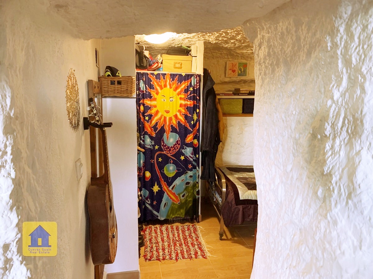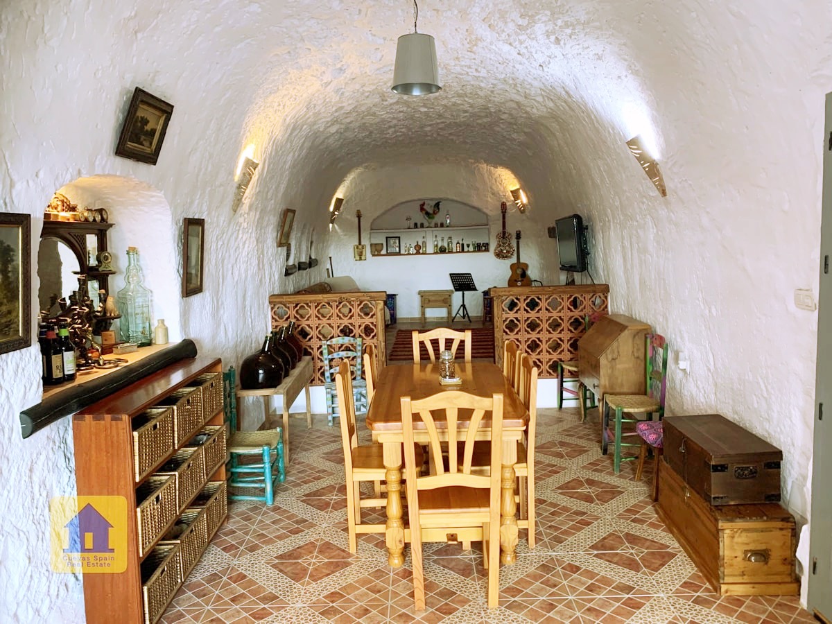 La entrada principal a la cueva es a través de puertas francesas de madera que se abren al comedor/salón construido en la montaña. Los cuatro paneles de puertas de cristal transforman este impresionante espacio en un oasis de paz lleno de luz. Esta sala incluye un comedor formal con una barra incorporada en la parte delantera, y en la parte trasera una zona de estar elevada con estantes arqueados y una estufa de leña. Los suelos están revestidos de los característicos azulejos españoles. En el lado derecho de la sala de estar se pasa a través de un armario de entrada, a continuación, hasta unos pocos pasos en un pasillo / lavadero, a continuación, en la cocina de azulejos bellamente designado con un montón de espacio en el mostrador y el gabinete. Una puerta frontal conduce al exterior, al patio central. A un lado de la cocina hay un cuarto de baño con mueble de cristal, ducha de cristal y azulejos, y una ventana (con gatera). A través de la cocina hay un salón con una estufa de leña. Los suelos de la cocina y el salón son de baldosas de terracota. A la izquierda del salón hay un dormitorio doble con paredes de cueva tradicionales talladas a mano en la roca, incluyendo armarios de almacenamiento. A través del salón hay un pasillo con almacenamiento y un pequeño dormitorio con almacenamiento y un escritorio. Ambos dormitorios están alicatados con baldosas de efecto madera.
