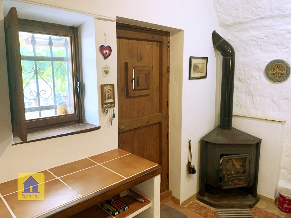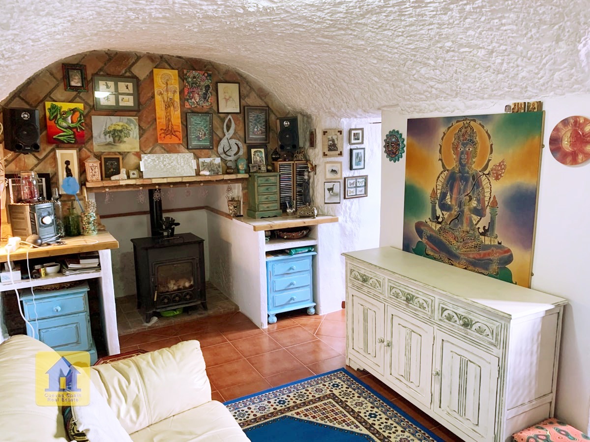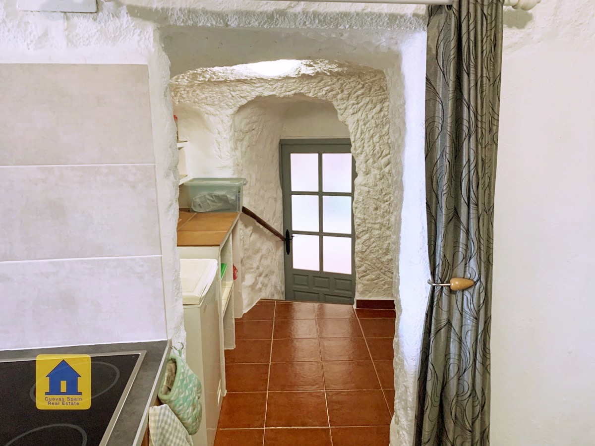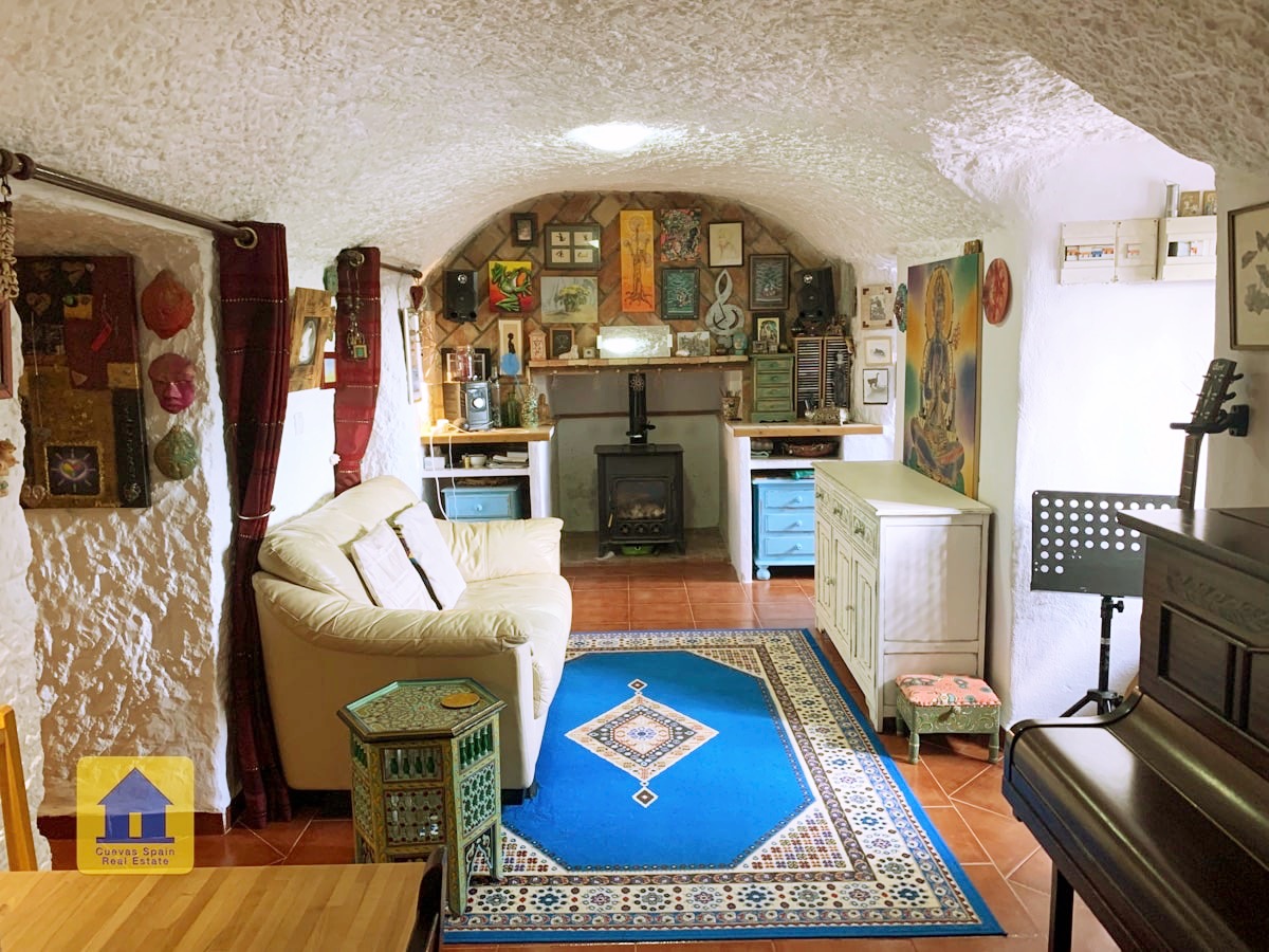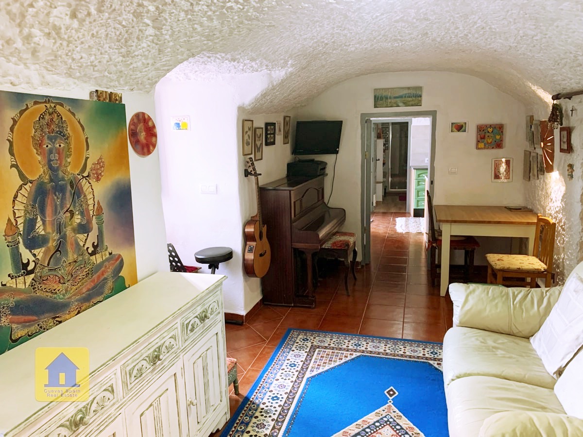 La entrada principal a la cueva es a través de puertas francesas de madera que se abren al comedor/salón construido en la montaña. Los cuatro paneles de puertas de cristal transforman este impresionante espacio en un oasis de paz lleno de luz. Esta sala incluye un comedor formal con una barra incorporada en la parte delantera, y en la parte trasera una zona de estar elevada con estantes arqueados y una estufa de leña. Los suelos están revestidos de los característicos azulejos españoles. En el lado derecho de la sala de estar se pasa a través de un armario de entrada, a continuación, hasta unos pocos pasos en un pasillo / lavadero, a continuación, en la cocina de azulejos bellamente designado con un montón de espacio en el mostrador y el gabinete. Una puerta frontal conduce al exterior, al patio central. A un lado de la cocina hay un cuarto de baño con mueble de cristal, ducha de cristal y azulejos, y una ventana (con gatera). A través de la cocina hay un salón con una estufa de leña. Los suelos de la cocina y el salón son de baldosas de terracota. A la izquierda del salón hay un dormitorio doble con paredes de cueva tradicionales talladas a mano en la roca, incluyendo armarios de almacenamiento. A través del salón hay un pasillo con almacenamiento y un pequeño dormitorio con almacenamiento y un escritorio. Ambos dormitorios están alicatados con baldosas de efecto madera.