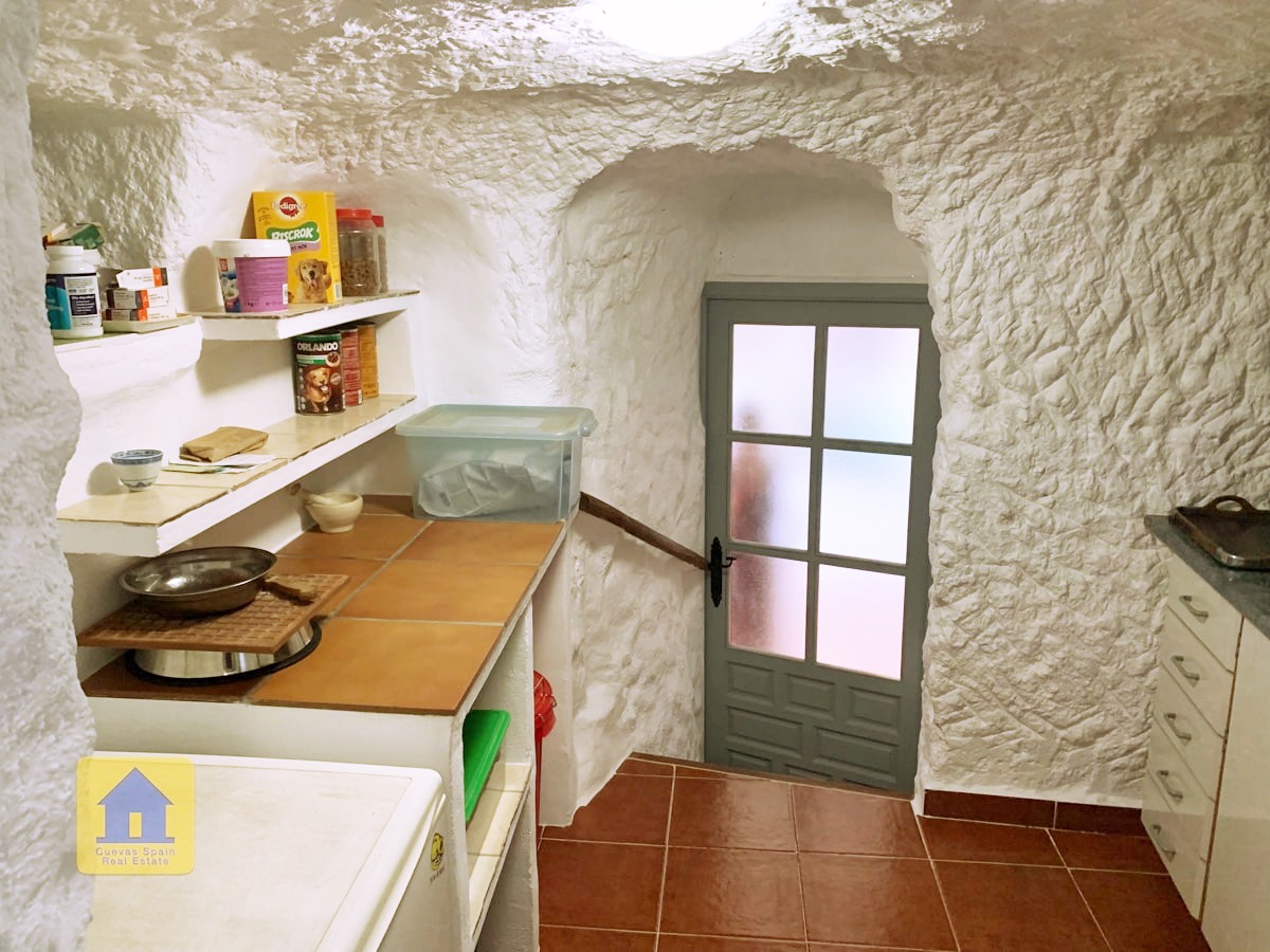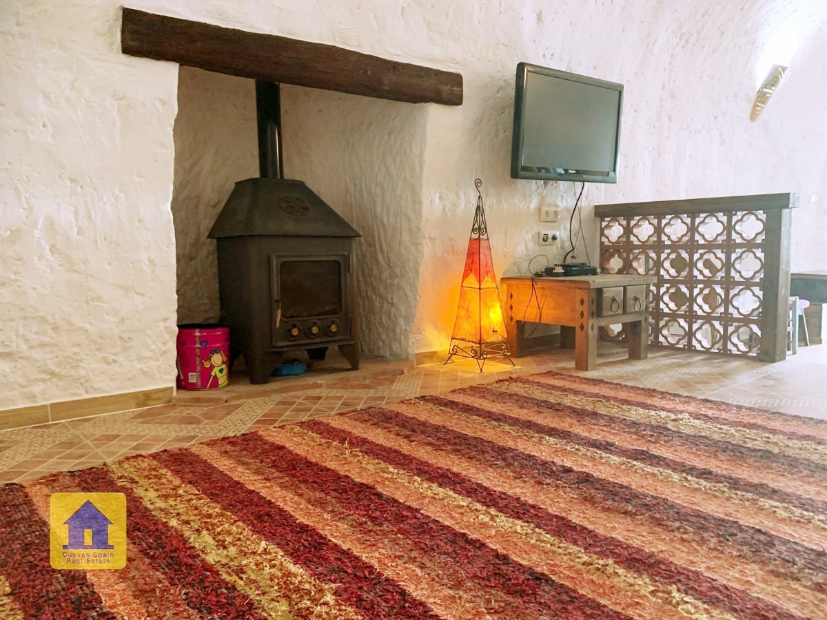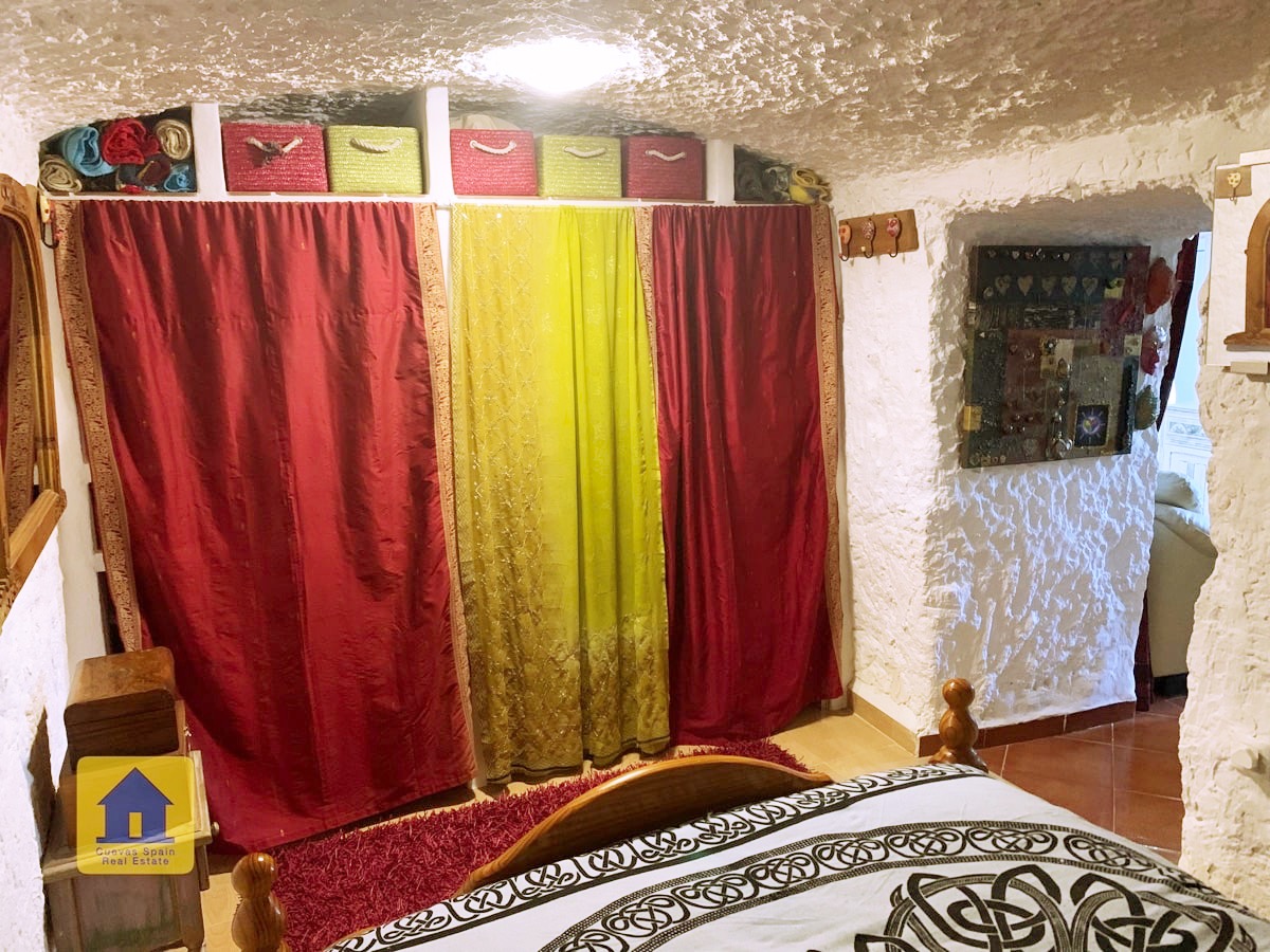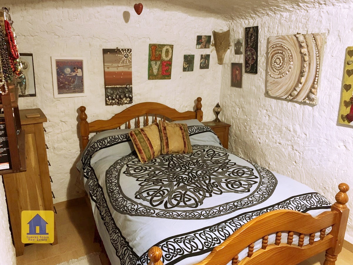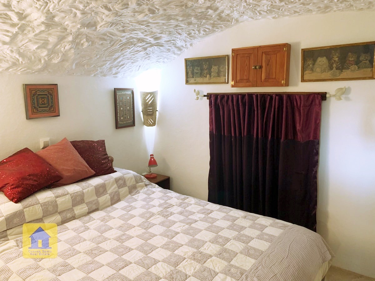 La entrada principal a la cueva es a través de puertas francesas de madera que se abren al comedor/salón construido en la montaña. Los cuatro paneles de puertas de cristal transforman este impresionante espacio en un oasis de paz lleno de luz. Esta sala incluye un comedor formal con una barra incorporada en la parte delantera, y en la parte trasera una zona de estar elevada con estantes arqueados y una estufa de leña. Los suelos están revestidos de los característicos azulejos españoles. En el lado derecho de la sala de estar se pasa a través de un armario de entrada, a continuación, hasta unos pocos pasos en un pasillo / lavadero, a continuación, en la cocina de azulejos bellamente designado con un montón de espacio en el mostrador y el gabinete. Una puerta frontal conduce al exterior, al patio central. A un lado de la cocina hay un cuarto de baño con mueble de cristal, ducha de cristal y azulejos, y una ventana (con gatera). A través de la cocina hay un salón con una estufa de leña. Los suelos de la cocina y el salón son de baldosas de terracota. A la izquierda del salón hay un dormitorio doble con paredes de cueva tradicionales talladas a mano en la roca, incluyendo armarios de almacenamiento. A través del salón hay un pasillo con almacenamiento y un pequeño dormitorio con almacenamiento y un escritorio. Ambos dormitorios están alicatados con baldosas de efecto madera.