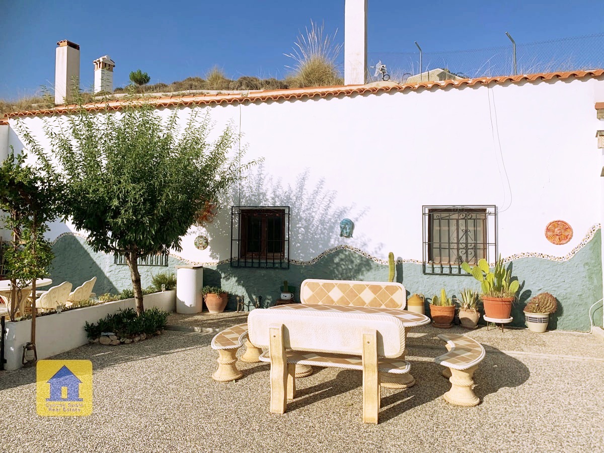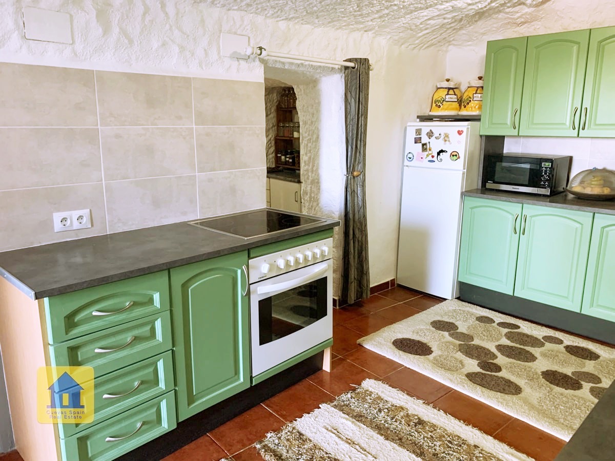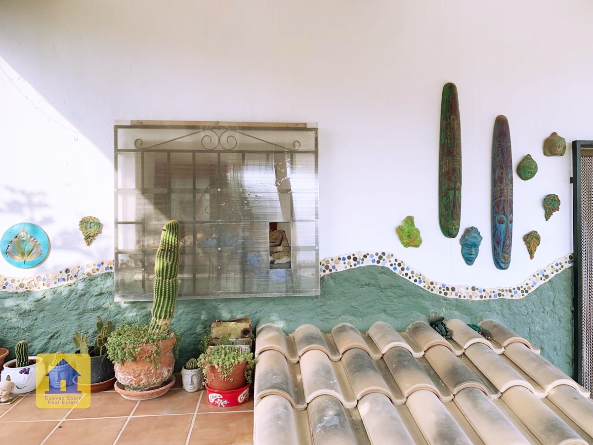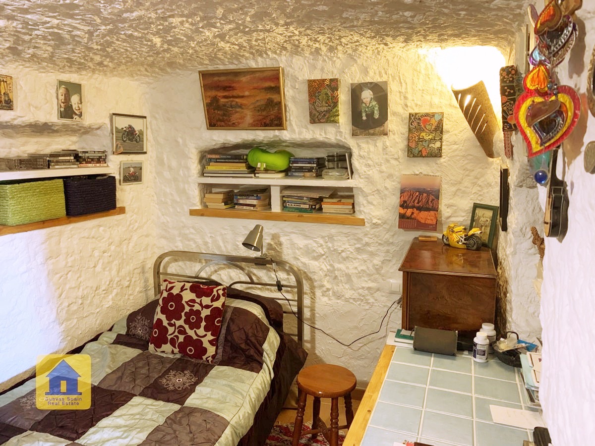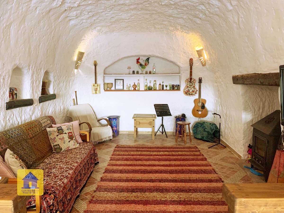 La entrada principal a la cueva es a través de puertas francesas de madera que se abren al comedor/salón construido en la montaña. Los cuatro paneles de puertas de cristal transforman este impresionante espacio en un oasis de paz lleno de luz. Esta sala incluye un comedor formal con una barra incorporada en la parte delantera, y en la parte trasera una zona de estar elevada con estantes arqueados y una estufa de leña. Los suelos están revestidos de los característicos azulejos españoles. En el lado derecho de la sala de estar se pasa a través de un armario de entrada, a continuación, hasta unos pocos pasos en un pasillo / lavadero, a continuación, en la cocina de azulejos bellamente designado con un montón de espacio en el mostrador y el gabinete. Una puerta frontal conduce al exterior, al patio central. A un lado de la cocina hay un cuarto de baño con mueble de cristal, ducha de cristal y azulejos, y una ventana (con gatera). A través de la cocina hay un salón con una estufa de leña. Los suelos de la cocina y el salón son de baldosas de terracota. A la izquierda del salón hay un dormitorio doble con paredes de cueva tradicionales talladas a mano en la roca, incluyendo armarios de almacenamiento. A través del salón hay un pasillo con almacenamiento y un pequeño dormitorio con almacenamiento y un escritorio. Ambos dormitorios están alicatados con baldosas de efecto madera.