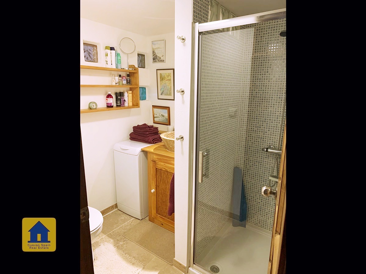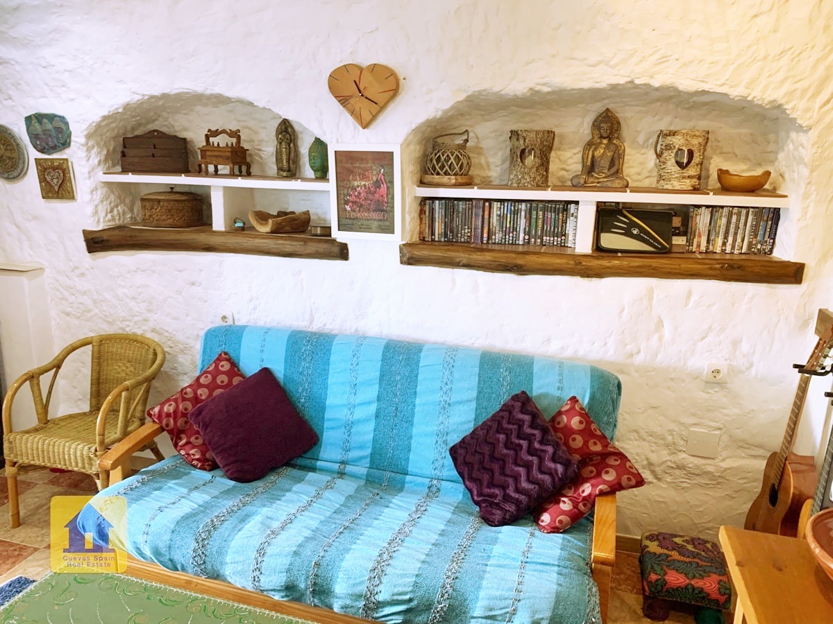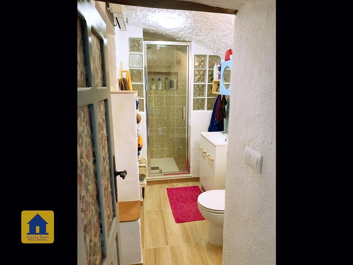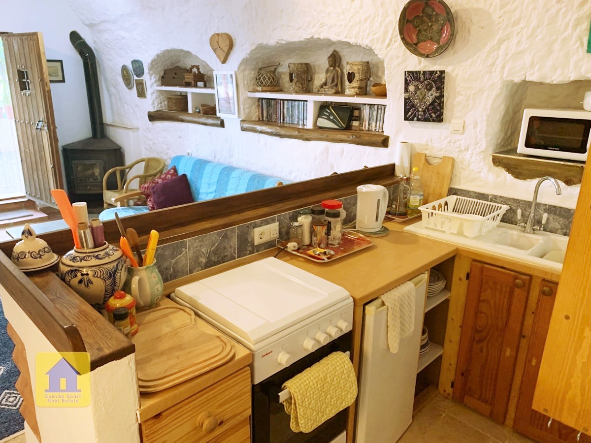 El piso cueva tiene su propia zona de estar al aire libre al final del patio. Se entra en el encantador salón a través de una puerta de madera tradicional andaluza. Hay una estufa de leña y una cocina compacta completa. Un corto pasillo conduce al dormitorio doble y al baño. El baño tiene bloques de vidrio y una ducha de vidrio y azulejos. El pasillo está revestido de estanterías de azulejos que continúan hasta el dormitorio. El techo del dormitorio está tallado a mano con un creativo diseño en forma de remolino.