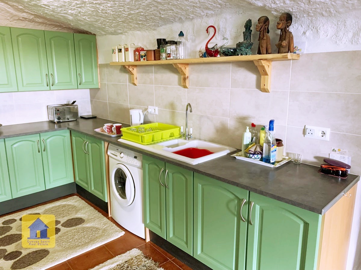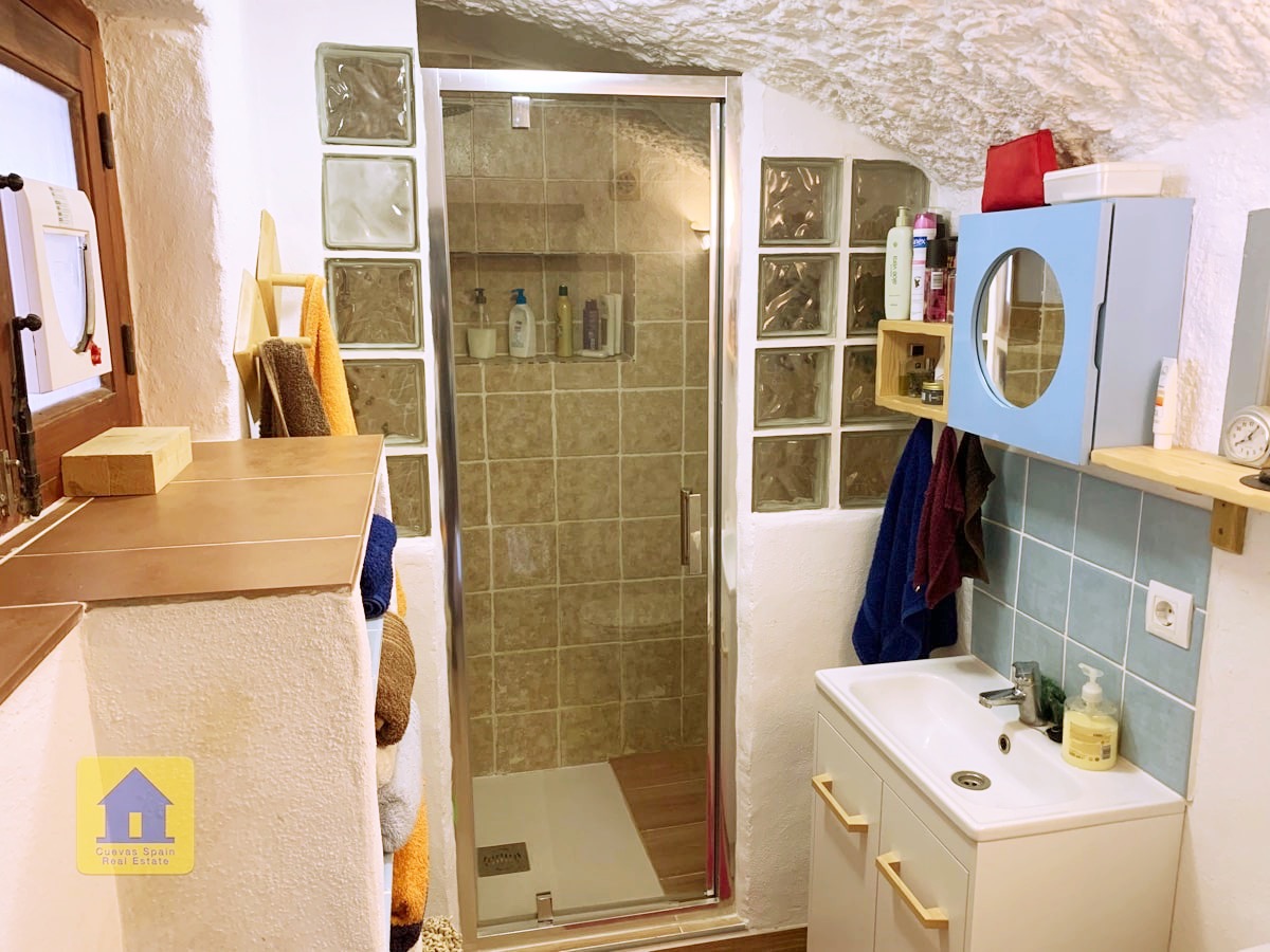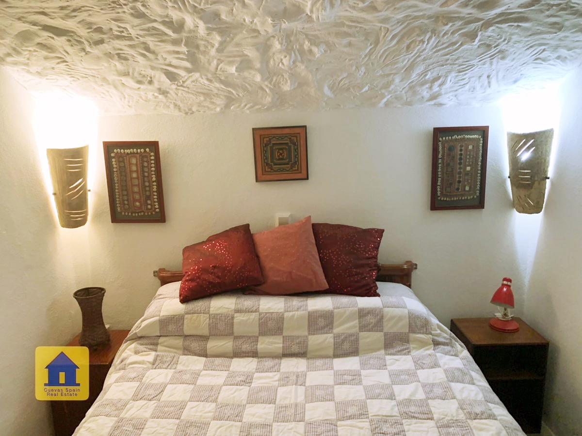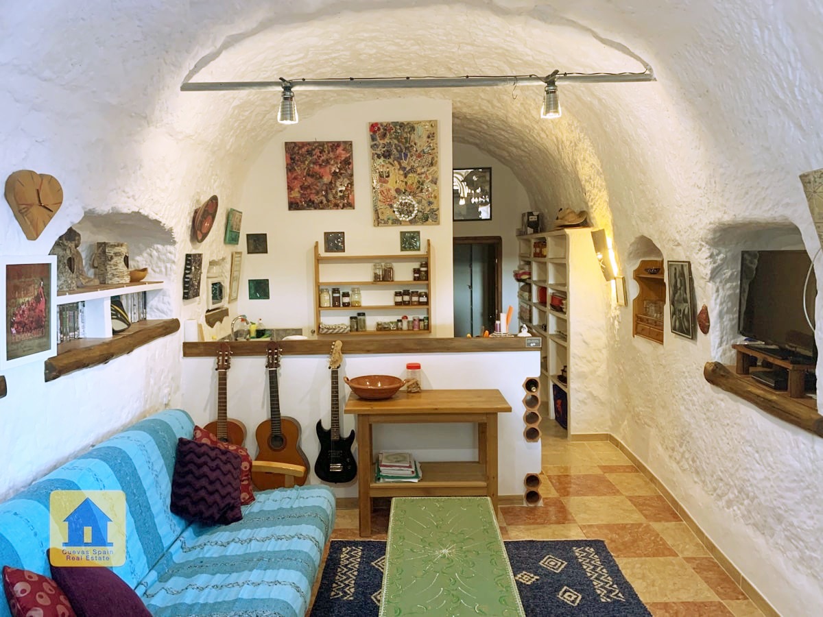 El piso cueva tiene su propia zona de estar al aire libre al final del patio. Se entra en el encantador salón a través de una puerta de madera tradicional andaluza. Hay una estufa de leña y una cocina compacta completa. Un corto pasillo conduce al dormitorio doble y al baño. El baño tiene bloques de vidrio y una ducha de vidrio y azulejos. El pasillo está revestido de estanterías de azulejos que continúan hasta el dormitorio. El techo del dormitorio está tallado a mano con un creativo diseño en forma de remolino.