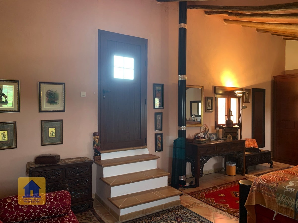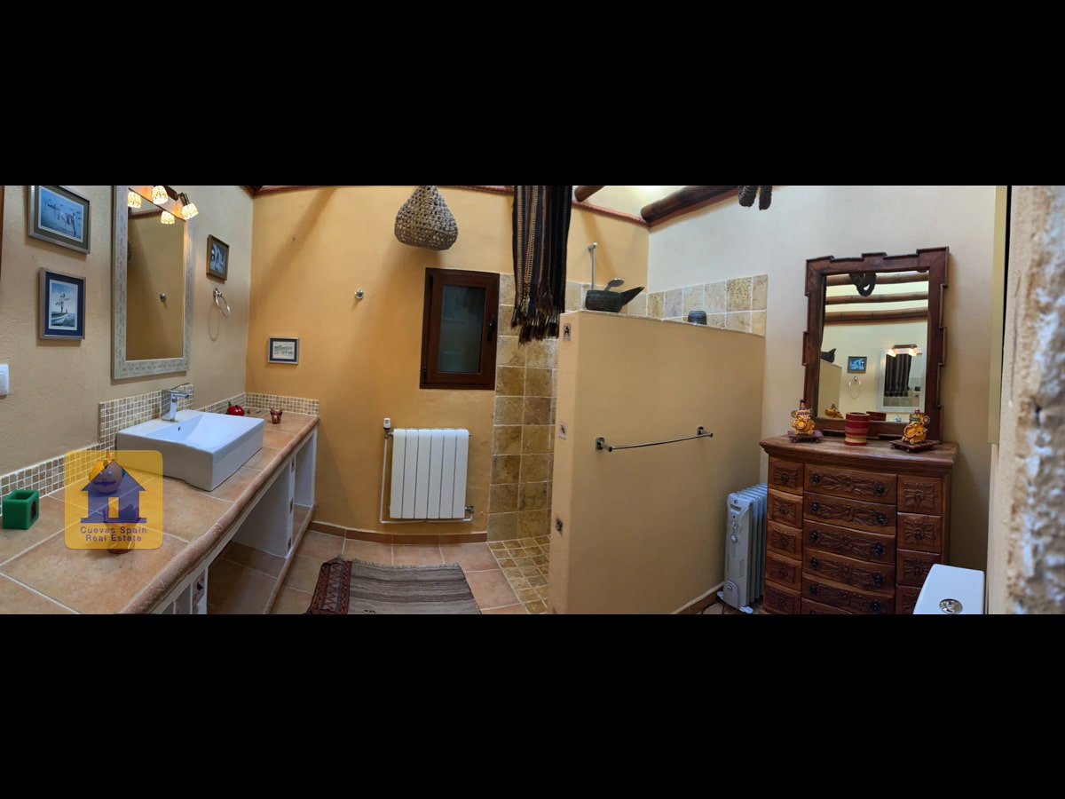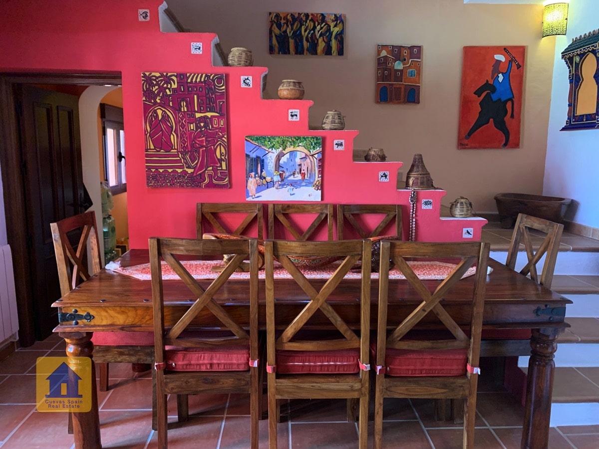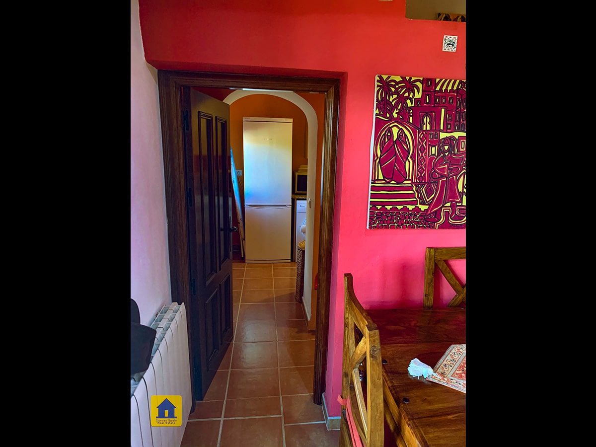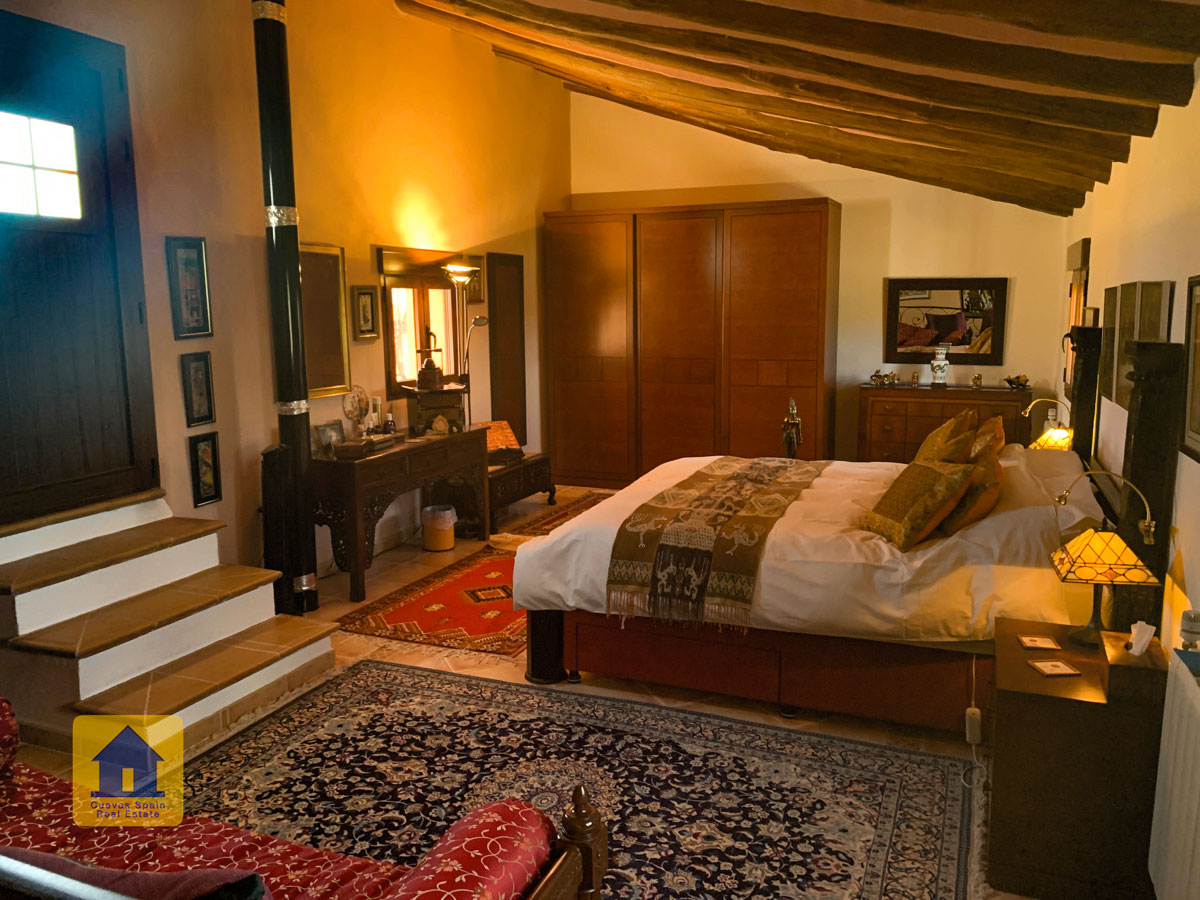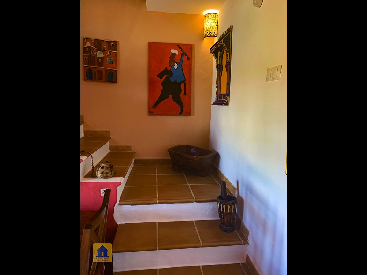 En entrant dans la maison, on arrive dans un hall d'entrée spacieux avec deux coins salon et une demi-salle de bain pour les invités. À gauche se trouve la partie de la maison en dépendance avec des poutres en bois et des plafonds en yeso. Le salon est spacieux, confortable et lumineux. Une véranda s'ouvre sur le jardin arrière par des portes coulissantes à double vitrage et comporte un bar en bois de teck personnalisé pour les réceptions. La grande cuisine moderne est équipée et finie de manière exquise. Depuis la cuisine, un couloir mène aux suites de la cave. La salle à manger intérieure s'ouvre sur un patio extérieur dans le jardin arrière. Un poêle à bois est placé entre la cuisine et la salle à manger, de sorte que son tuyau chauffe la chambre principale située au-dessus. La buanderie est entièrement équipée et comporte des armoires murales. Un escalier mène à la chambre principale avec sa superbe salle de bains attenante qui comprend une vaste douche carrelée et une baignoire brillamment positionnée pour donner sur la campagne. La porte de la chambre donne accès à une petite terrasse sur le toit, avec un coin salon ombragé et un chemin menant au cercle de battage et au banc d'observation pour admirer les couchers de soleil sur l'Altiplano. Au-delà de l'aire de battage se trouve l'oliveraie.