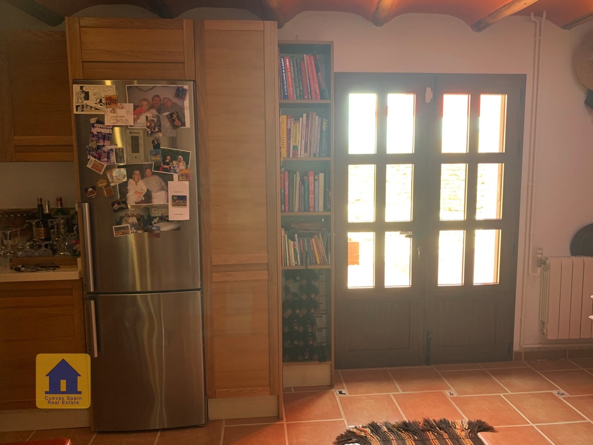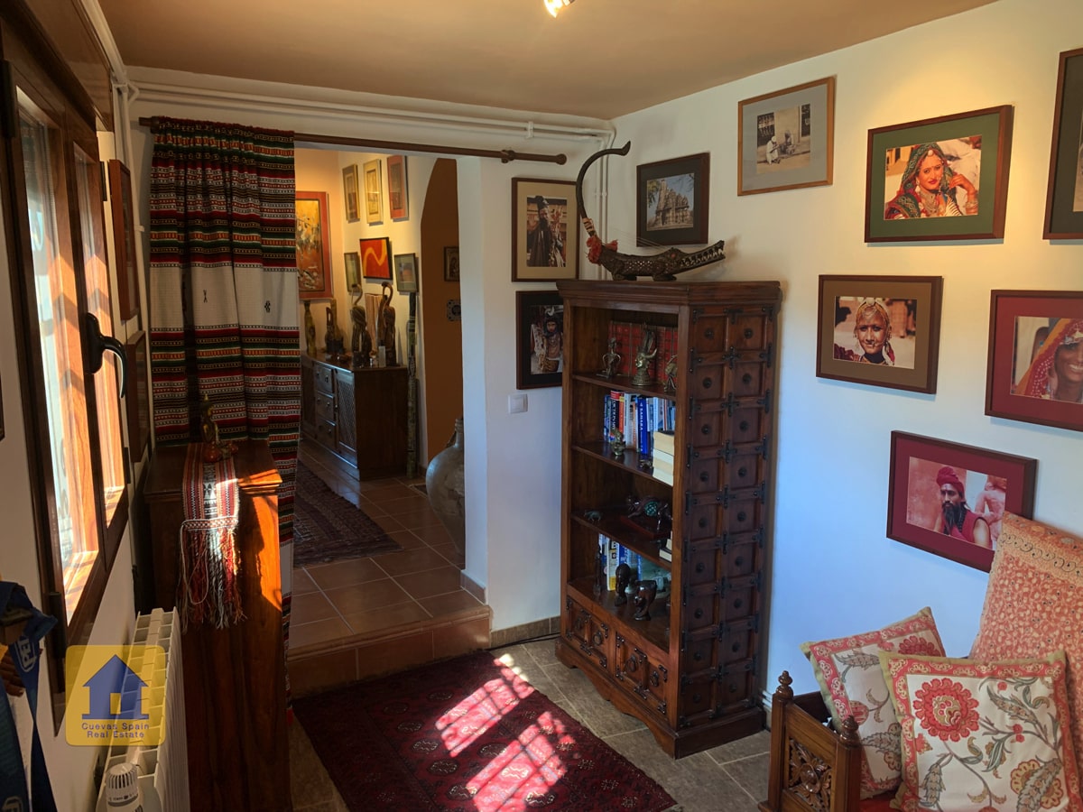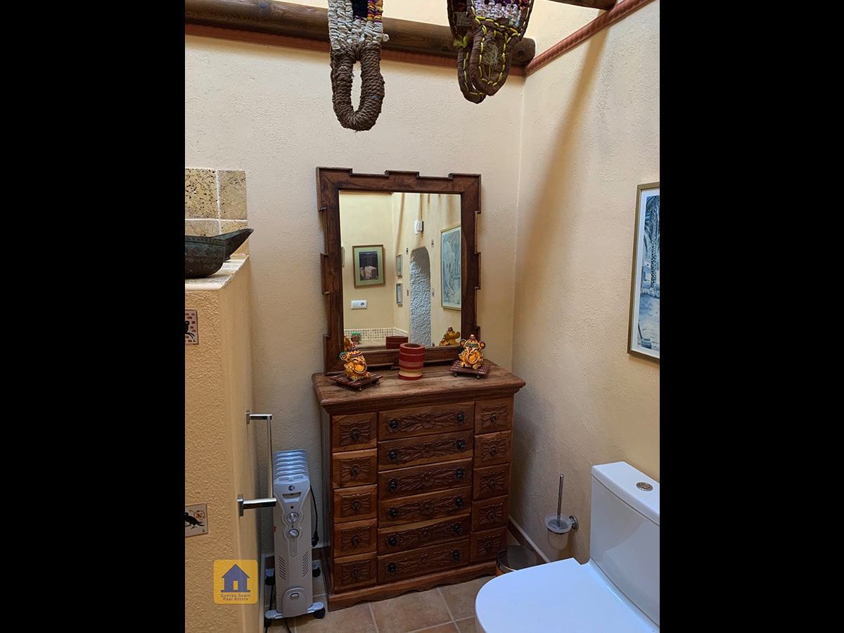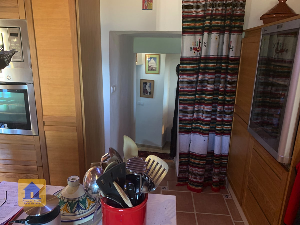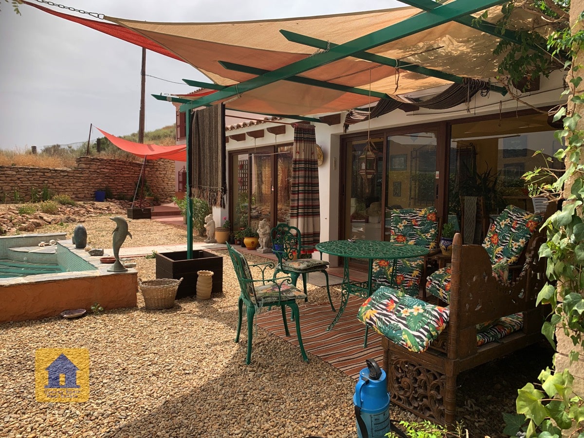 En entrant dans la maison, on arrive dans un hall d'entrée spacieux avec deux coins salon et une demi-salle de bain pour les invités. À gauche se trouve la partie de la maison en dépendance avec des poutres en bois et des plafonds en yeso. Le salon est spacieux, confortable et lumineux. Une véranda s'ouvre sur le jardin arrière par des portes coulissantes à double vitrage et comporte un bar en bois de teck personnalisé pour les réceptions. La grande cuisine moderne est équipée et finie de manière exquise. Depuis la cuisine, un couloir mène aux suites de la cave. La salle à manger intérieure s'ouvre sur un patio extérieur dans le jardin arrière. Un poêle à bois est placé entre la cuisine et la salle à manger, de sorte que son tuyau chauffe la chambre principale située au-dessus. La buanderie est entièrement équipée et comporte des armoires murales. Un escalier mène à la chambre principale avec sa superbe salle de bains attenante qui comprend une vaste douche carrelée et une baignoire brillamment positionnée pour donner sur la campagne. La porte de la chambre donne accès à une petite terrasse sur le toit, avec un coin salon ombragé et un chemin menant au cercle de battage et au banc d'observation pour admirer les couchers de soleil sur l'Altiplano. Au-delà de l'aire de battage se trouve l'oliveraie.