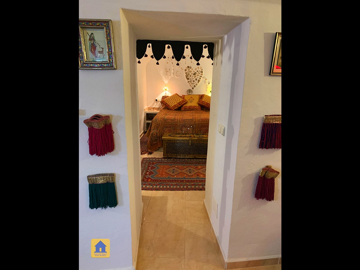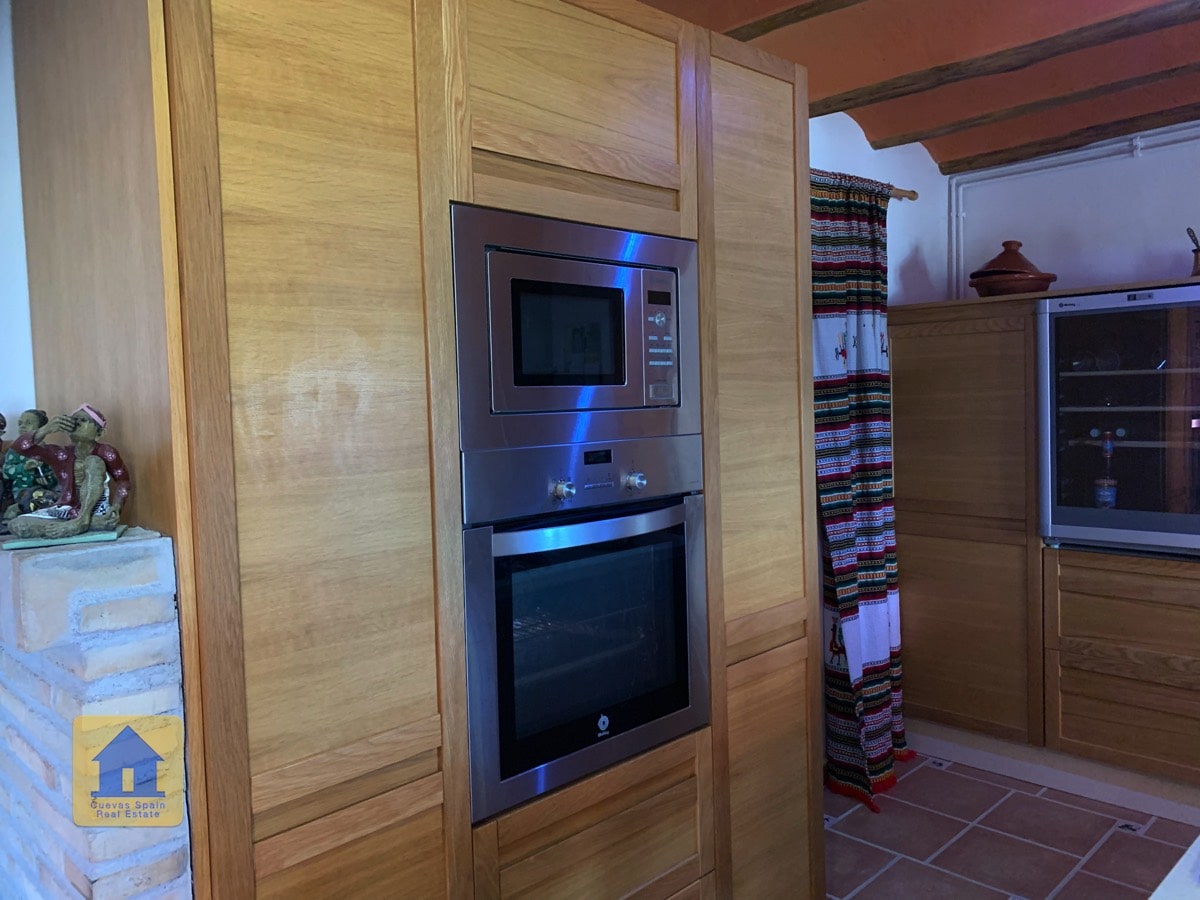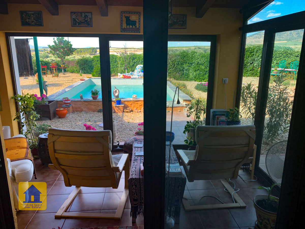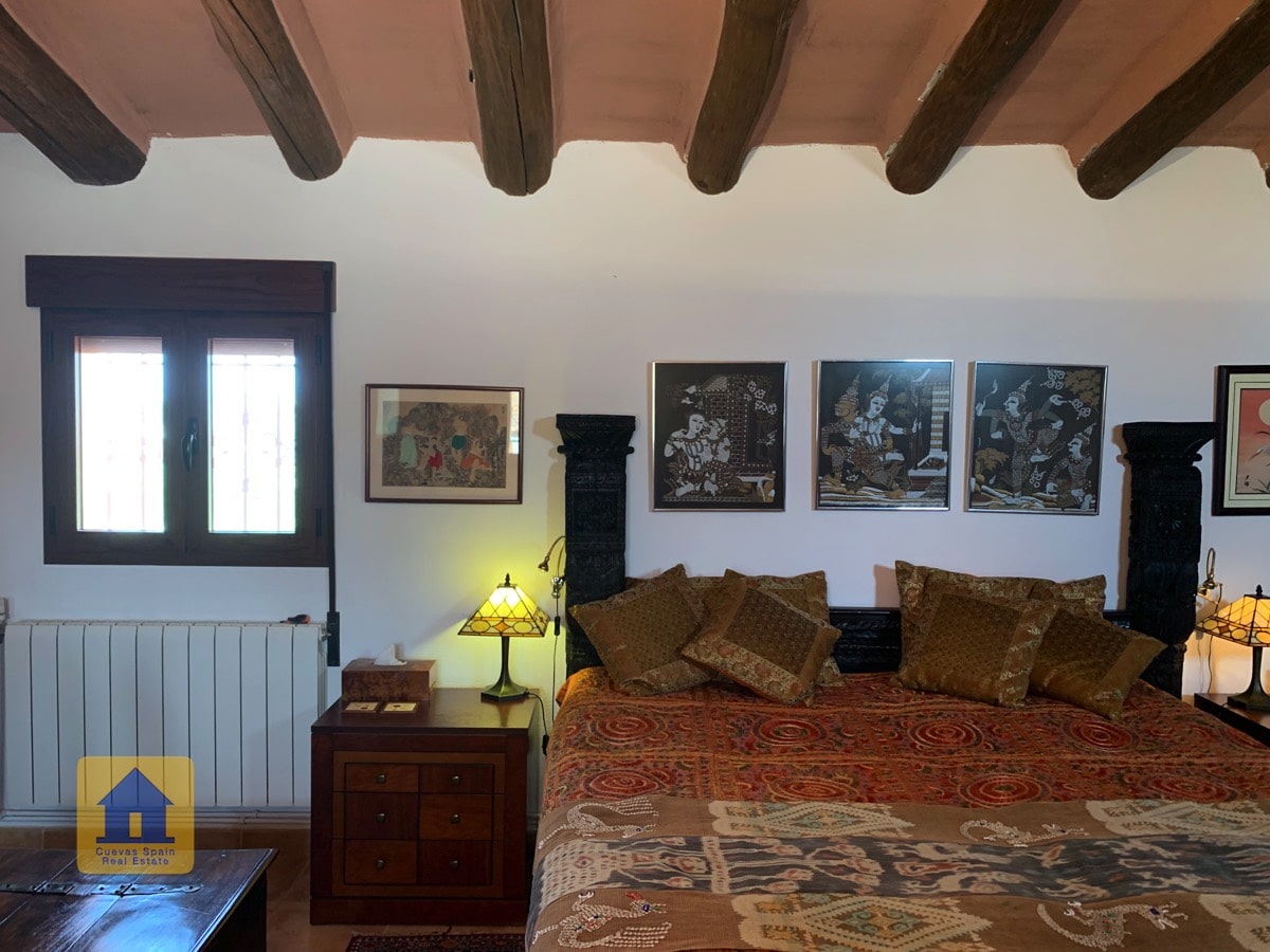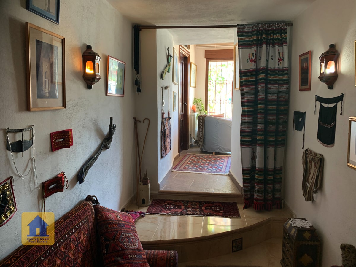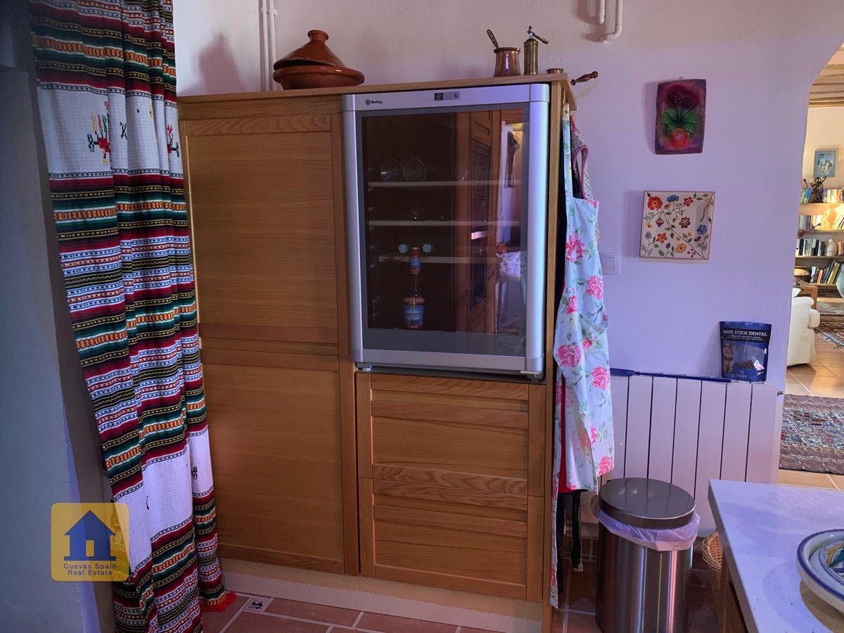 En entrant dans la maison, on arrive dans un hall d'entrée spacieux avec deux coins salon et une demi-salle de bain pour les invités. À gauche se trouve la partie de la maison en dépendance avec des poutres en bois et des plafonds en yeso. Le salon est spacieux, confortable et lumineux. Une véranda s'ouvre sur le jardin arrière par des portes coulissantes à double vitrage et comporte un bar en bois de teck personnalisé pour les réceptions. La grande cuisine moderne est équipée et finie de manière exquise. Depuis la cuisine, un couloir mène aux suites de la cave. La salle à manger intérieure s'ouvre sur un patio extérieur dans le jardin arrière. Un poêle à bois est placé entre la cuisine et la salle à manger, de sorte que son tuyau chauffe la chambre principale située au-dessus. La buanderie est entièrement équipée et comporte des armoires murales. Un escalier mène à la chambre principale avec sa superbe salle de bains attenante qui comprend une vaste douche carrelée et une baignoire brillamment positionnée pour donner sur la campagne. La porte de la chambre donne accès à une petite terrasse sur le toit, avec un coin salon ombragé et un chemin menant au cercle de battage et au banc d'observation pour admirer les couchers de soleil sur l'Altiplano. Au-delà de l'aire de battage se trouve l'oliveraie.