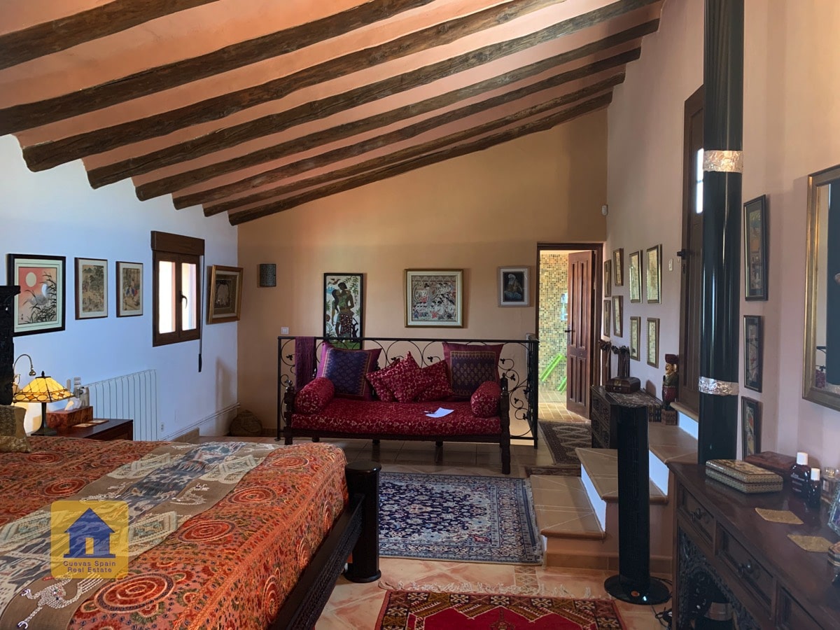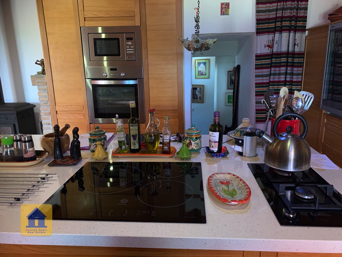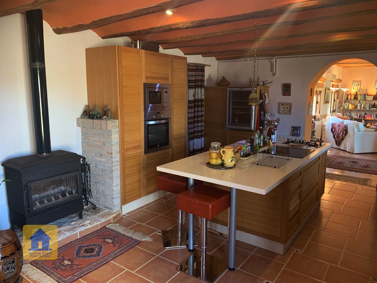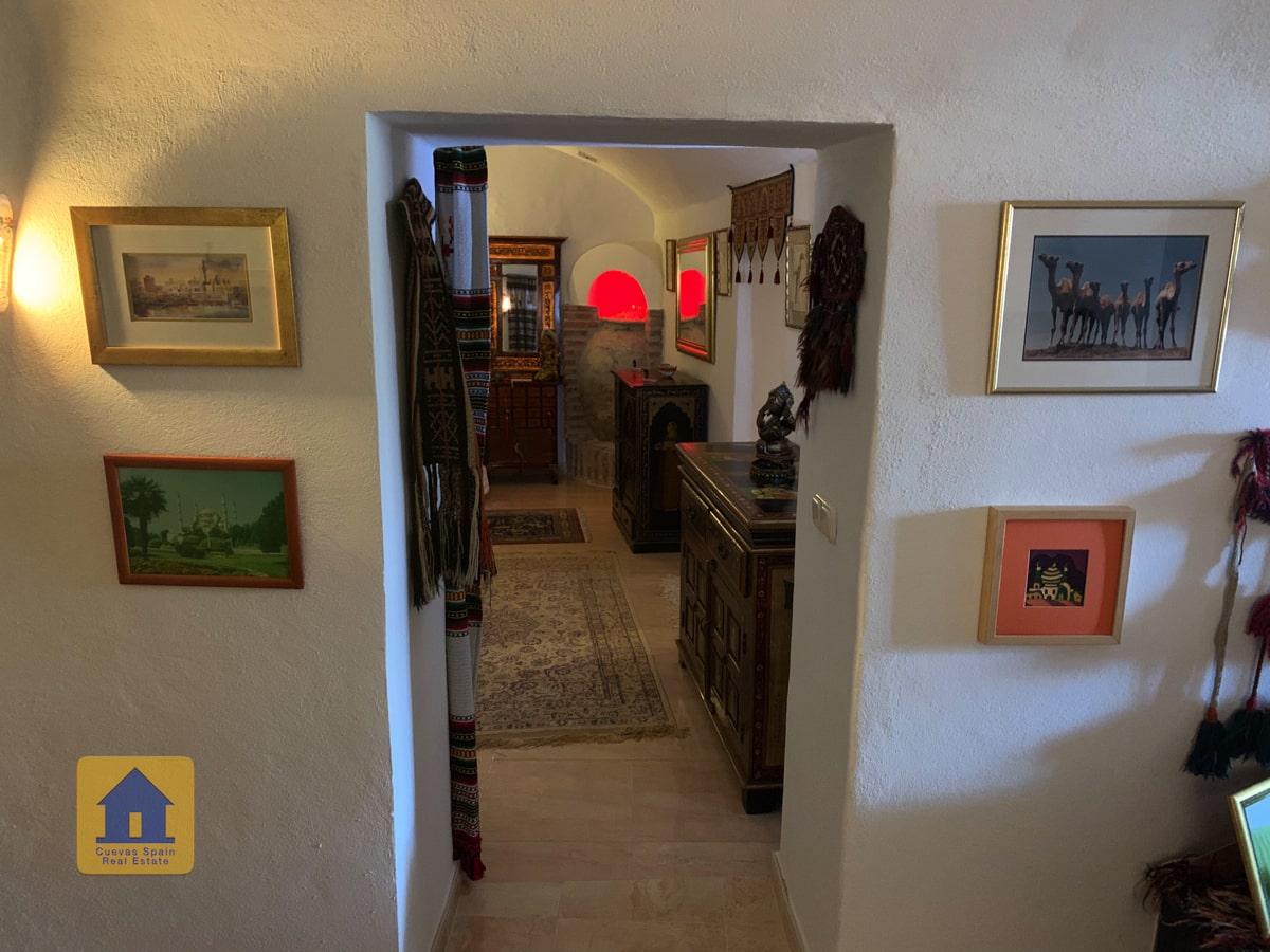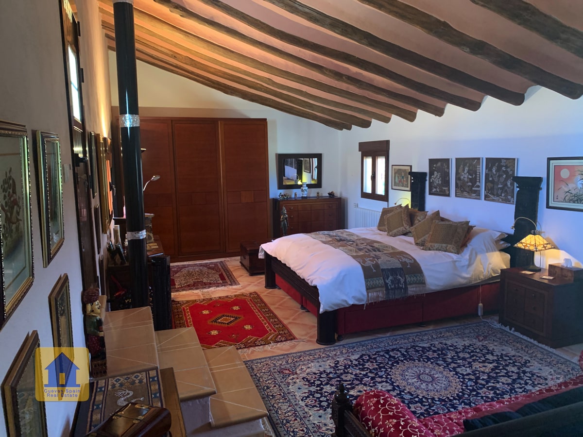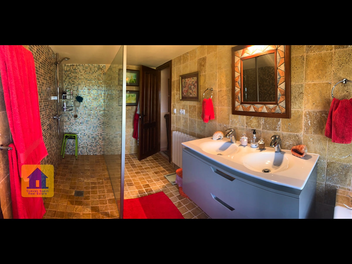 En entrant dans la maison, on arrive dans un hall d'entrée spacieux avec deux coins salon et une demi-salle de bain pour les invités. À gauche se trouve la partie de la maison en dépendance avec des poutres en bois et des plafonds en yeso. Le salon est spacieux, confortable et lumineux. Une véranda s'ouvre sur le jardin arrière par des portes coulissantes à double vitrage et comporte un bar en bois de teck personnalisé pour les réceptions. La grande cuisine moderne est équipée et finie de manière exquise. Depuis la cuisine, un couloir mène aux suites de la cave. La salle à manger intérieure s'ouvre sur un patio extérieur dans le jardin arrière. Un poêle à bois est placé entre la cuisine et la salle à manger, de sorte que son tuyau chauffe la chambre principale située au-dessus. La buanderie est entièrement équipée et comporte des armoires murales. Un escalier mène à la chambre principale avec sa superbe salle de bains attenante qui comprend une vaste douche carrelée et une baignoire brillamment positionnée pour donner sur la campagne. La porte de la chambre donne accès à une petite terrasse sur le toit, avec un coin salon ombragé et un chemin menant au cercle de battage et au banc d'observation pour admirer les couchers de soleil sur l'Altiplano. Au-delà de l'aire de battage se trouve l'oliveraie.