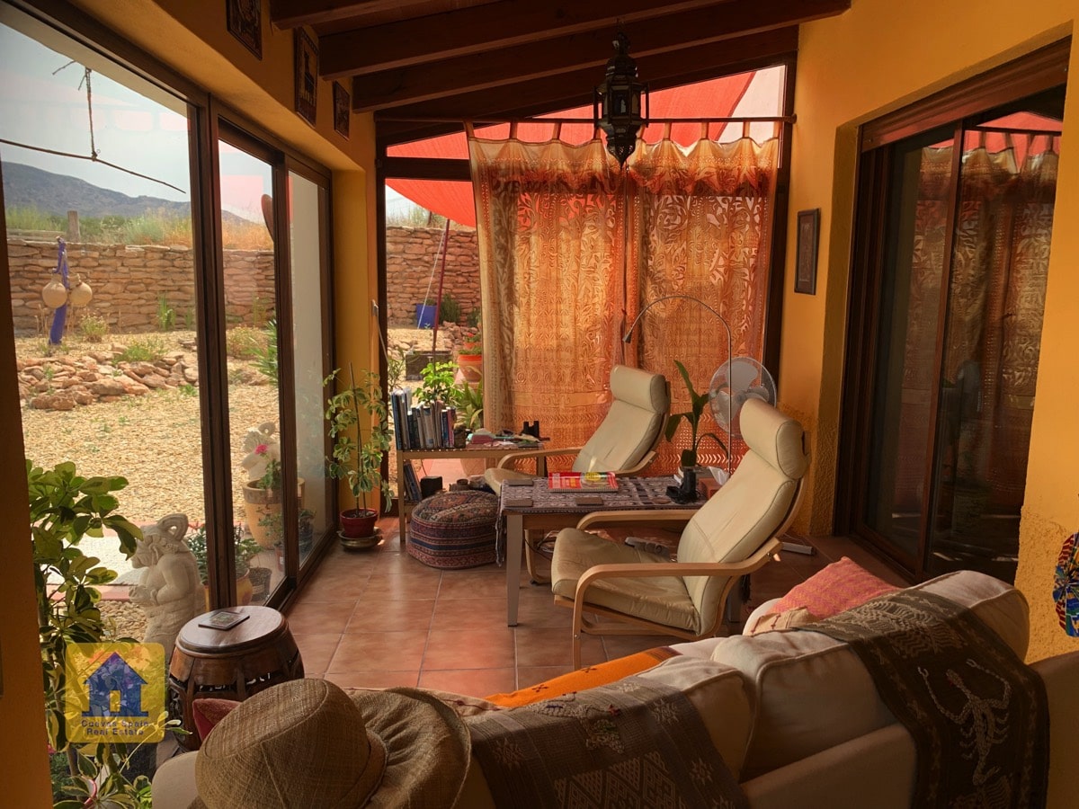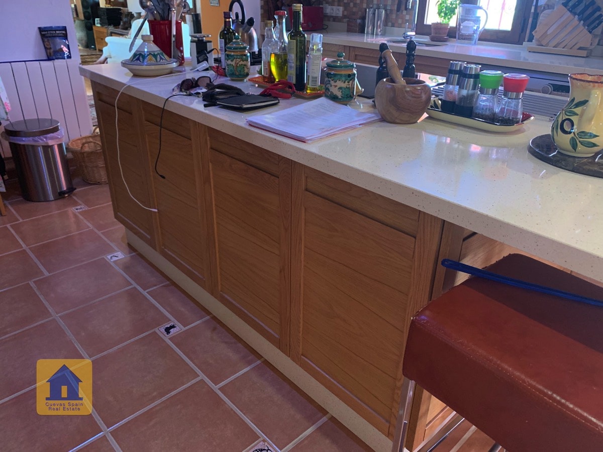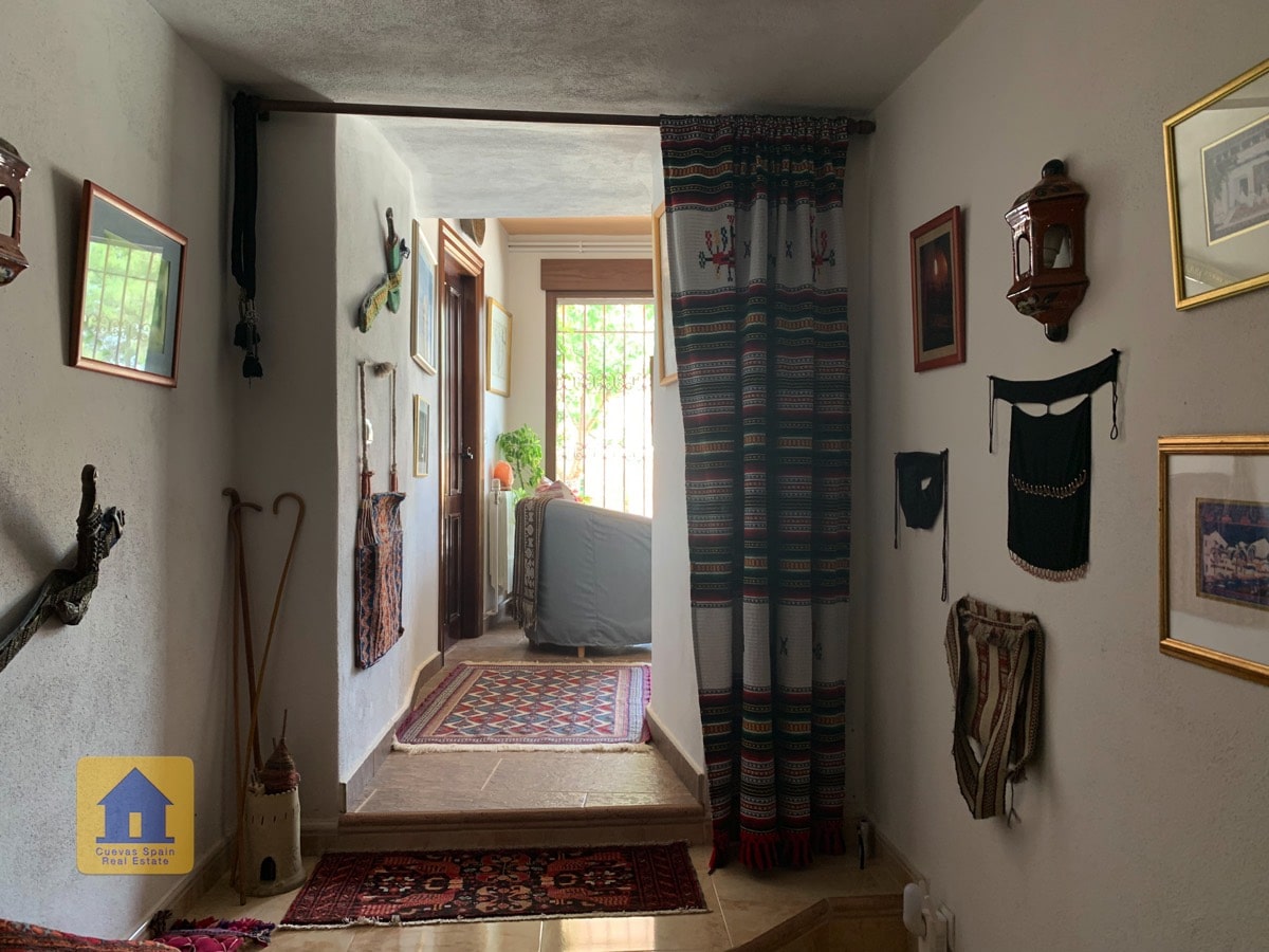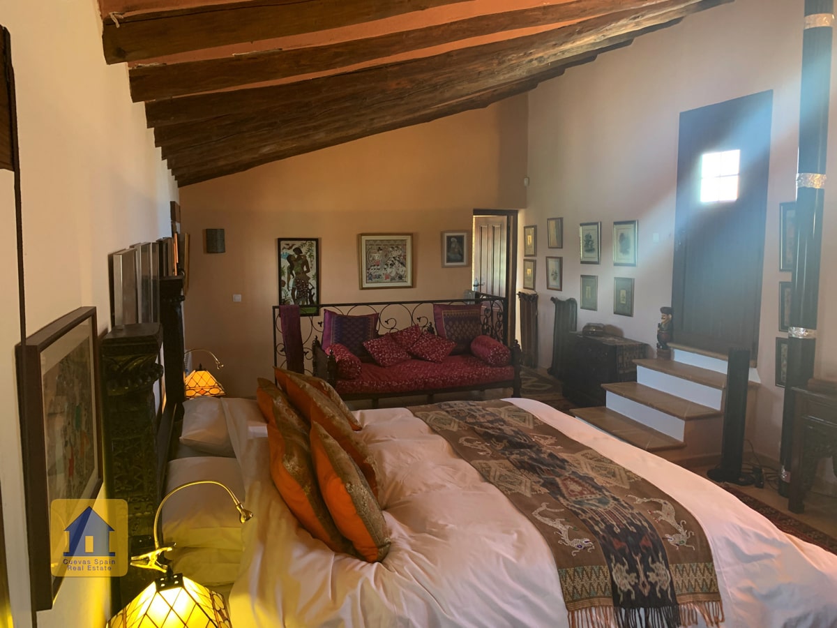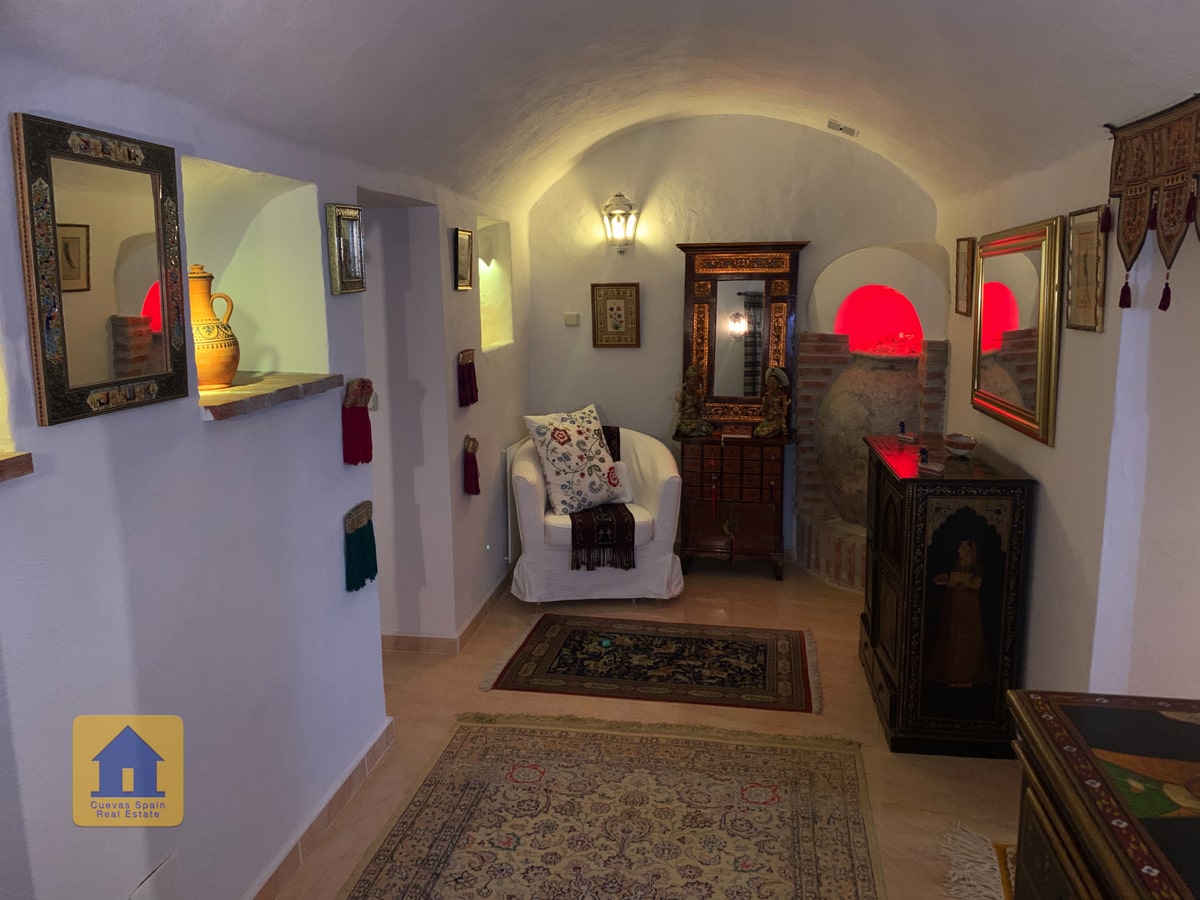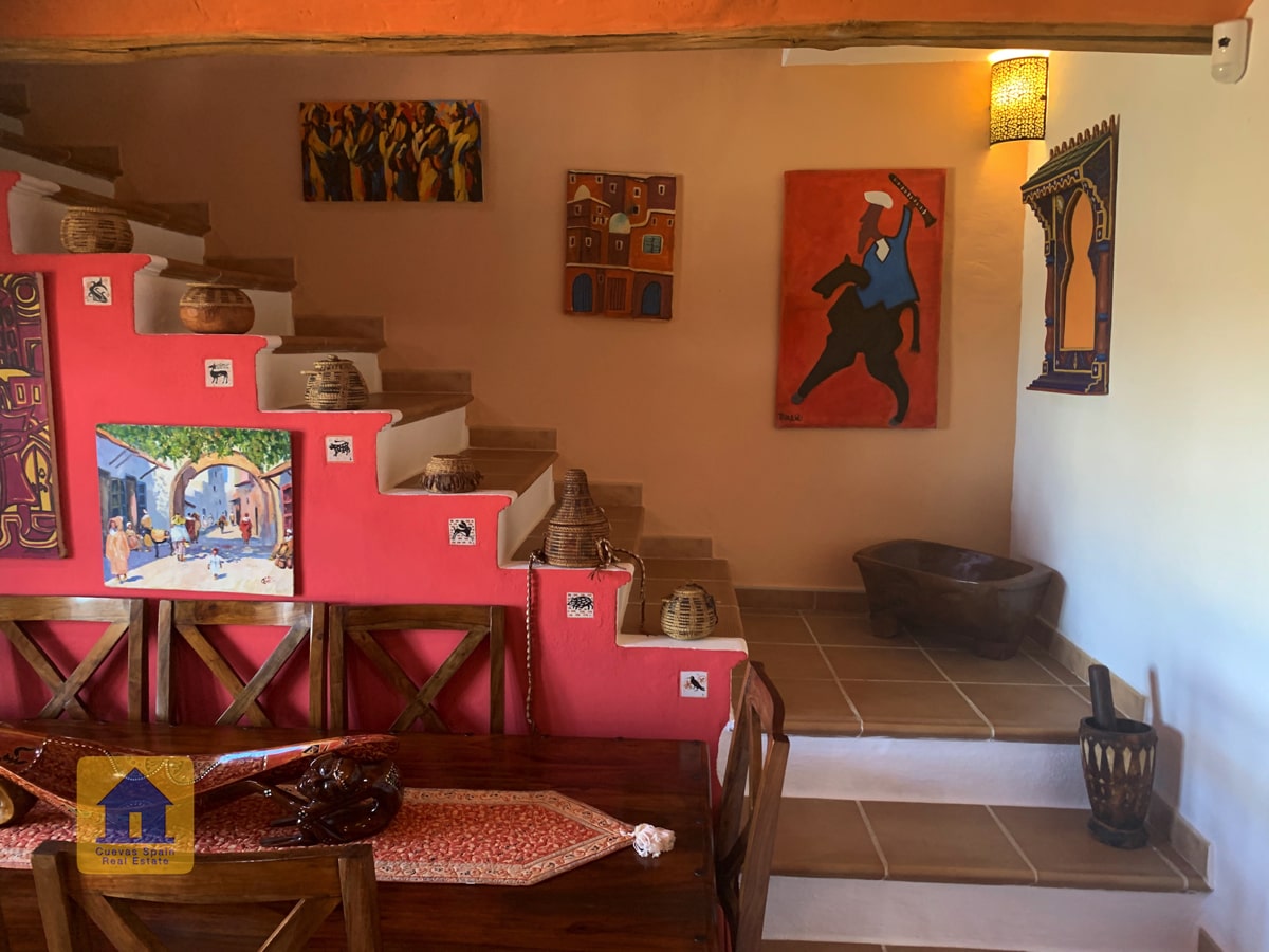 En entrant dans la maison, on arrive dans un hall d'entrée spacieux avec deux coins salon et une demi-salle de bain pour les invités. À gauche se trouve la partie de la maison en dépendance avec des poutres en bois et des plafonds en yeso. Le salon est spacieux, confortable et lumineux. Une véranda s'ouvre sur le jardin arrière par des portes coulissantes à double vitrage et comporte un bar en bois de teck personnalisé pour les réceptions. La grande cuisine moderne est équipée et finie de manière exquise. Depuis la cuisine, un couloir mène aux suites de la cave. La salle à manger intérieure s'ouvre sur un patio extérieur dans le jardin arrière. Un poêle à bois est placé entre la cuisine et la salle à manger, de sorte que son tuyau chauffe la chambre principale située au-dessus. La buanderie est entièrement équipée et comporte des armoires murales. Un escalier mène à la chambre principale avec sa superbe salle de bains attenante qui comprend une vaste douche carrelée et une baignoire brillamment positionnée pour donner sur la campagne. La porte de la chambre donne accès à une petite terrasse sur le toit, avec un coin salon ombragé et un chemin menant au cercle de battage et au banc d'observation pour admirer les couchers de soleil sur l'Altiplano. Au-delà de l'aire de battage se trouve l'oliveraie.
