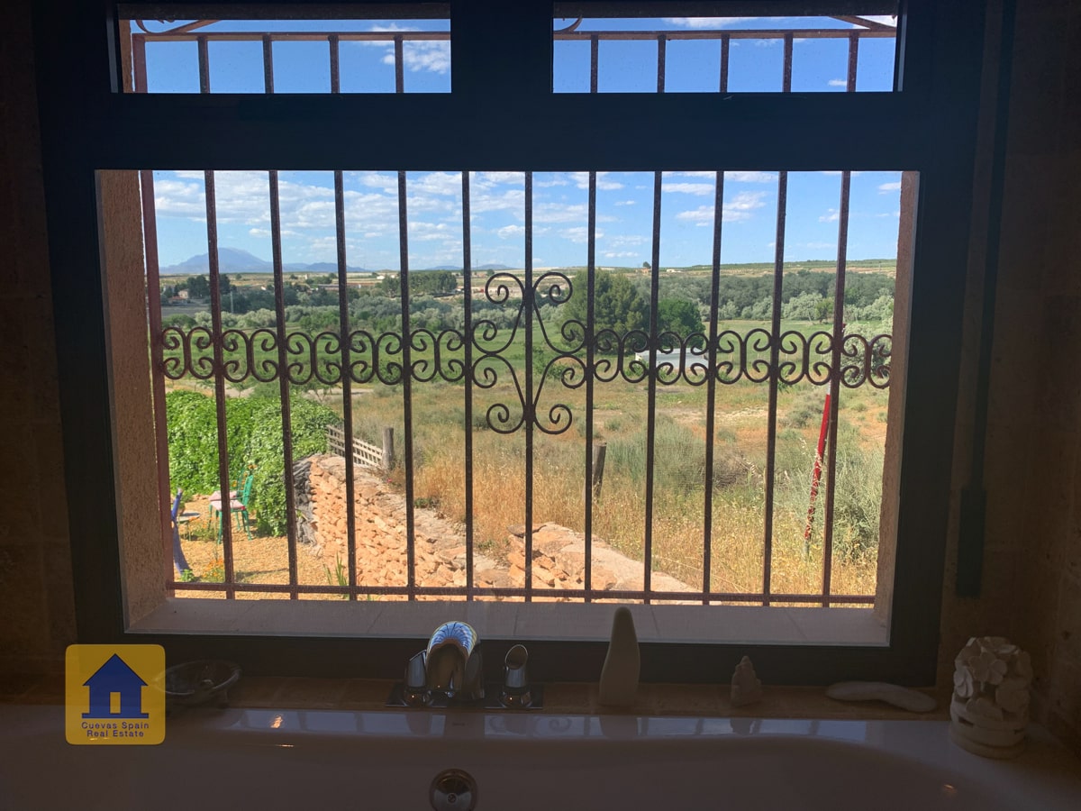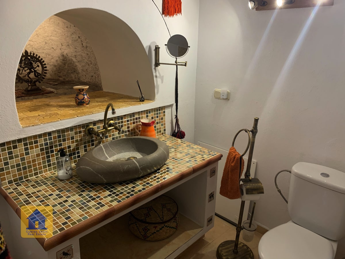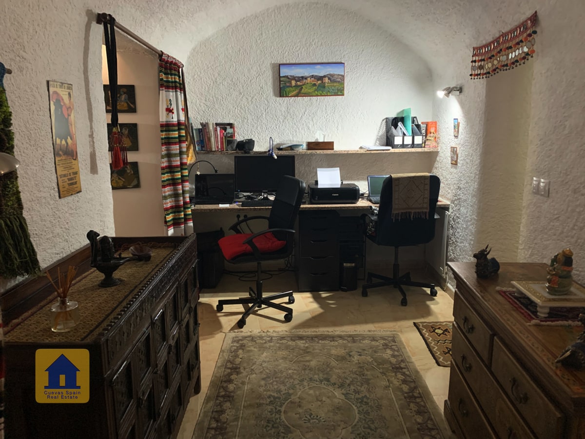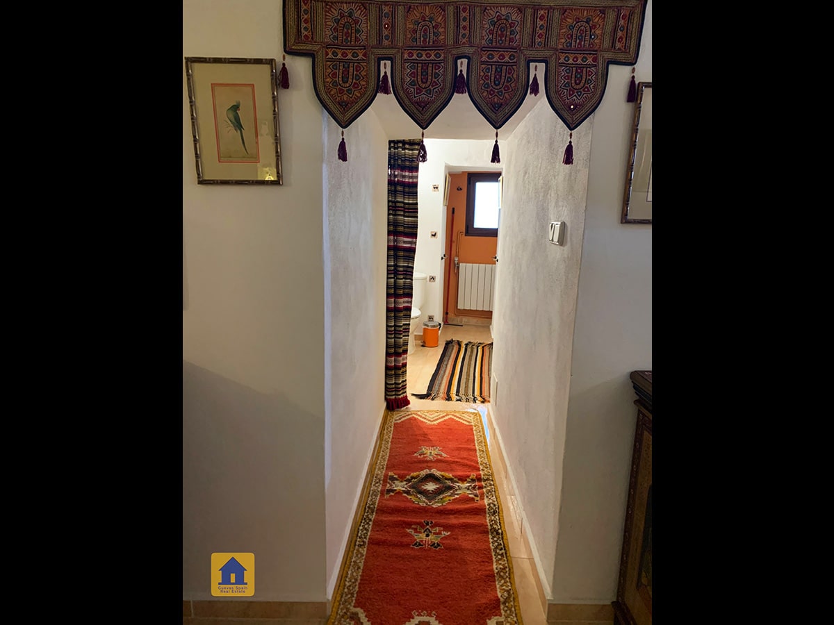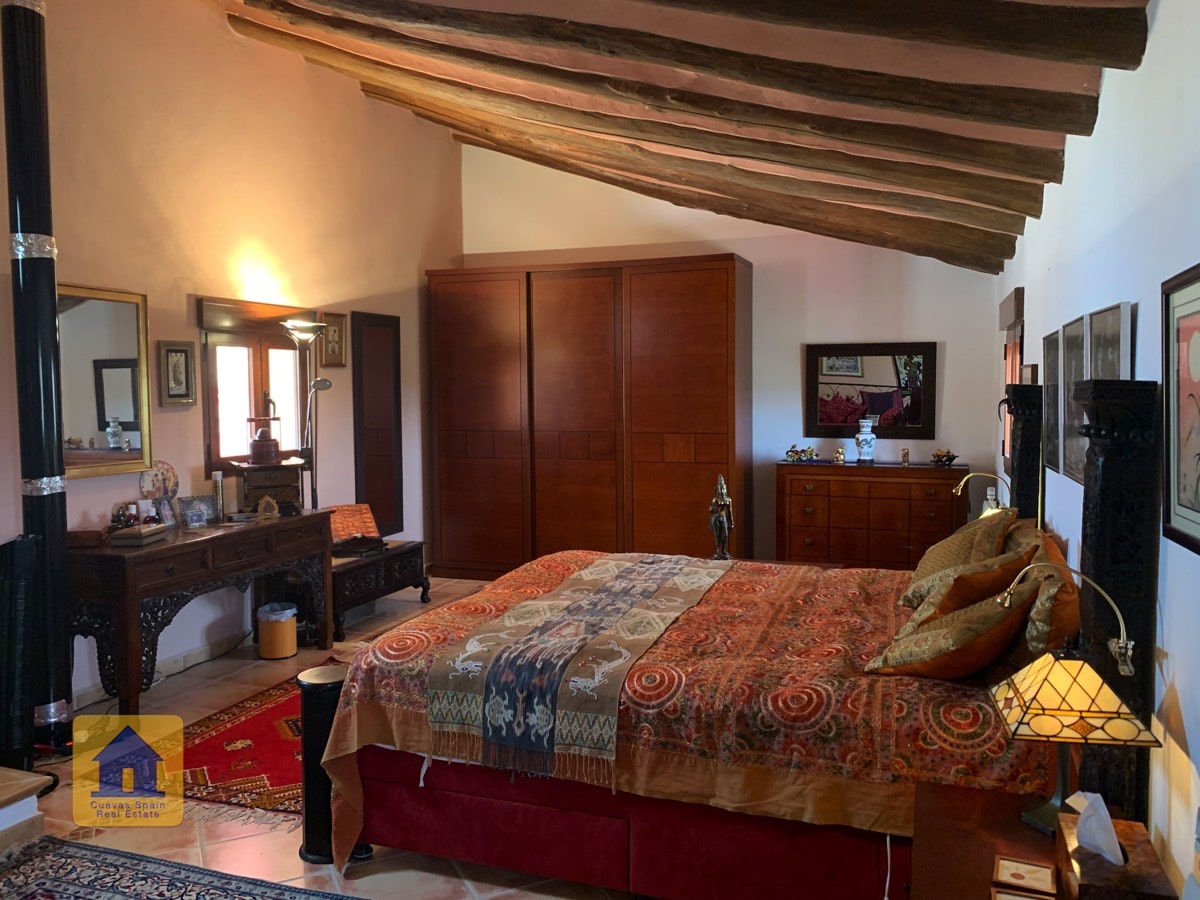 En entrant dans la maison, on arrive dans un hall d'entrée spacieux avec deux coins salon et une demi-salle de bain pour les invités. À gauche se trouve la partie de la maison en dépendance avec des poutres en bois et des plafonds en yeso. Le salon est spacieux, confortable et lumineux. Une véranda s'ouvre sur le jardin arrière par des portes coulissantes à double vitrage et comporte un bar en bois de teck personnalisé pour les réceptions. La grande cuisine moderne est équipée et finie de manière exquise. Depuis la cuisine, un couloir mène aux suites de la cave. La salle à manger intérieure s'ouvre sur un patio extérieur dans le jardin arrière. Un poêle à bois est placé entre la cuisine et la salle à manger, de sorte que son tuyau chauffe la chambre principale située au-dessus. La buanderie est entièrement équipée et comporte des armoires murales. Un escalier mène à la chambre principale avec sa superbe salle de bains attenante qui comprend une vaste douche carrelée et une baignoire brillamment positionnée pour donner sur la campagne. La porte de la chambre donne accès à une petite terrasse sur le toit, avec un coin salon ombragé et un chemin menant au cercle de battage et au banc d'observation pour admirer les couchers de soleil sur l'Altiplano. Au-delà de l'aire de battage se trouve l'oliveraie.