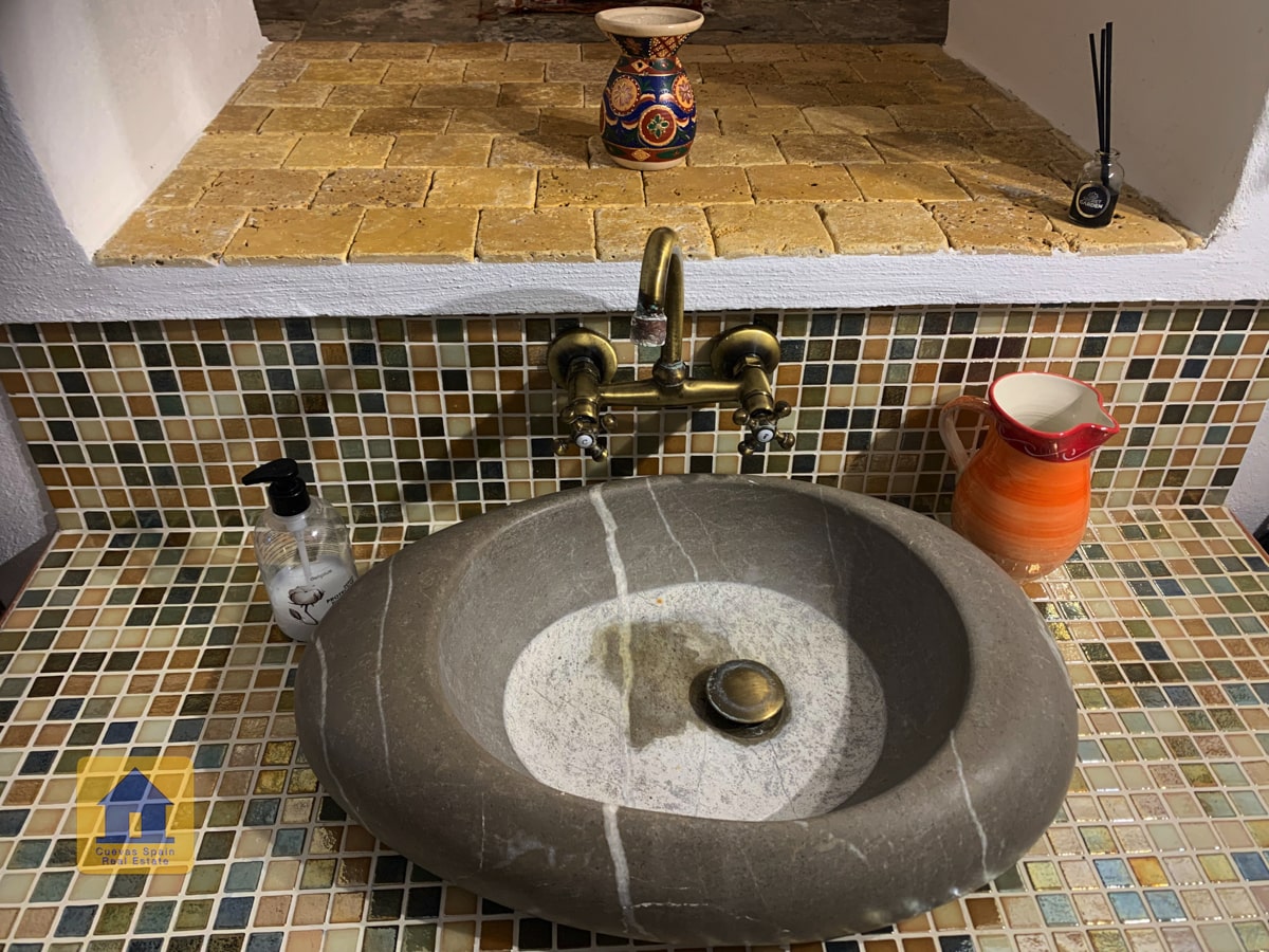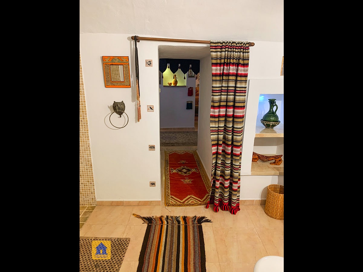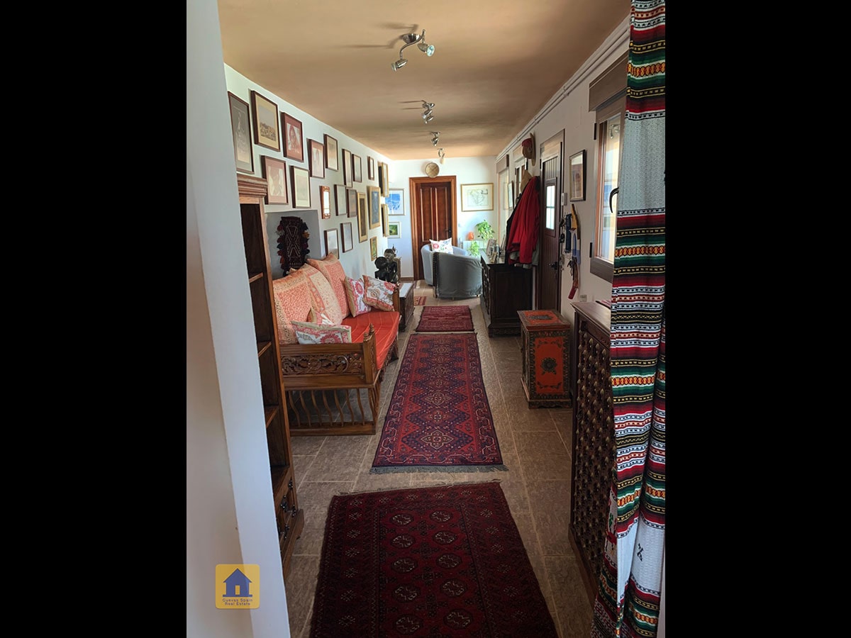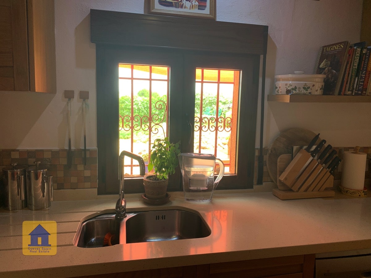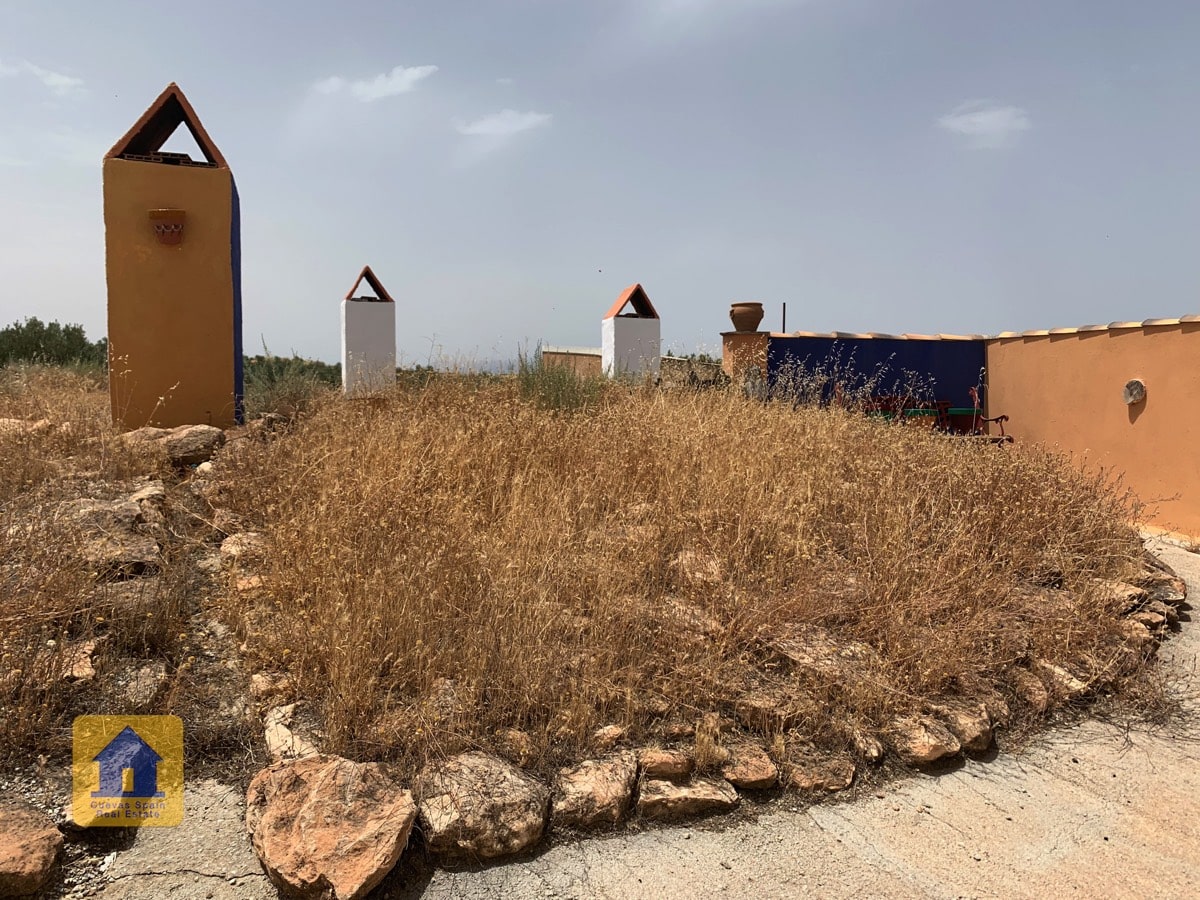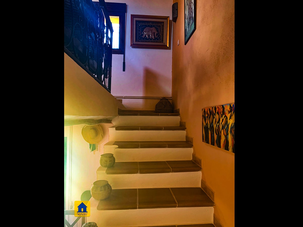 En entrant dans la maison, on arrive dans un hall d'entrée spacieux avec deux coins salon et une demi-salle de bain pour les invités. À gauche se trouve la partie de la maison en dépendance avec des poutres en bois et des plafonds en yeso. Le salon est spacieux, confortable et lumineux. Une véranda s'ouvre sur le jardin arrière par des portes coulissantes à double vitrage et comporte un bar en bois de teck personnalisé pour les réceptions. La grande cuisine moderne est équipée et finie de manière exquise. Depuis la cuisine, un couloir mène aux suites de la cave. La salle à manger intérieure s'ouvre sur un patio extérieur dans le jardin arrière. Un poêle à bois est placé entre la cuisine et la salle à manger, de sorte que son tuyau chauffe la chambre principale située au-dessus. La buanderie est entièrement équipée et comporte des armoires murales. Un escalier mène à la chambre principale avec sa superbe salle de bains attenante qui comprend une vaste douche carrelée et une baignoire brillamment positionnée pour donner sur la campagne. La porte de la chambre donne accès à une petite terrasse sur le toit, avec un coin salon ombragé et un chemin menant au cercle de battage et au banc d'observation pour admirer les couchers de soleil sur l'Altiplano. Au-delà de l'aire de battage se trouve l'oliveraie.