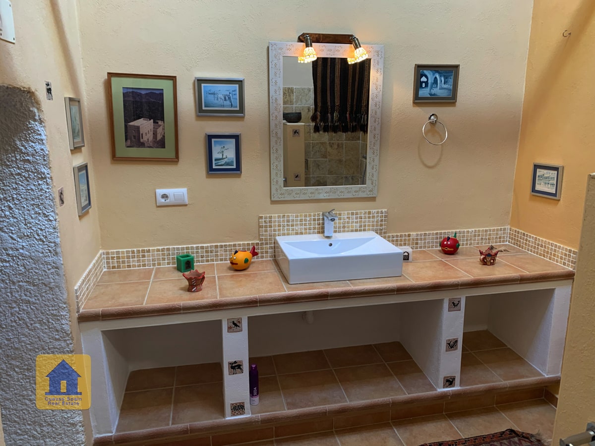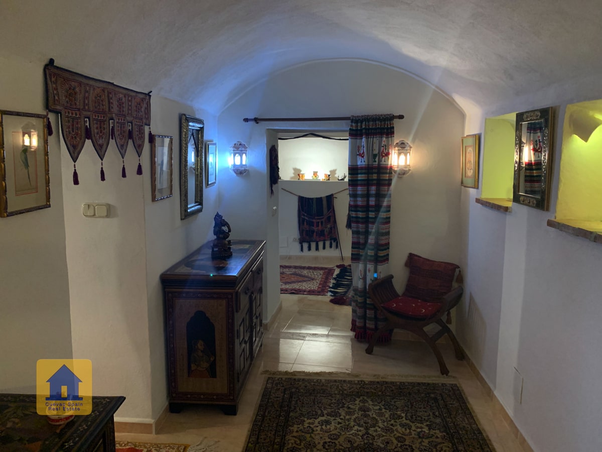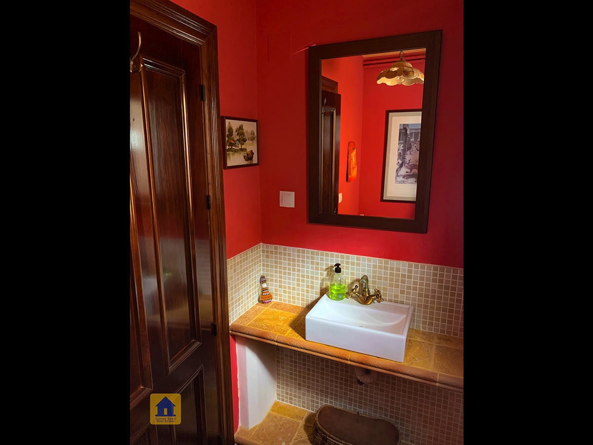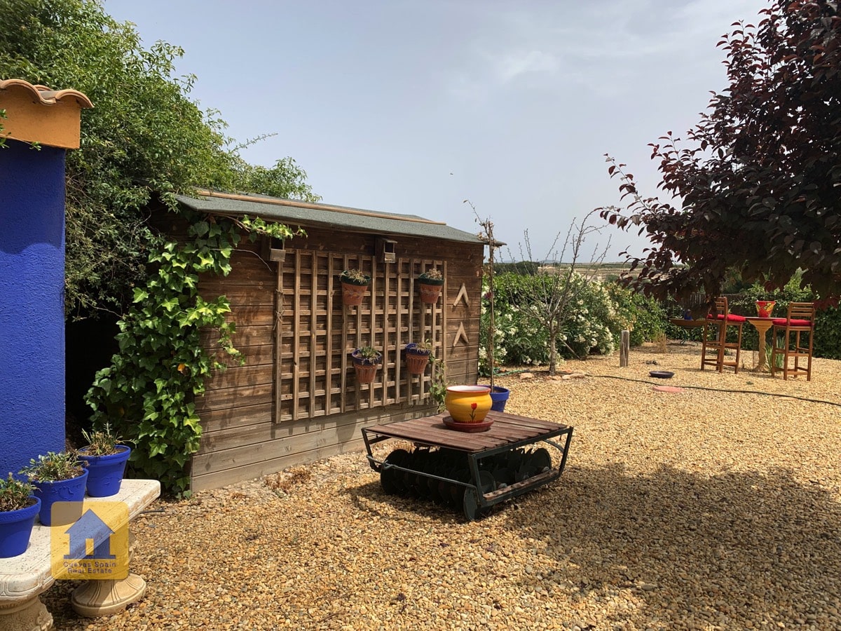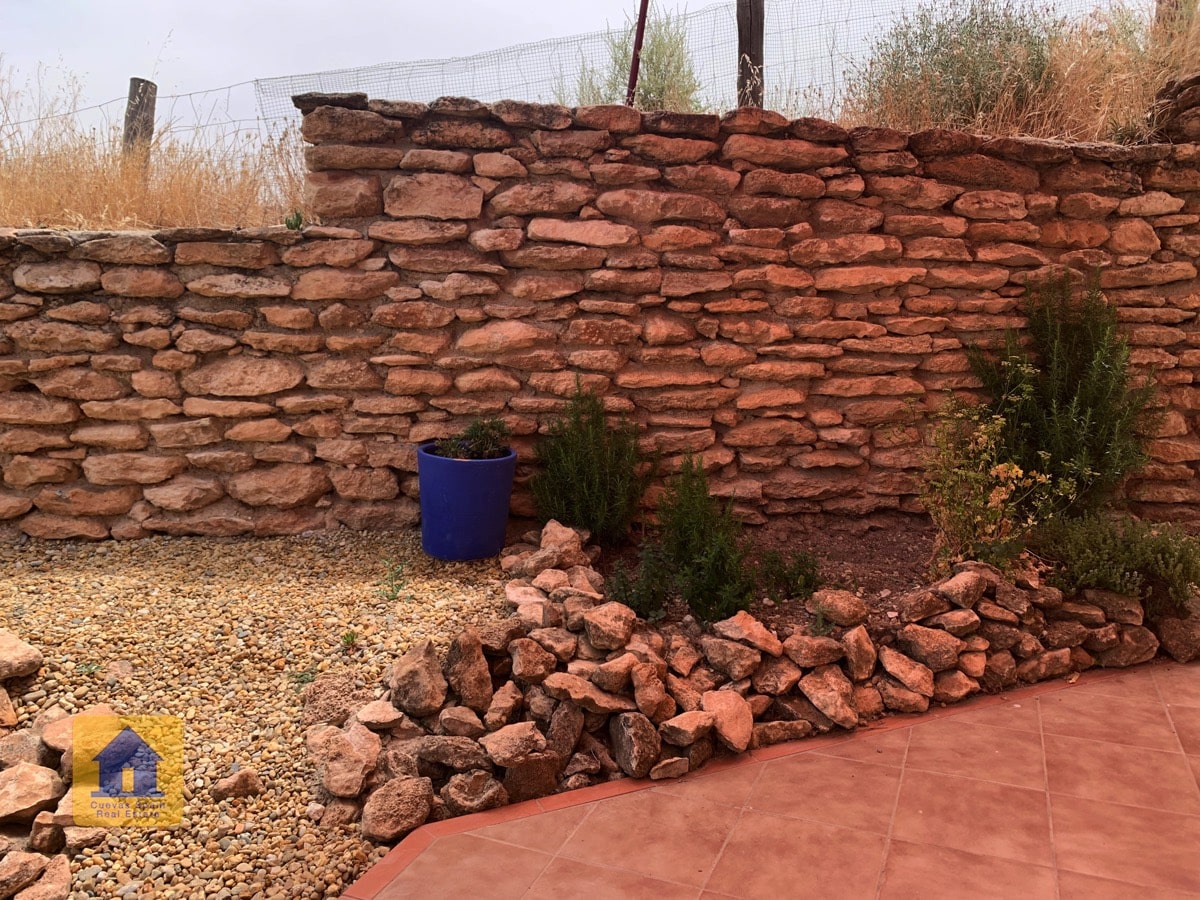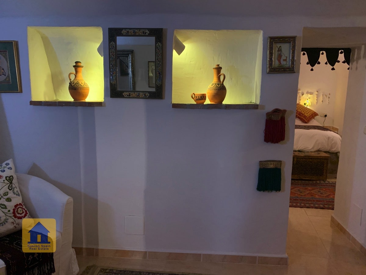 En entrant dans la maison, on arrive dans un hall d'entrée spacieux avec deux coins salon et une demi-salle de bain pour les invités. À gauche se trouve la partie de la maison en dépendance avec des poutres en bois et des plafonds en yeso. Le salon est spacieux, confortable et lumineux. Une véranda s'ouvre sur le jardin arrière par des portes coulissantes à double vitrage et comporte un bar en bois de teck personnalisé pour les réceptions. La grande cuisine moderne est équipée et finie de manière exquise. Depuis la cuisine, un couloir mène aux suites de la cave. La salle à manger intérieure s'ouvre sur un patio extérieur dans le jardin arrière. Un poêle à bois est placé entre la cuisine et la salle à manger, de sorte que son tuyau chauffe la chambre principale située au-dessus. La buanderie est entièrement équipée et comporte des armoires murales. Un escalier mène à la chambre principale avec sa superbe salle de bains attenante qui comprend une vaste douche carrelée et une baignoire brillamment positionnée pour donner sur la campagne. La porte de la chambre donne accès à une petite terrasse sur le toit, avec un coin salon ombragé et un chemin menant au cercle de battage et au banc d'observation pour admirer les couchers de soleil sur l'Altiplano. Au-delà de l'aire de battage se trouve l'oliveraie.