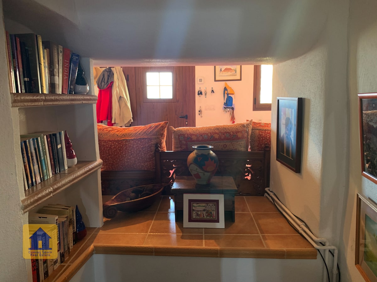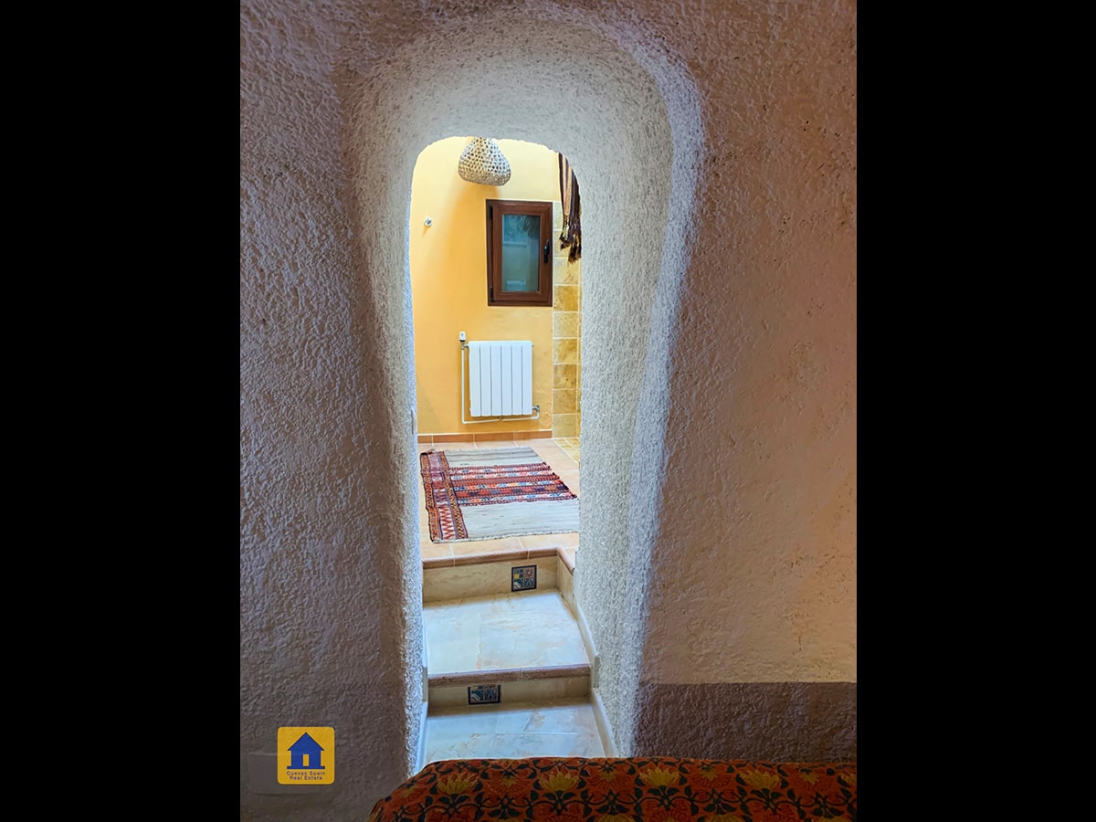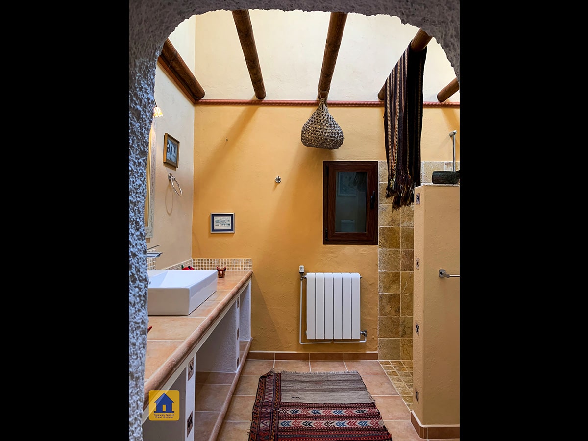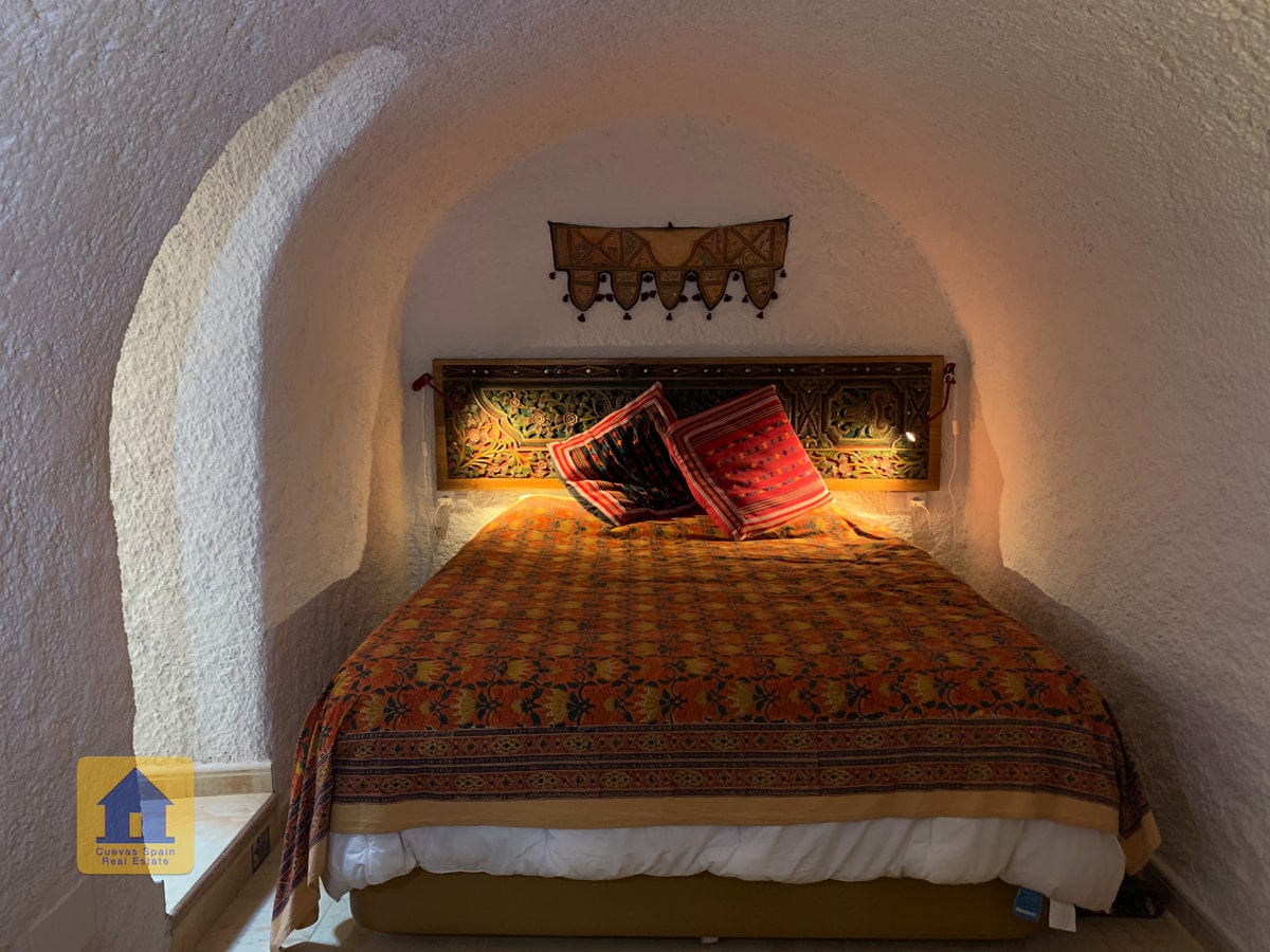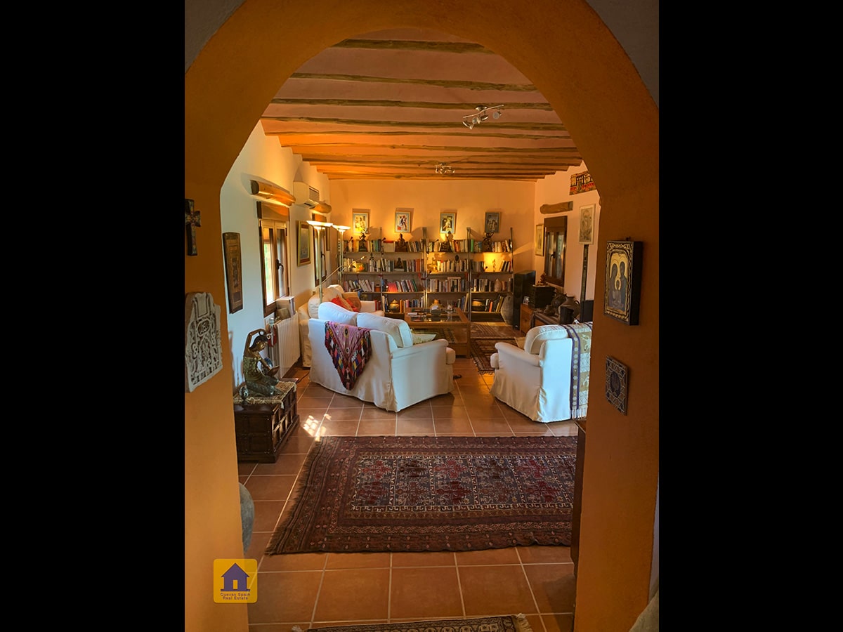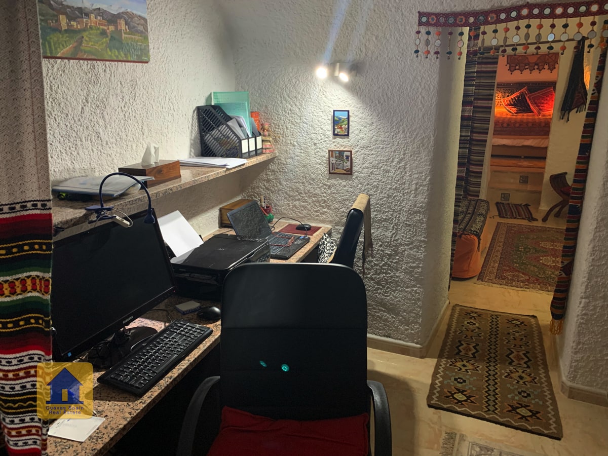 En entrant dans la maison, on arrive dans un hall d'entrée spacieux avec deux coins salon et une demi-salle de bain pour les invités. À gauche se trouve la partie de la maison en dépendance avec des poutres en bois et des plafonds en yeso. Le salon est spacieux, confortable et lumineux. Une véranda s'ouvre sur le jardin arrière par des portes coulissantes à double vitrage et comporte un bar en bois de teck personnalisé pour les réceptions. La grande cuisine moderne est équipée et finie de manière exquise. Depuis la cuisine, un couloir mène aux suites de la cave. La salle à manger intérieure s'ouvre sur un patio extérieur dans le jardin arrière. Un poêle à bois est placé entre la cuisine et la salle à manger, de sorte que son tuyau chauffe la chambre principale située au-dessus. La buanderie est entièrement équipée et comporte des armoires murales. Un escalier mène à la chambre principale avec sa superbe salle de bains attenante qui comprend une vaste douche carrelée et une baignoire brillamment positionnée pour donner sur la campagne. La porte de la chambre donne accès à une petite terrasse sur le toit, avec un coin salon ombragé et un chemin menant au cercle de battage et au banc d'observation pour admirer les couchers de soleil sur l'Altiplano. Au-delà de l'aire de battage se trouve l'oliveraie.