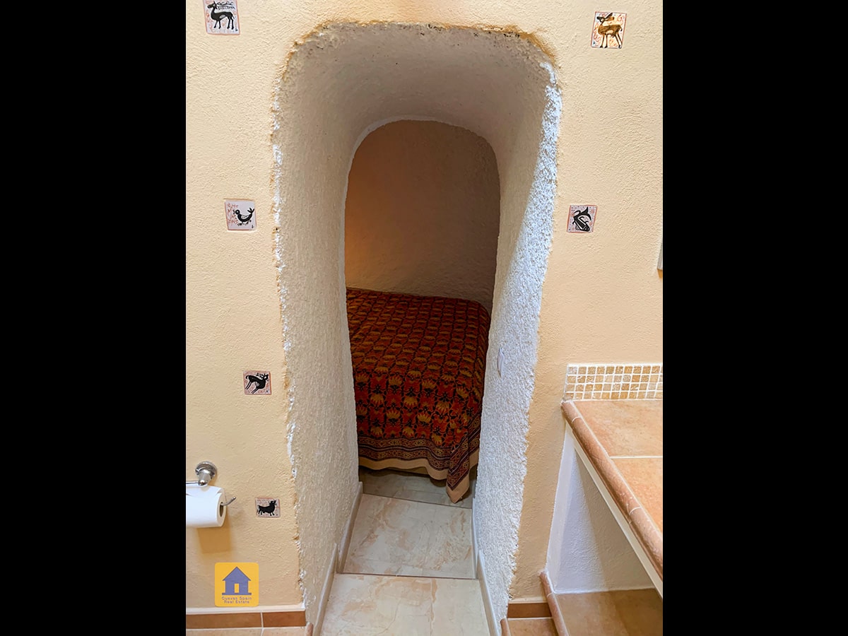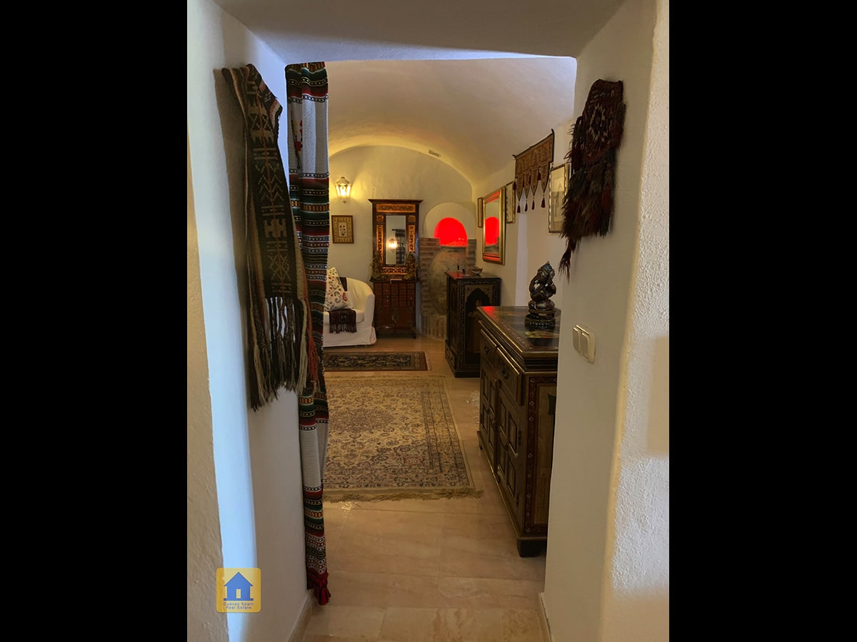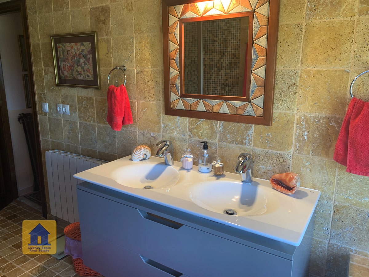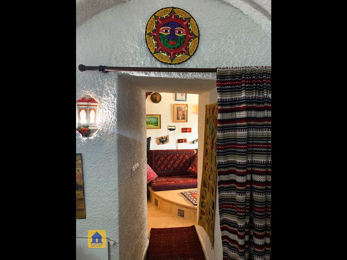 À droite du hall d'entrée, on entre dans la partie grotte de la maison. Il y a deux suites dans la grotte, chacune avec son propre salon, une chambre double, une armoire et une salle de bain attenante magnifiquement aménagée (l'une avec un puits de lumière). Les salons se transforment en chambres pour les invités supplémentaires. Entre les deux suites se trouvent un bureau et un espace de divertissement. L'éclairage de la grotte a été choisi avec soin. Le bureau, la salle de détente et les deux suites sont également ensoleillés par les fenêtres de la façade.