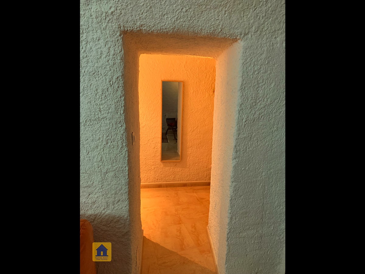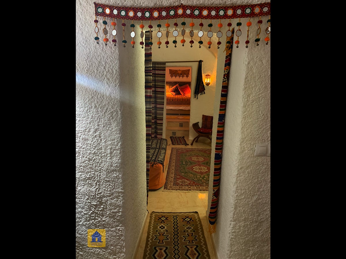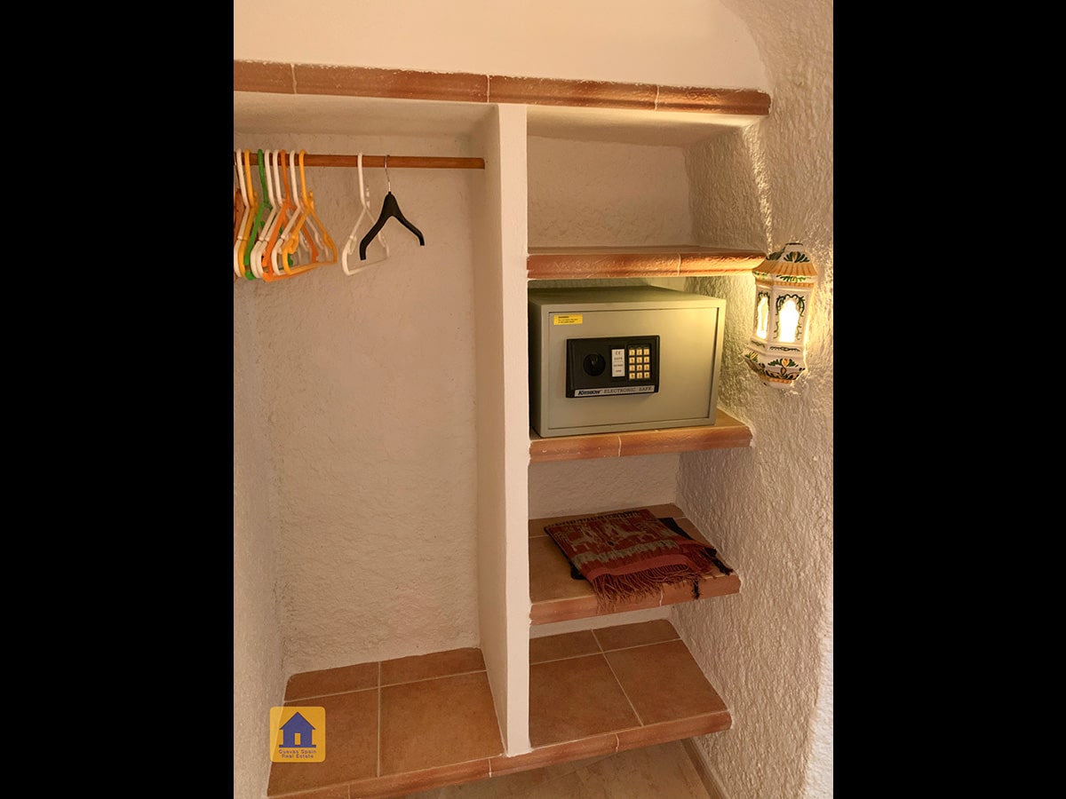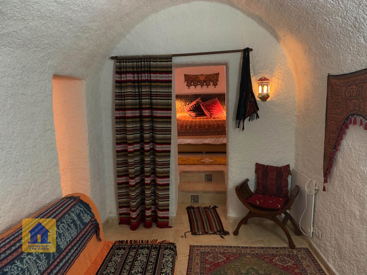 À droite du hall d'entrée, on entre dans la partie grotte de la maison. Il y a deux suites dans la grotte, chacune avec son propre salon, une chambre double, une armoire et une salle de bain attenante magnifiquement aménagée (l'une avec un puits de lumière). Les salons se transforment en chambres pour les invités supplémentaires. Entre les deux suites se trouvent un bureau et un espace de divertissement. L'éclairage de la grotte a été choisi avec soin. Le bureau, la salle de détente et les deux suites sont également ensoleillés par les fenêtres de la façade.