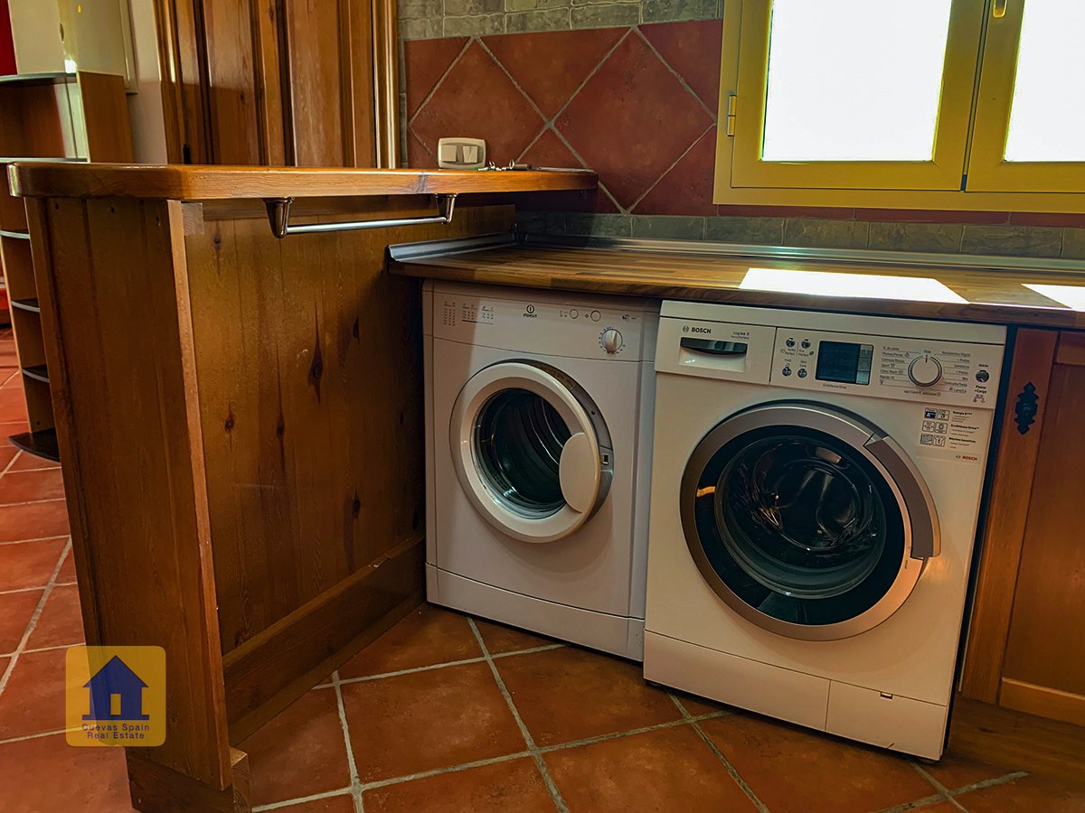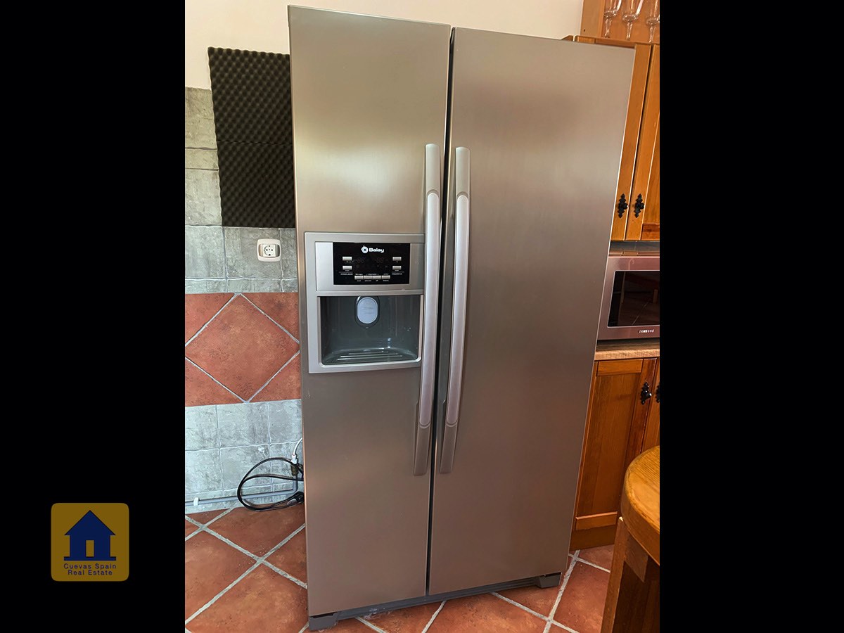 La maison dispose de beaucoup d'espace extérieur, y compris un abri pour deux voitures. Il y a une porte d'entrée en fer et toute la propriété est clôturée de manière sécurisée. L'avant et l'arrière de la propriété ont de nouvelles allées en pierre. Depuis le porche d'entrée, vous entrez dans une belle cuisine/salle à manger ouverte et un salon confortable avec un poêle à granulés récemment installé. La cuisine est construite sur mesure, entièrement carrelée, avec un four, une plaque de cuisson au gaz, un grand réfrigérateur/congélateur de style américain et également une machine à laver et un sèche-linge. Des portes françaises s'ouvrent sur le patio, avec table et chaises près de la piscine, idéal pour des repas en plein air.