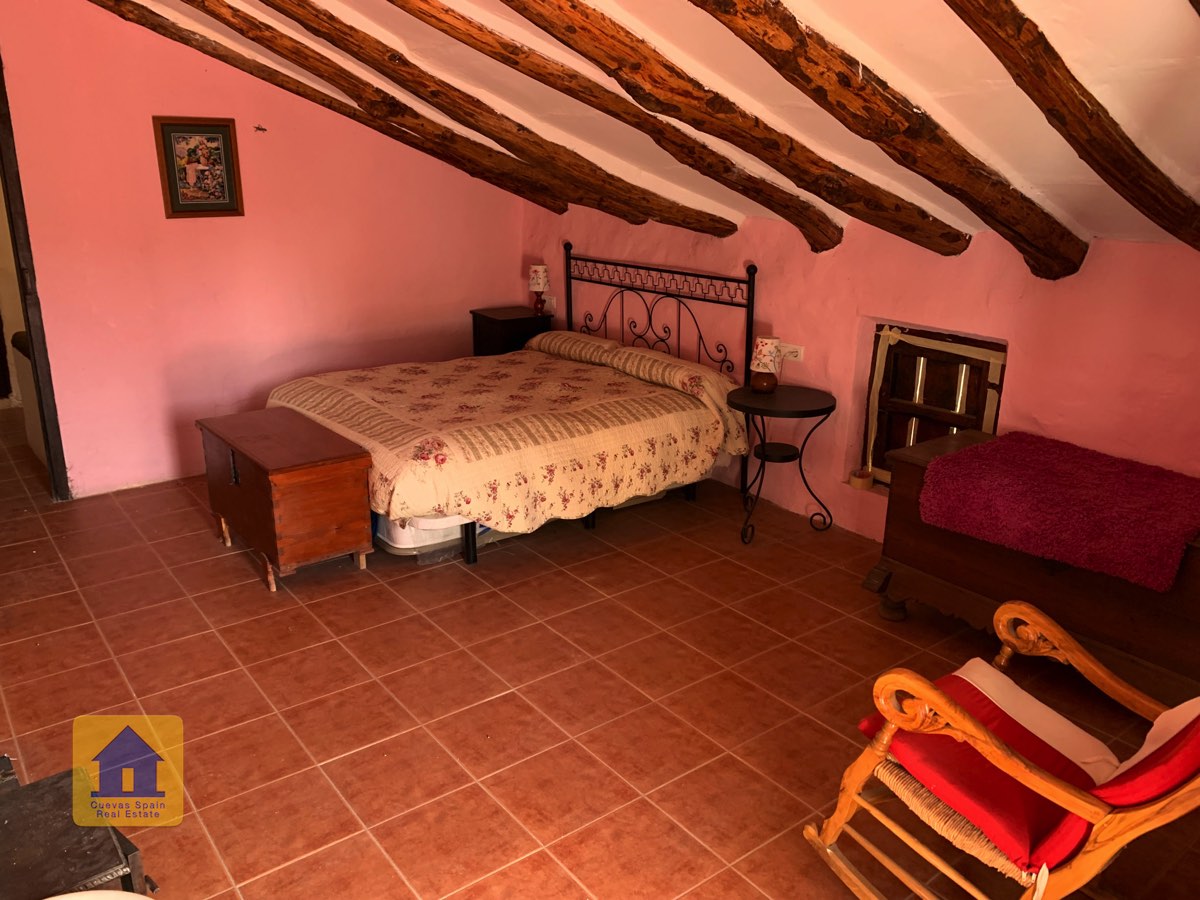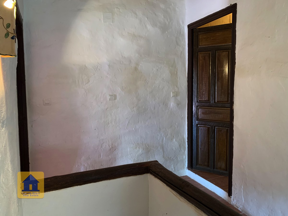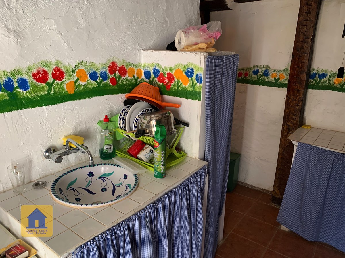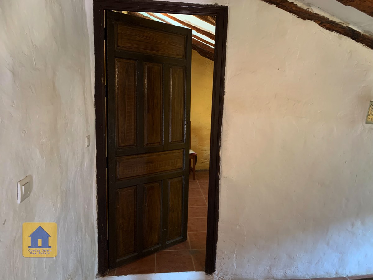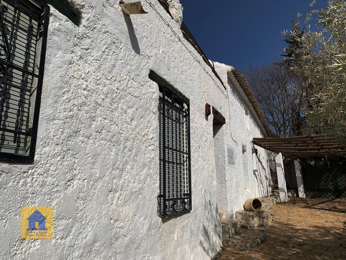 L'accès à la propriété se fait par une étroite route pavée et un chemin de terre. Le long du chemin, on trouve des figuiers et des vignes. Une allée mène au patio avant qui a une tonnelle couverte de plantes. Depuis le patio, vous pouvez entrer dans une salle de stockage, une grande salle de jeu avec des fenêtres, la maison principale ou la cuisine. L'entrée principale mène au salon, avec sa cheminée et son plafond en poutres de bois. Un couloir mène à la salle de bains, à l'étage aux chambres, et au bout se trouve la cuisine qui s'ouvre sur le patio. À l'étage, une chambre double a une fenêtre arrière, et la grande chambre principale a une grande terrasse avec de magnifiques vues à 360º. La maison a besoin d'une mise à jour mais elle est vivable en l'état. La maison est vendue en grande partie meublée, une partie est négociable.