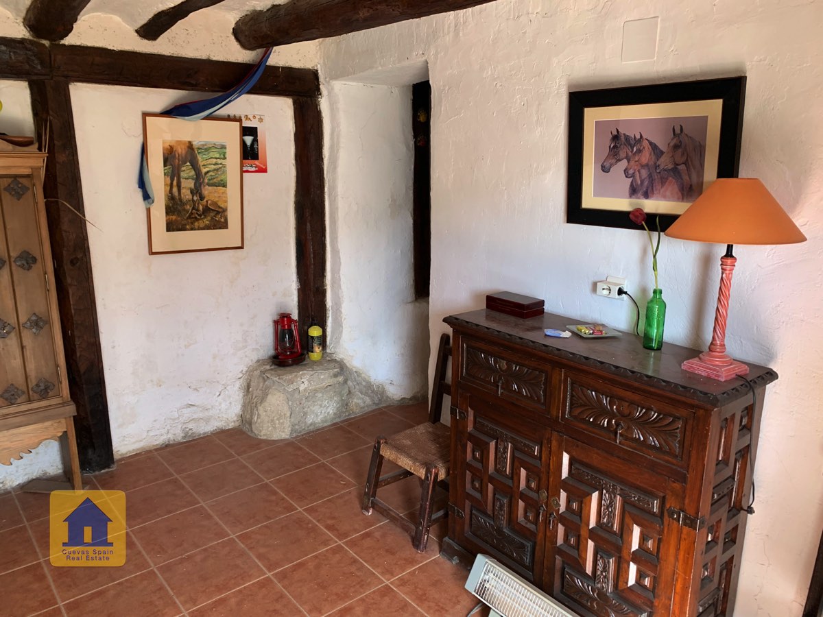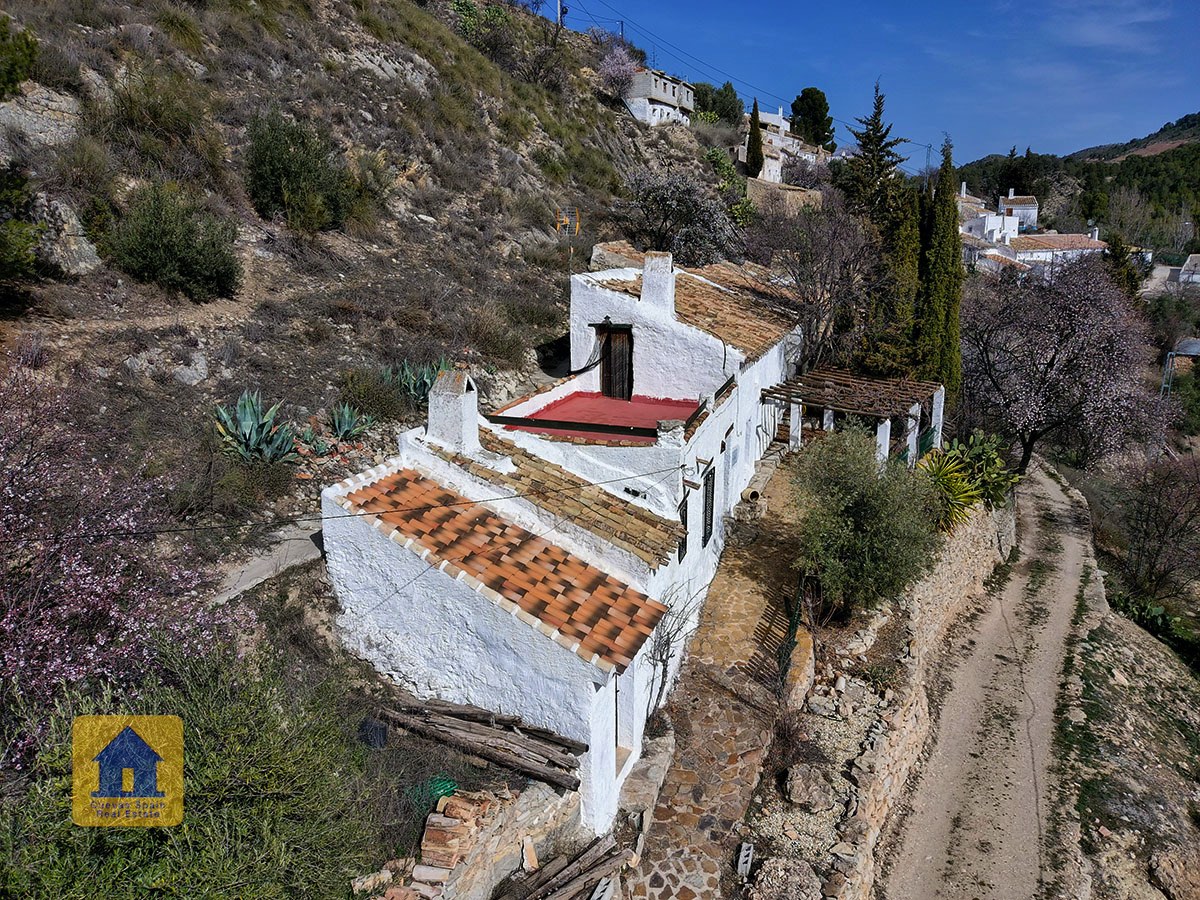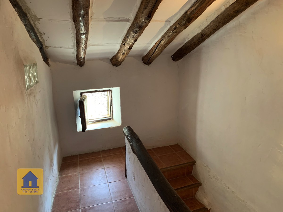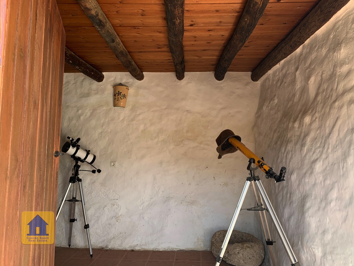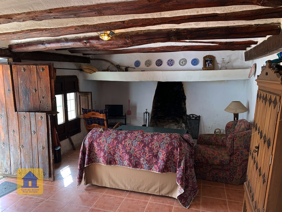 L'accès à la propriété se fait par une étroite route pavée et un chemin de terre. Le long du chemin, on trouve des figuiers et des vignes. Une allée mène au patio avant qui a une tonnelle couverte de plantes. Depuis le patio, vous pouvez entrer dans une salle de stockage, une grande salle de jeu avec des fenêtres, la maison principale ou la cuisine. L'entrée principale mène au salon, avec sa cheminée et son plafond en poutres de bois. Un couloir mène à la salle de bains, à l'étage aux chambres, et au bout se trouve la cuisine qui s'ouvre sur le patio. À l'étage, une chambre double a une fenêtre arrière, et la grande chambre principale a une grande terrasse avec de magnifiques vues à 360º. La maison a besoin d'une mise à jour mais elle est vivable en l'état. La maison est vendue en grande partie meublée, une partie est négociable.