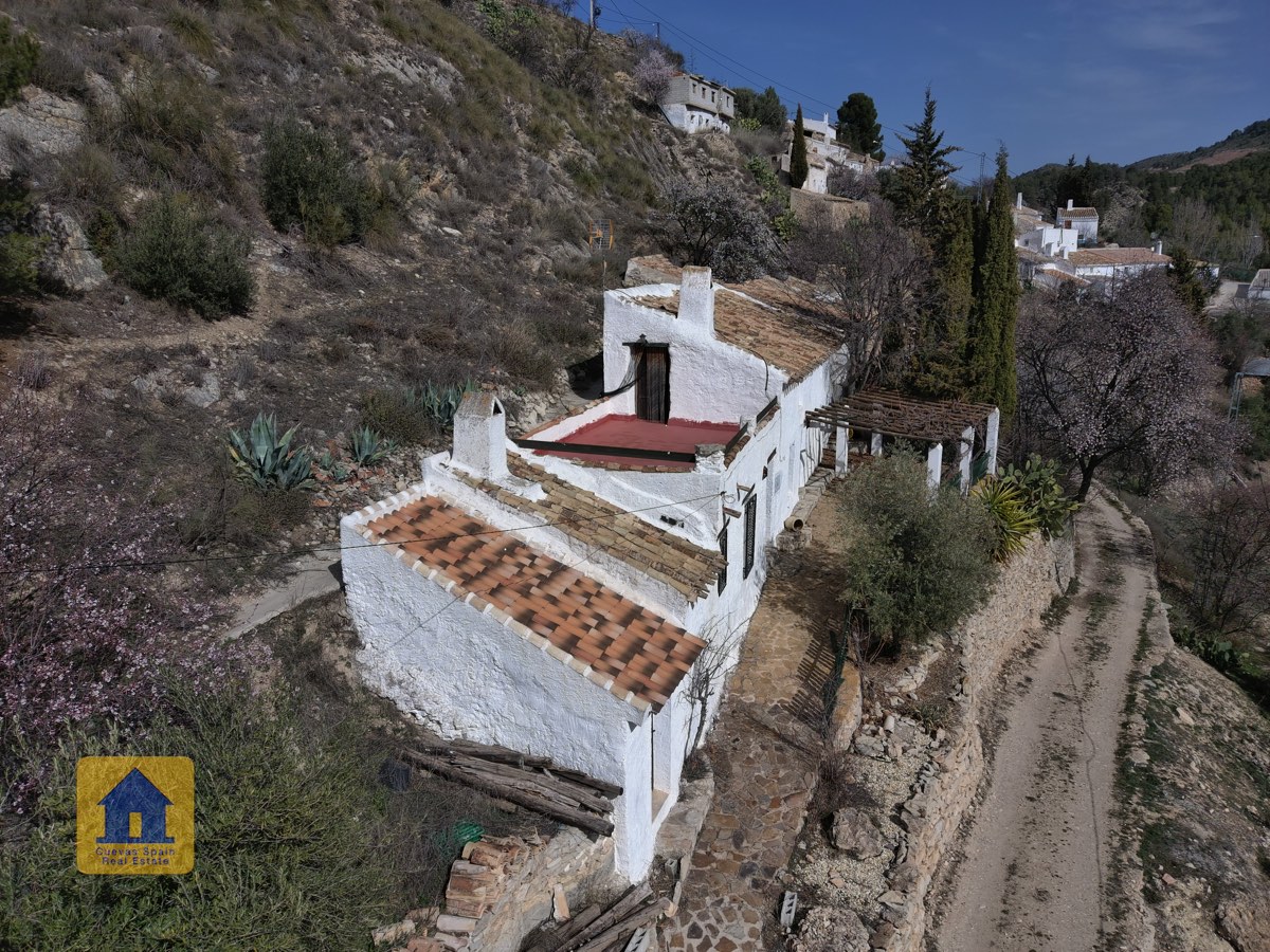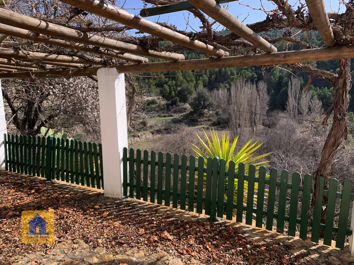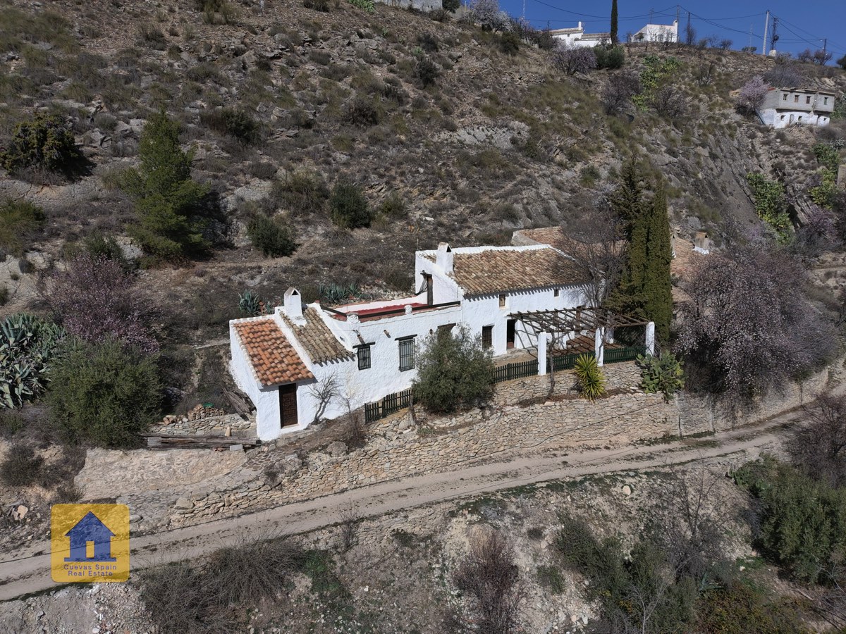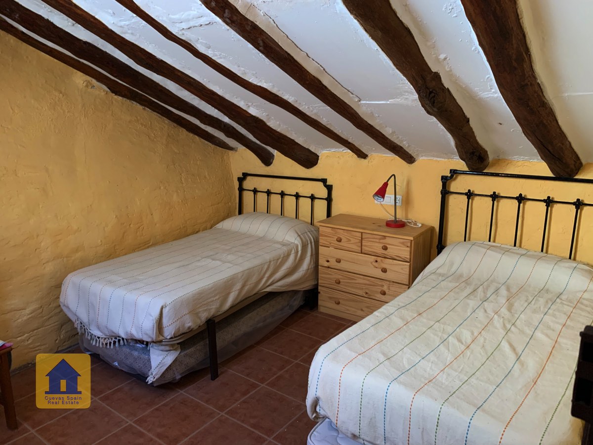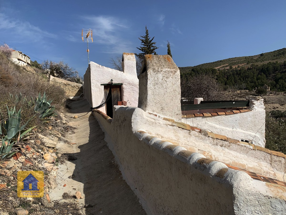 L'accès à la propriété se fait par une étroite route pavée et un chemin de terre. Le long du chemin, on trouve des figuiers et des vignes. Une allée mène au patio avant qui a une tonnelle couverte de plantes. Depuis le patio, vous pouvez entrer dans une salle de stockage, une grande salle de jeu avec des fenêtres, la maison principale ou la cuisine. L'entrée principale mène au salon, avec sa cheminée et son plafond en poutres de bois. Un couloir mène à la salle de bains, à l'étage aux chambres, et au bout se trouve la cuisine qui s'ouvre sur le patio. À l'étage, une chambre double a une fenêtre arrière, et la grande chambre principale a une grande terrasse avec de magnifiques vues à 360º. La maison a besoin d'une mise à jour mais elle est vivable en l'état. La maison est vendue en grande partie meublée, une partie est négociable.